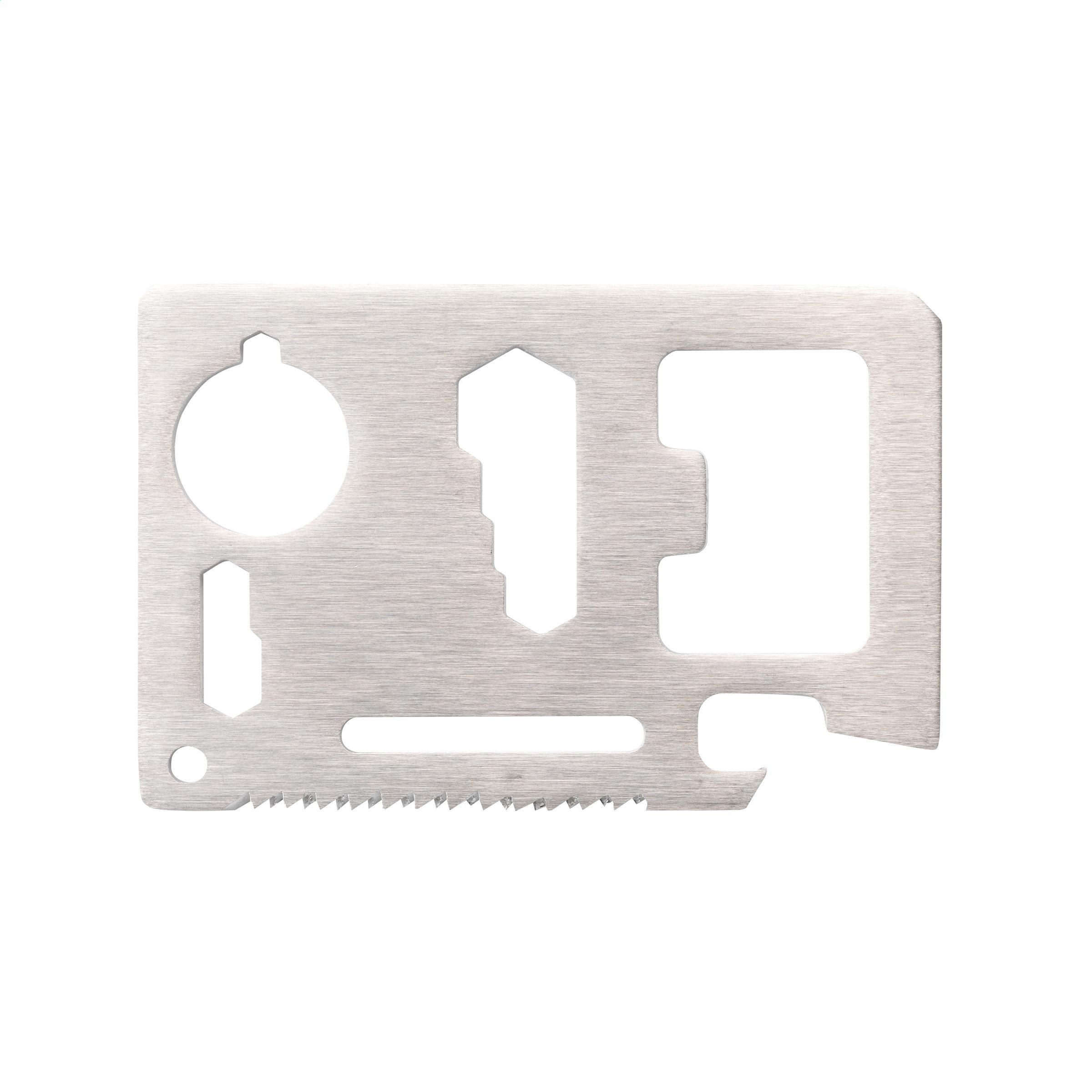 Multitool aus Edelstahl in Kreditkartenformat mit 11 Funktionen: Dosenöffner, Schraubenzieher, Lineal, Kapselheber, Schraubenschlüssel, Flügelzange, Säge, Winkelmesser, 2-seitiger Schraubenschlüssel und Schlüsselanhänger. In einem Etui aus Imitatleder. Inklusive Gebrauchsanweisung.