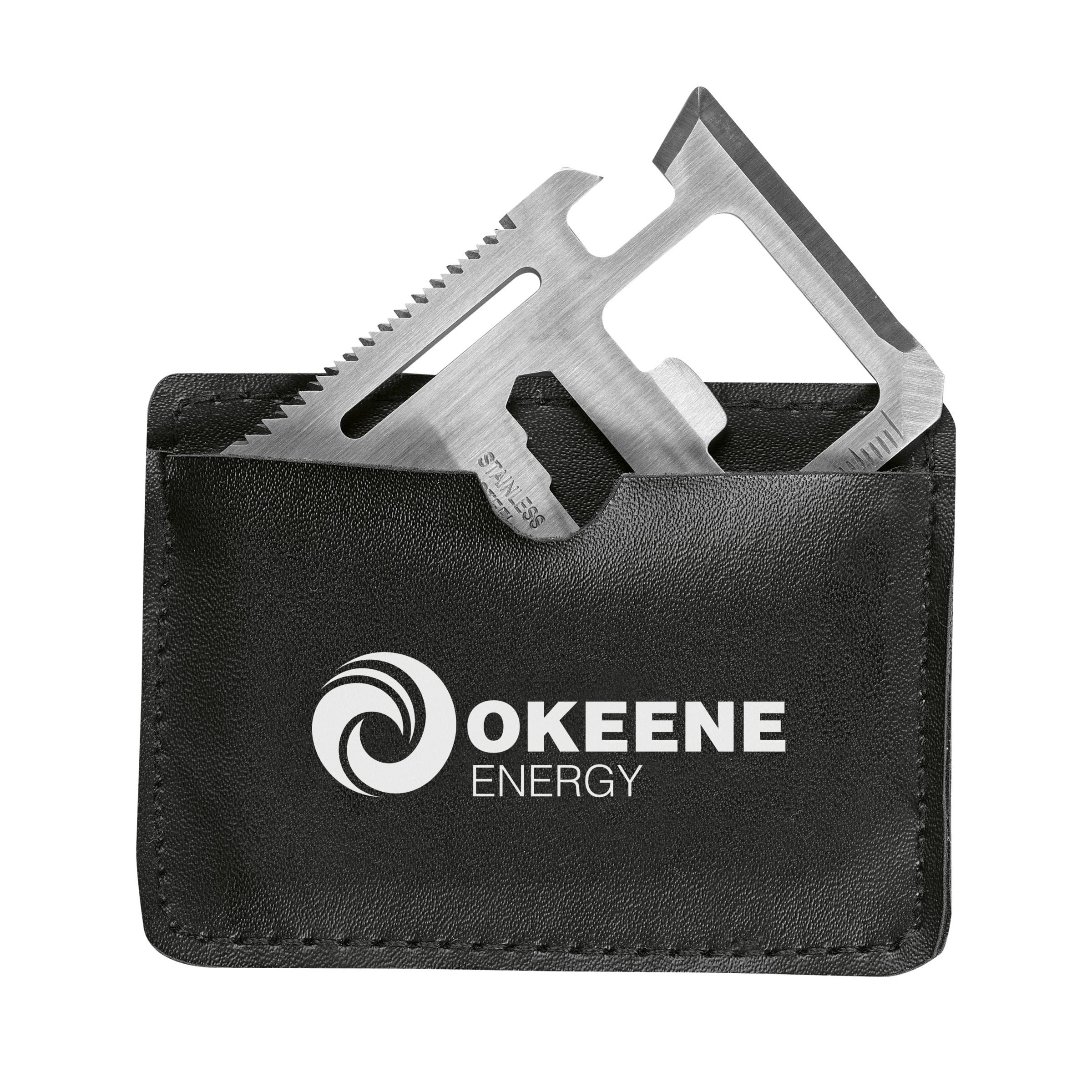 Multitool aus Edelstahl in Kreditkartenformat mit 11 Funktionen: Dosenöffner, Schraubenzieher, Lineal, Kapselheber, Schraubenschlüssel, Flügelzange, Säge, Winkelmesser, 2-seitiger Schraubenschlüssel und Schlüsselanhänger. In einem Etui aus Imitatleder. Inklusive Gebrauchsanweisung.