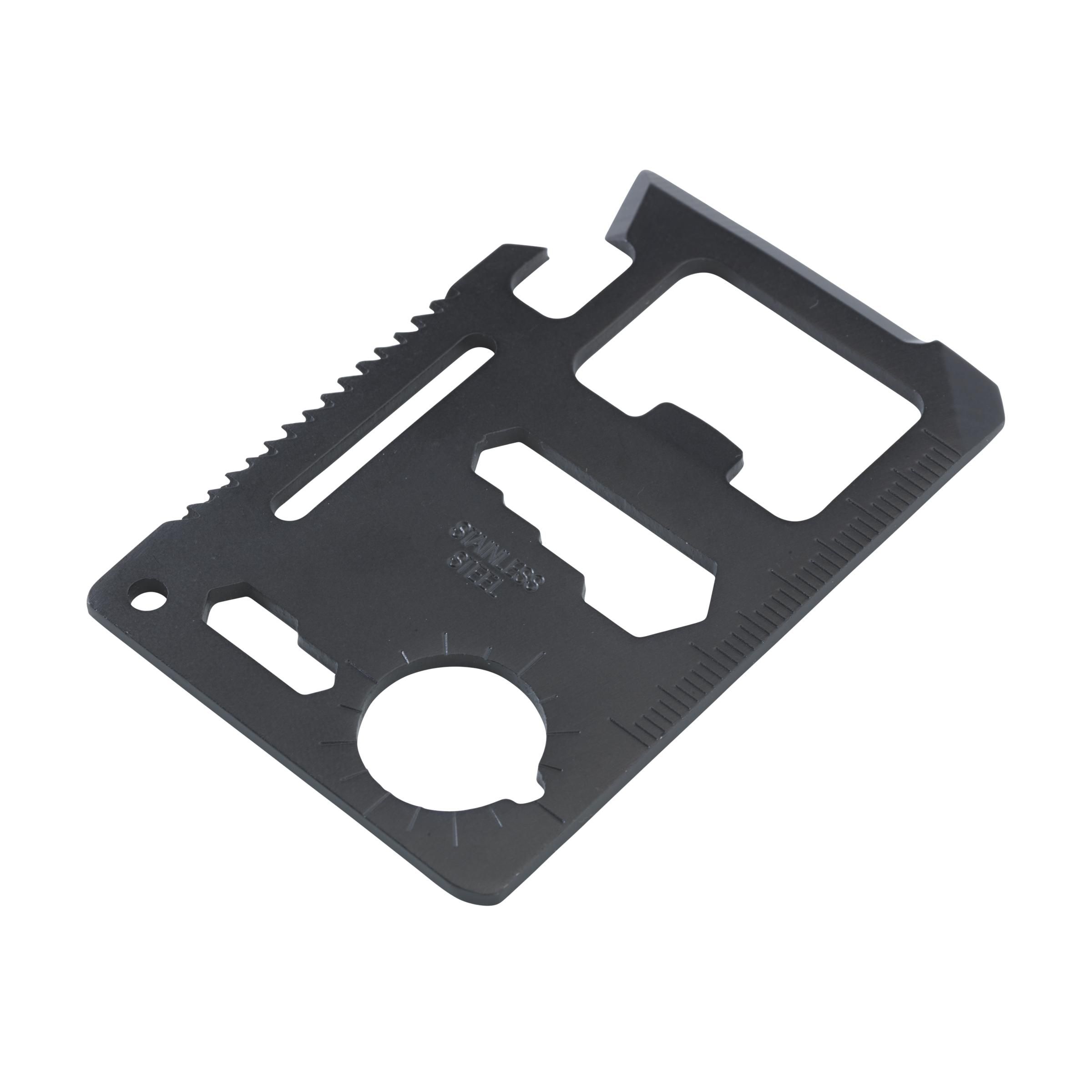 Multitool aus Edelstahl in Kreditkartenformat mit 11 Funktionen: Dosenöffner, Schraubenzieher, Lineal, Kapselheber, Schraubenschlüssel, Flügelzange, Säge, Winkelmesser, 2-seitiger Schraubenschlüssel und Schlüsselanhänger. In einem Etui aus Imitatleder. Inklusive Gebrauchsanweisung.