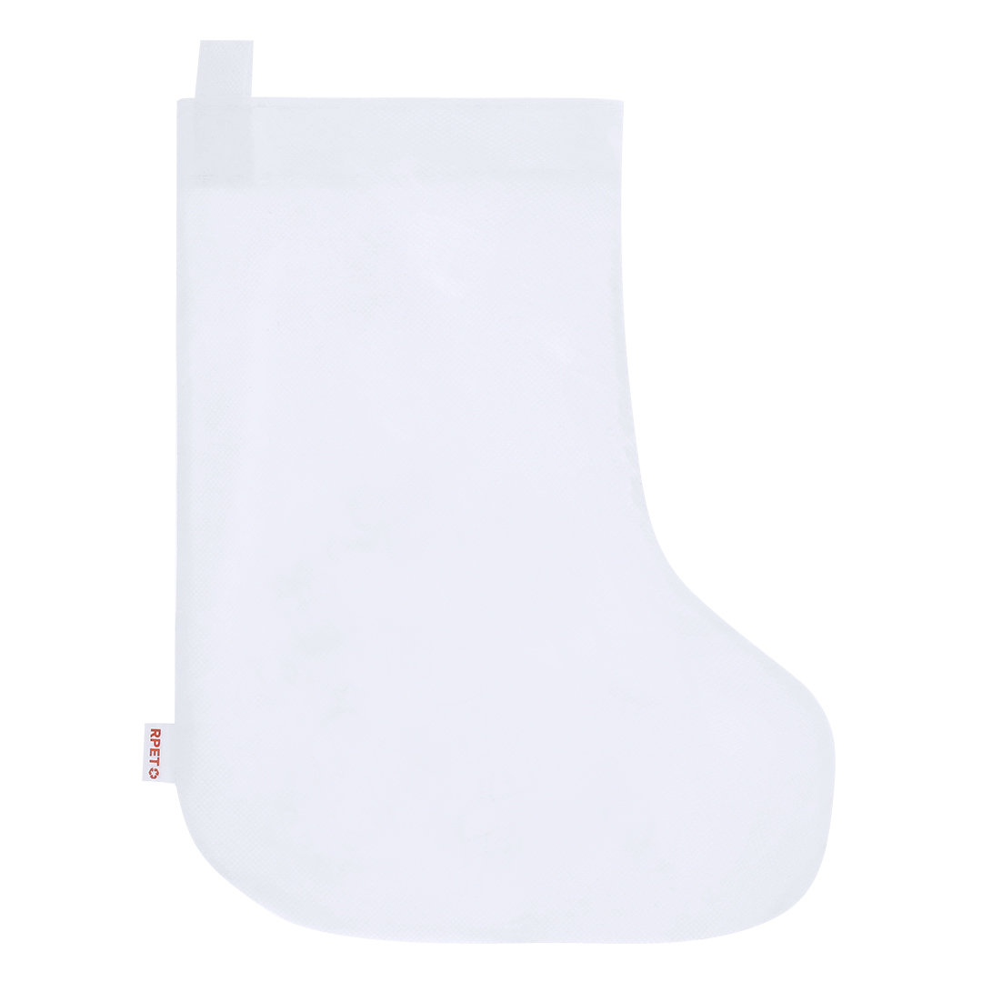 RPET-Vliesstoffsocke in Weiß, speziell zum Ausmalen mit Buntstiften. Vorderseite mit lustigen Weihnachtsmotiven, einschließlich 5 Buntstiften in verschiedenen Farben. Mit Aufhängeschleife, hitzeversiegelt. RPET-Etikett außen. RPET-Material besteht aus recyceltem Kunststoff, fördert somit die Wiederverwendung von Plastikabfällen und trägt zur Nachhaltigkeit des Planeten bei.