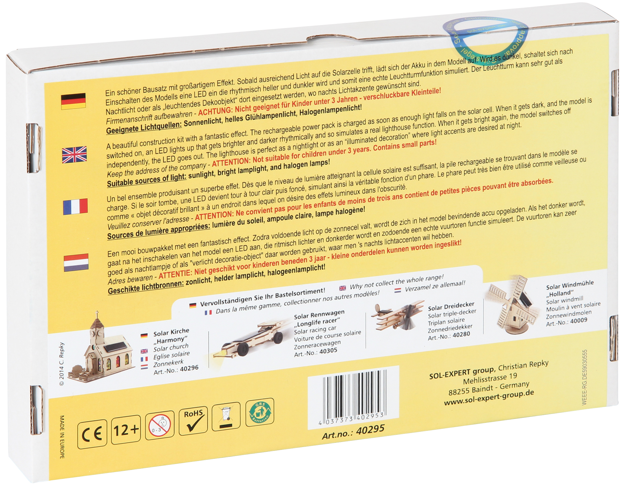 Ein schöner Bausatz mit großartigem Effekt. Sobald genügend Licht auf die Solarzelle trifft, lädt sich der Akku in dem Modell auf. Wird es dunkel, schaltet sich nach Einschalten des Modells eine LED ein, die rhythmisch heller und dunkler wird und somit eine echte Leuchtturmfunktion simuliert. Der Leuchtturm kann sehr gut als Nachtlicht oder als leuchtendes Dekoobjekt dort eingesetzt werden, wo nachts Lichtakzente gewünscht sind. Höhe: 20 cm. (Hinweise zur Batterieentsorgung liegen der Warensendung bei, oder vorab abzurufen, unter: http://1111ideen. de / content/25-Batterie-Hinweis)