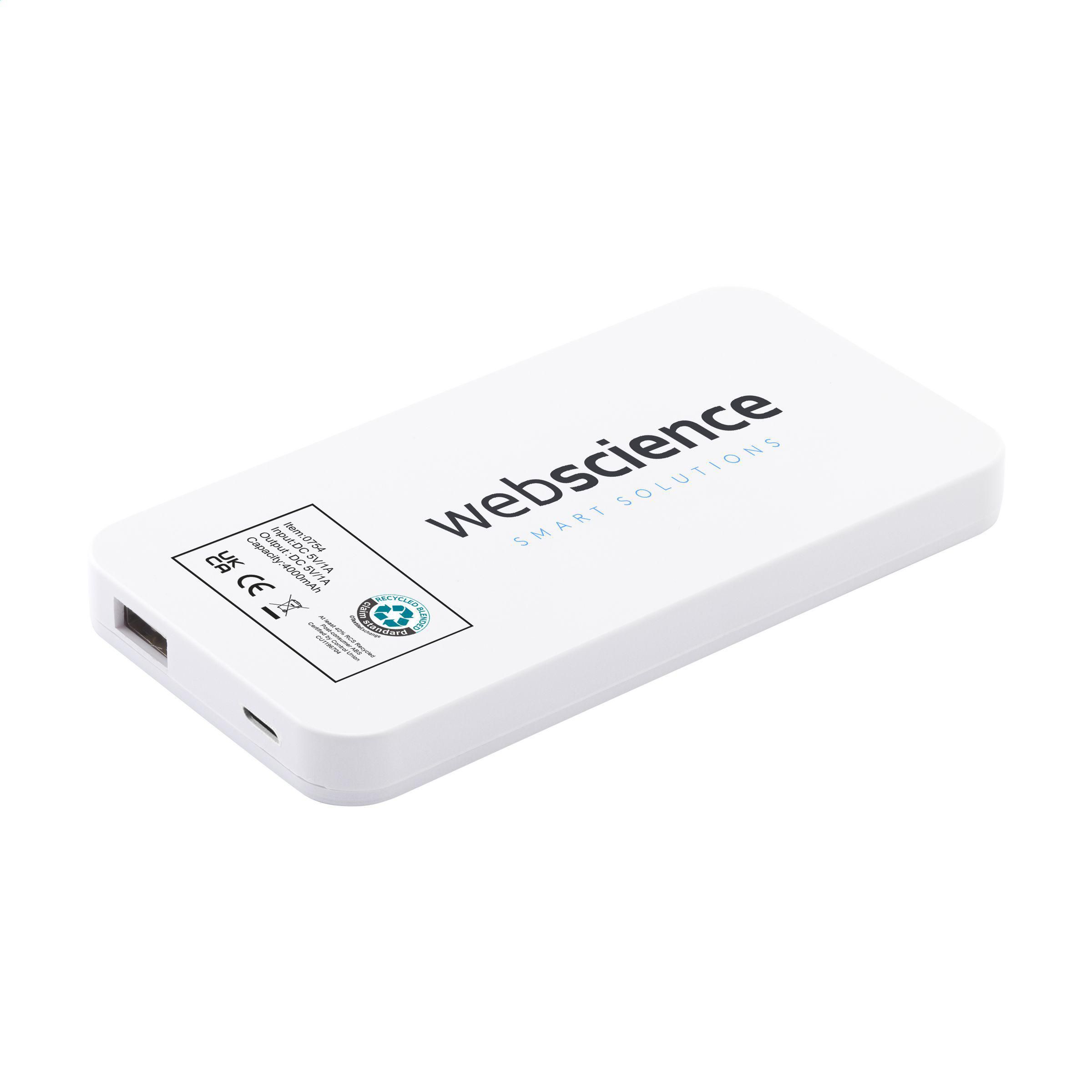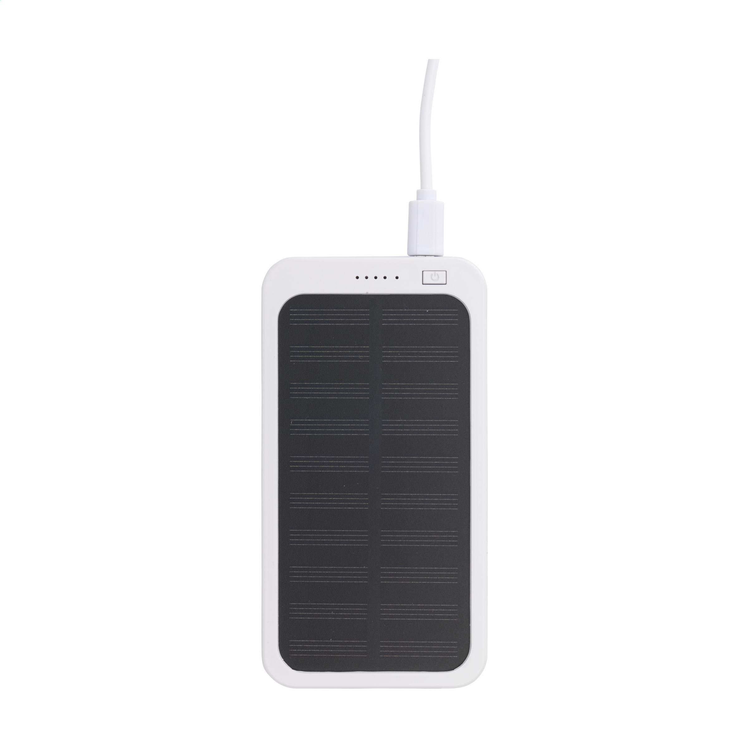 Leistungsstarkes Notladegerät mit hoher Ladekapazität mit Solarmodul und eingebautem wiederaufladbarem Polymerakku (4000 mAh). Kann mit Solarenergie oder Netzstrom (über USB-Anschluss) aufgeladen werden. Das Gehäuse ist aus recyceltem ABS gefertigt. Eingang: 5V/1A. Ausgang: 5V/1A. Inklusive Ladekabel mit USB-C-Anschluss, USB-C-Stecker und Gebrauchsanweisung. RCS-zertifiziert. Gesamtes recyceltes Material: 40%.