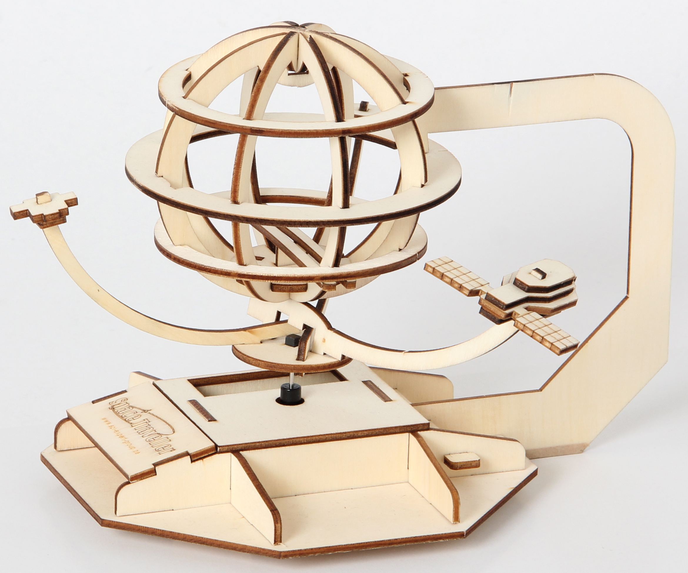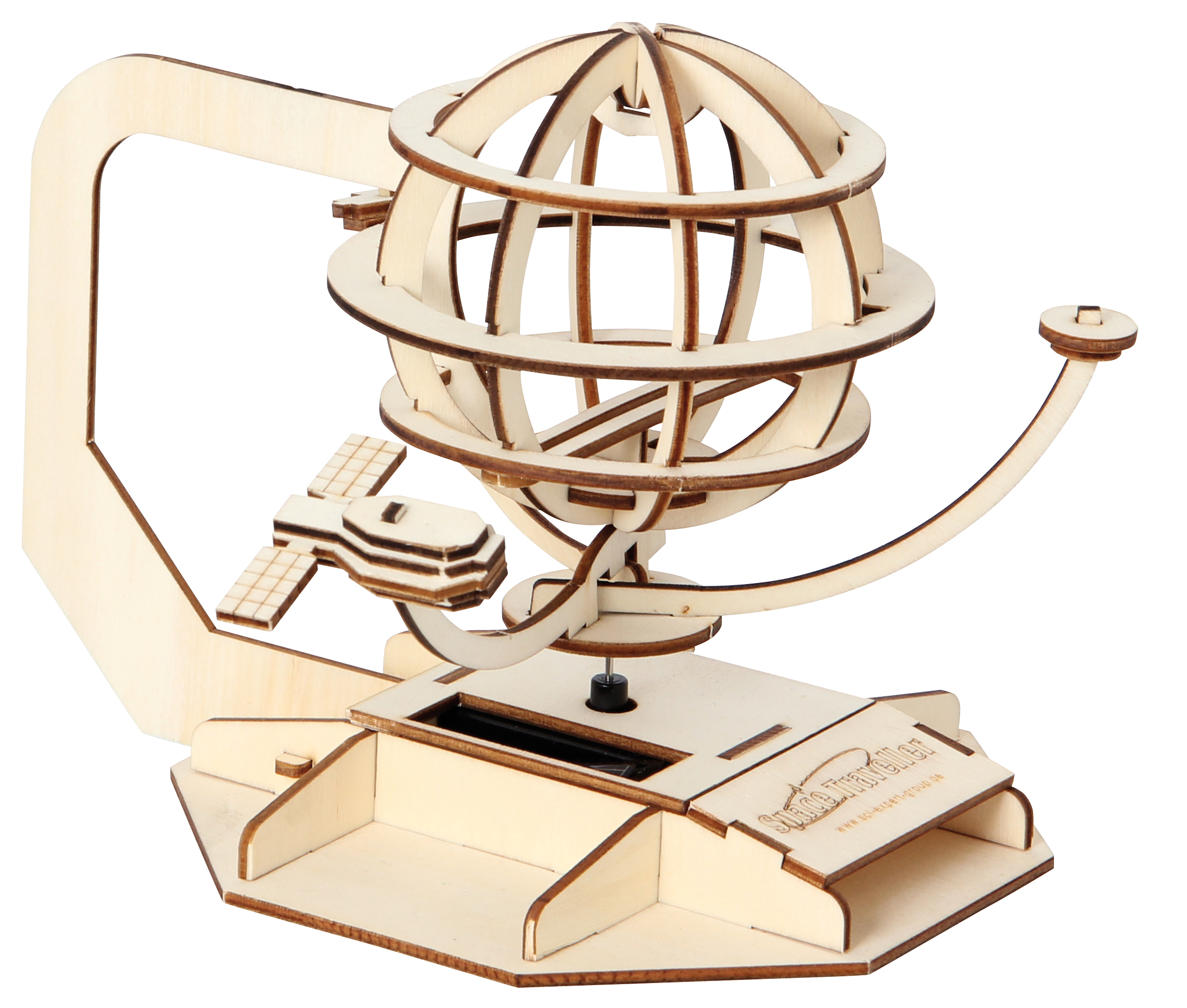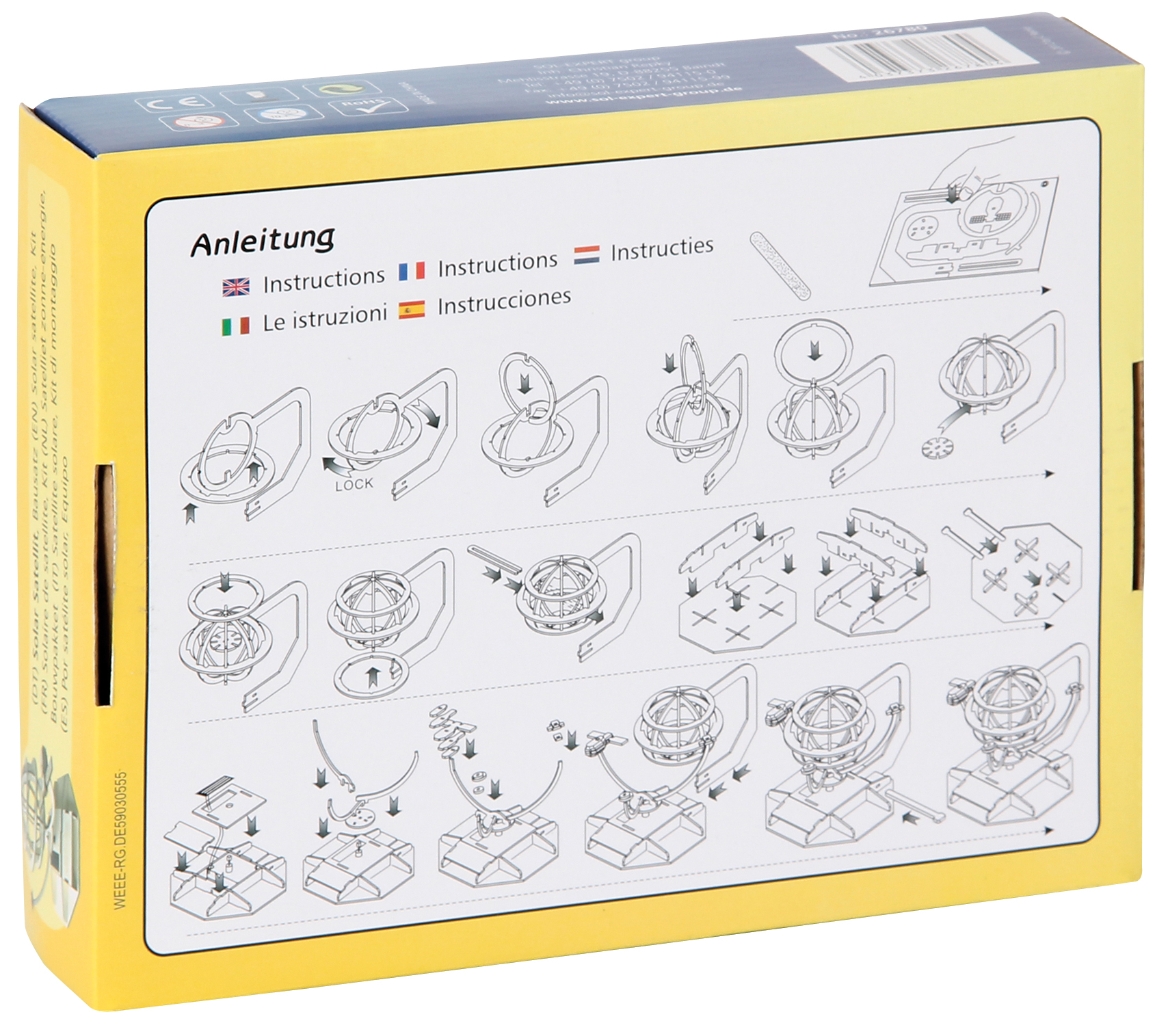 Aus 42 Holzteilen und einem Solarmodul wird ein ca. 23 x 22,5 x 16 cm großer Satellit zusammengesetzt. Das macht Spaß und schult die kognitven Fähigkeiten der Kids. (Hinweise zur Batterieentsorgung liegen der Warensendung bei, oder vorab abzurufen, unter: http://1111ideen. de / content/25-Batterie-Hinweis)