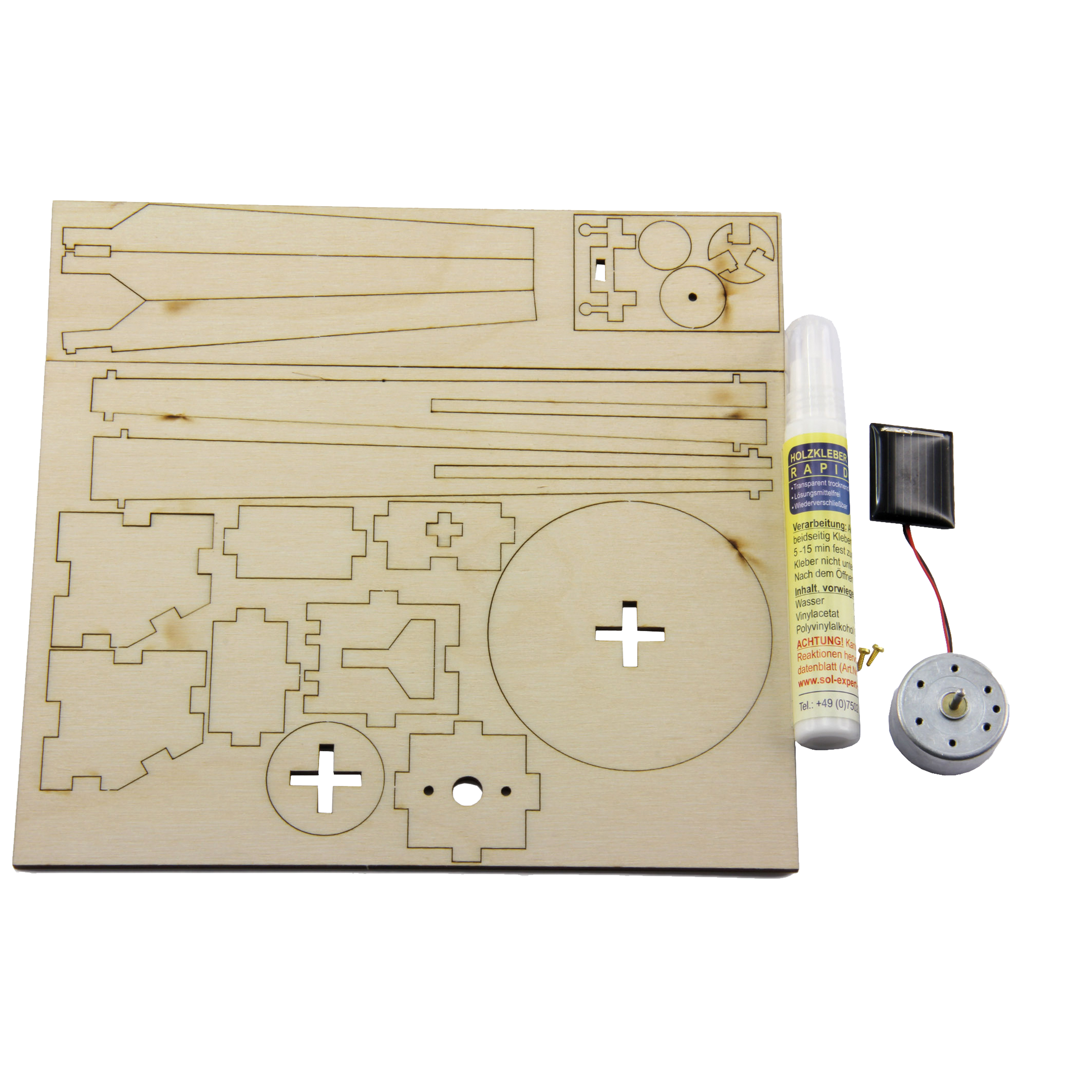 Der Bausatz wird ganz einfach zusammengesteckt. Die lasergeschnittenen Holzteile sind super gearbeitet und geben dem Modell eine sehr robuste Stabilität. Mit der Solarzelle und dem Motor können später auch eigene Modelle realisiert werden. Ihrer Phantasie sind keine Grenzen gesetzt! (Hinweise zur Batterieentsorgung liegen der Warensendung bei, oder vorab abzurufen, unter: http://1111ideen. de / content/25-Batterie-Hinweis)