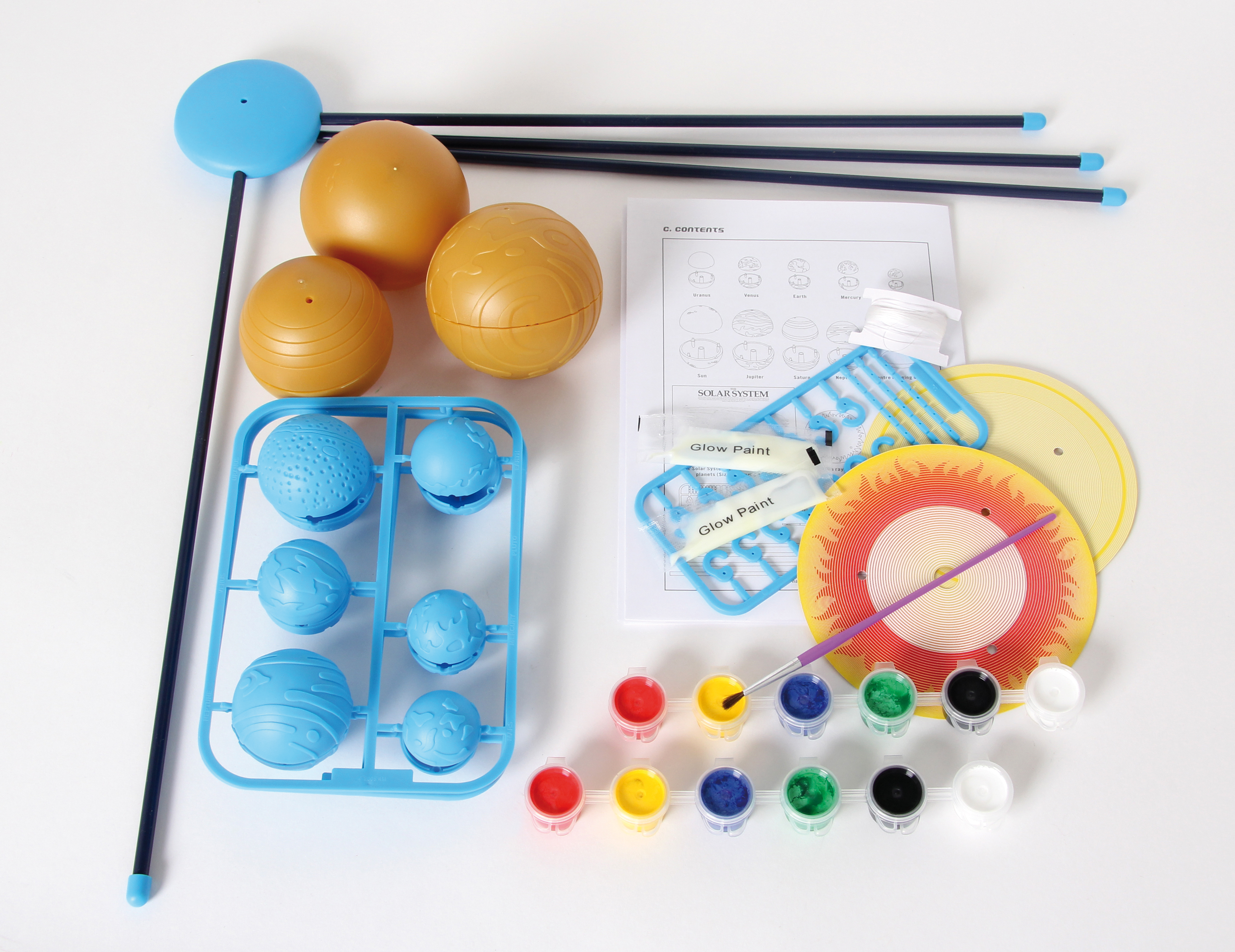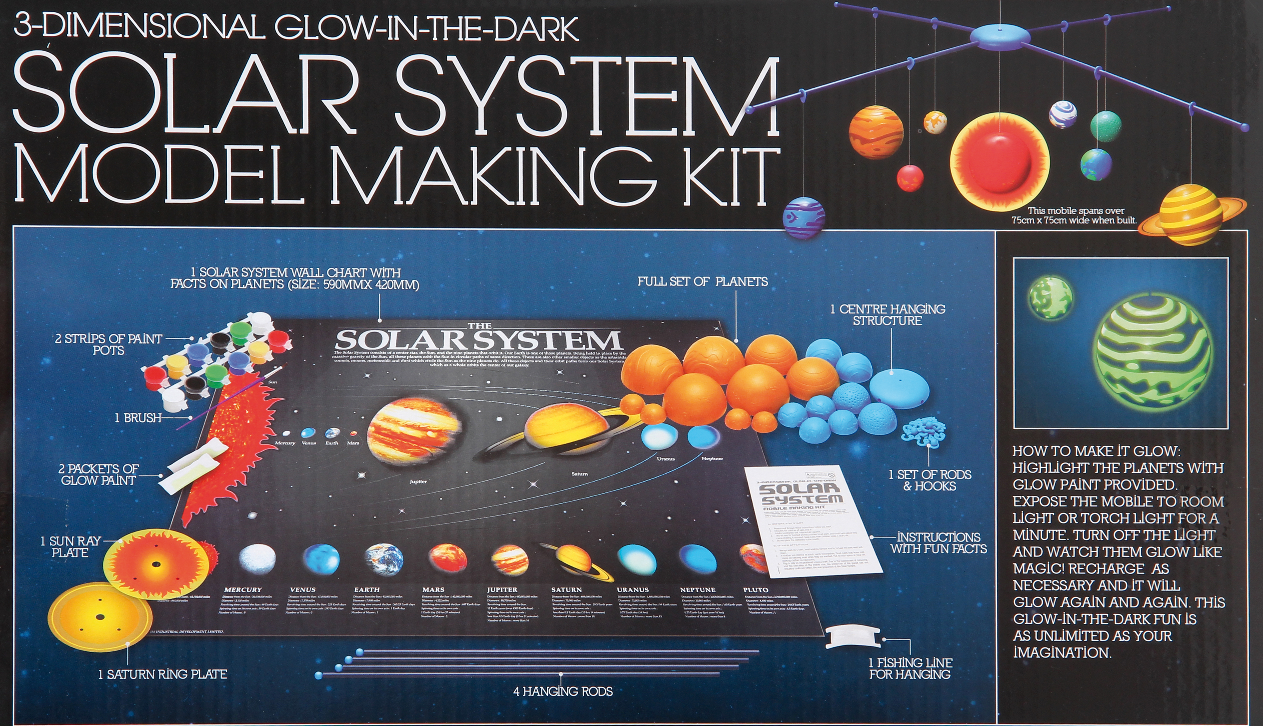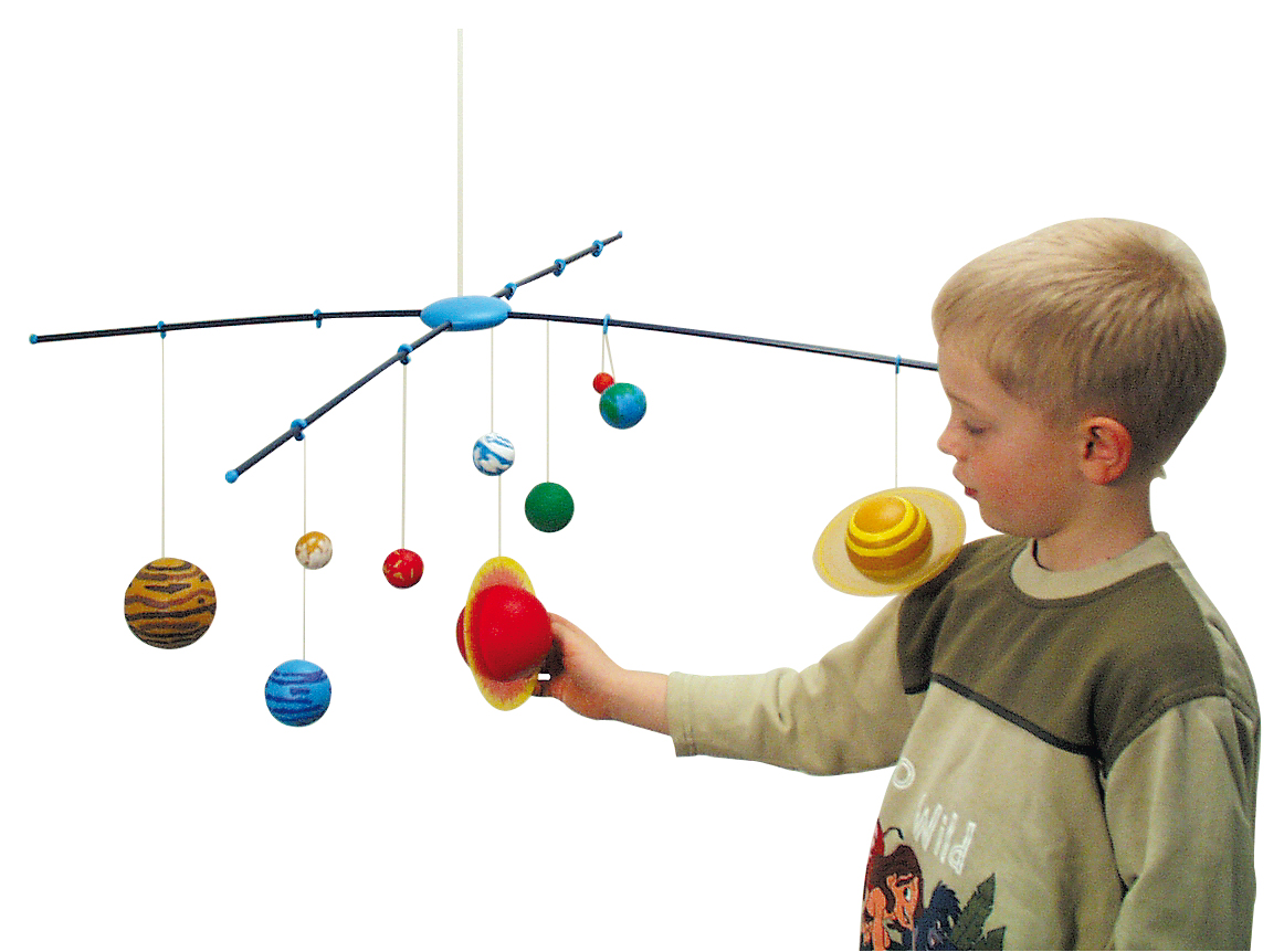 Damit basteln Kids ein dreidimensionales Sonnensystem-Mobile fürs Kinderzimmer. Zehn Kunststoffkugeln werden bemalt und zum Sonnensystem-Mobile zusammengebaut. Setzt man das Mobile kurze Zeit dem Licht aus, erstrahlen die Planeten im Dunkeln. Eine beiliegende Planetenkarte enthält viel Wissenswertes über die Himmelskörper.