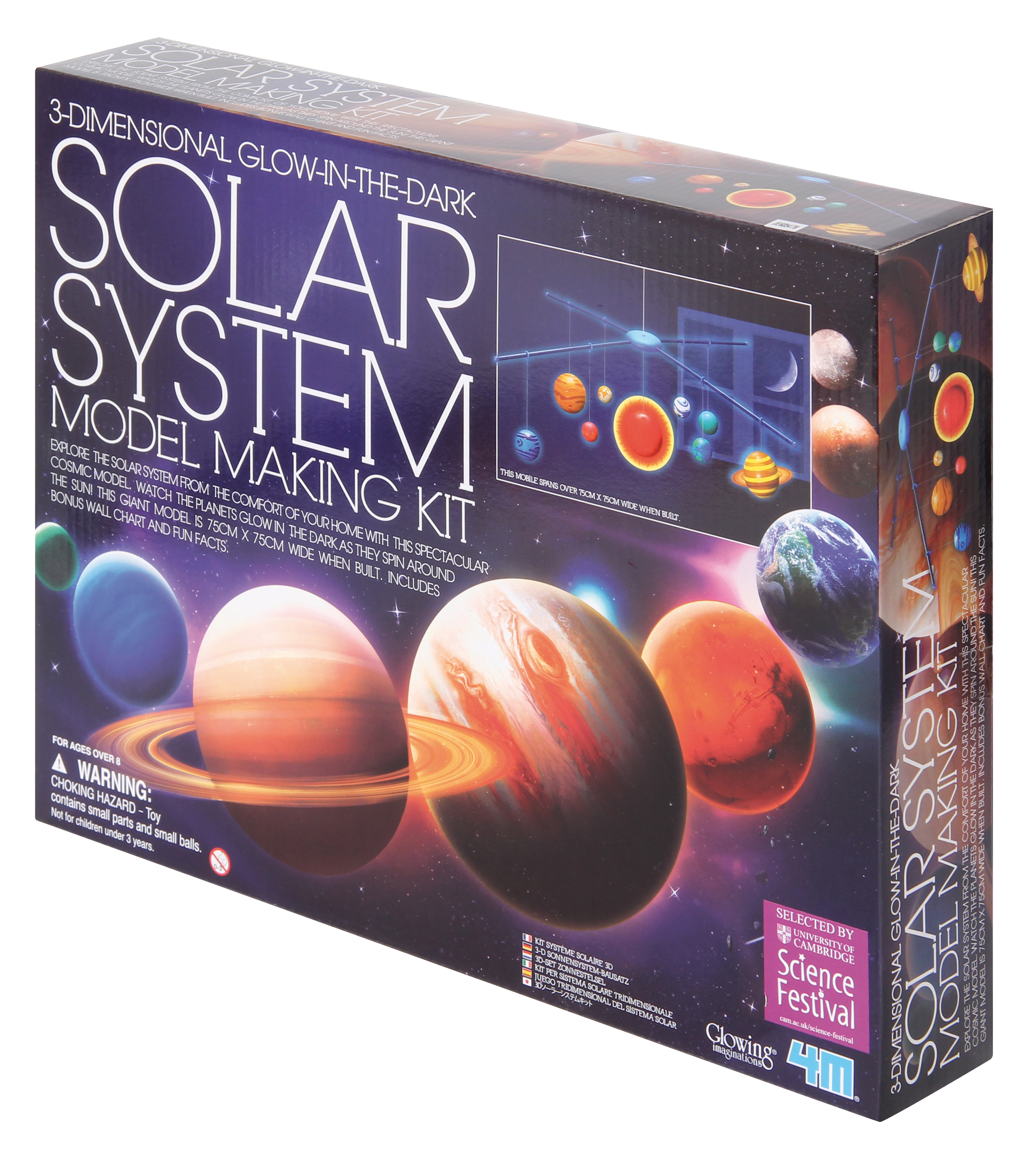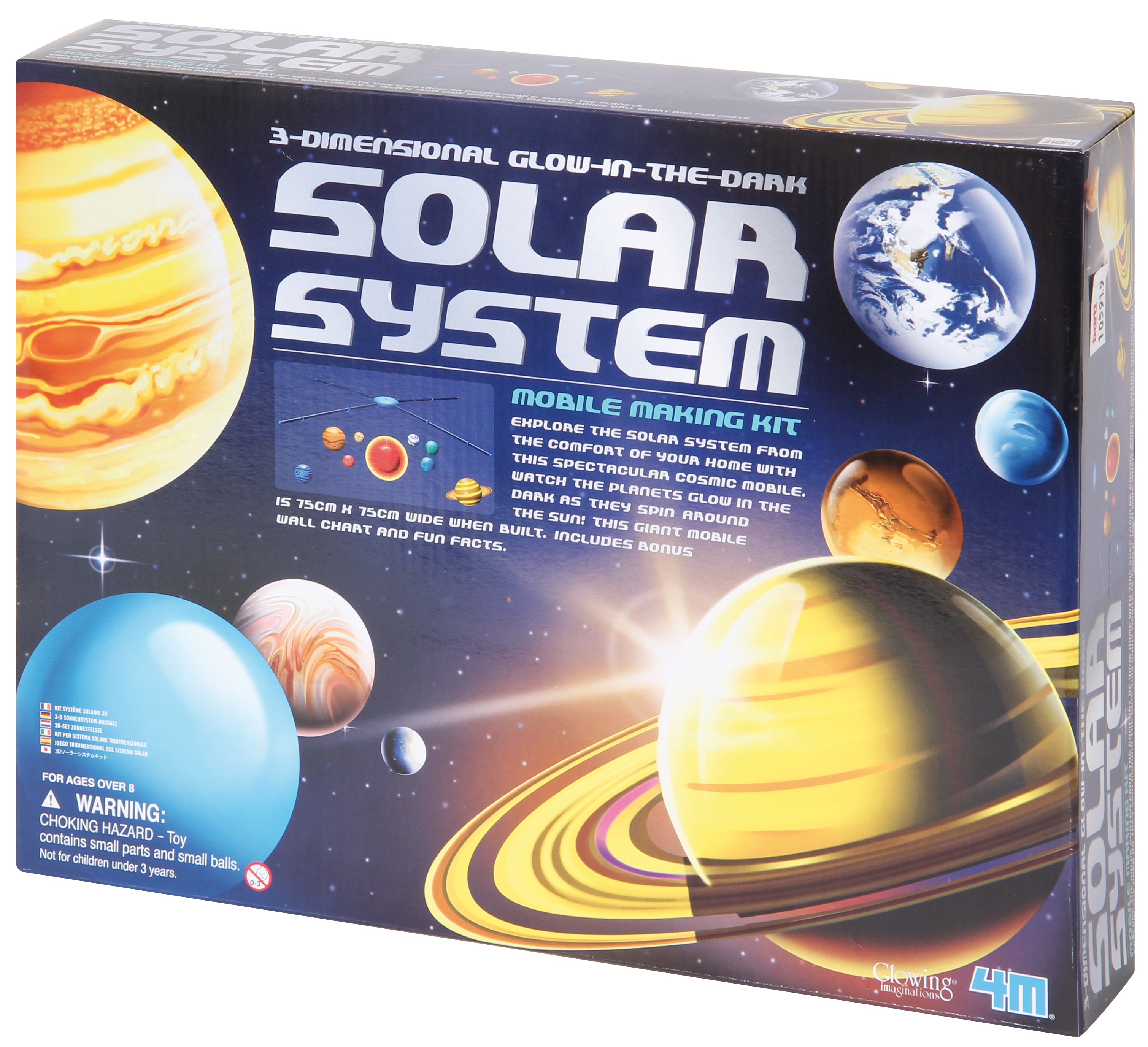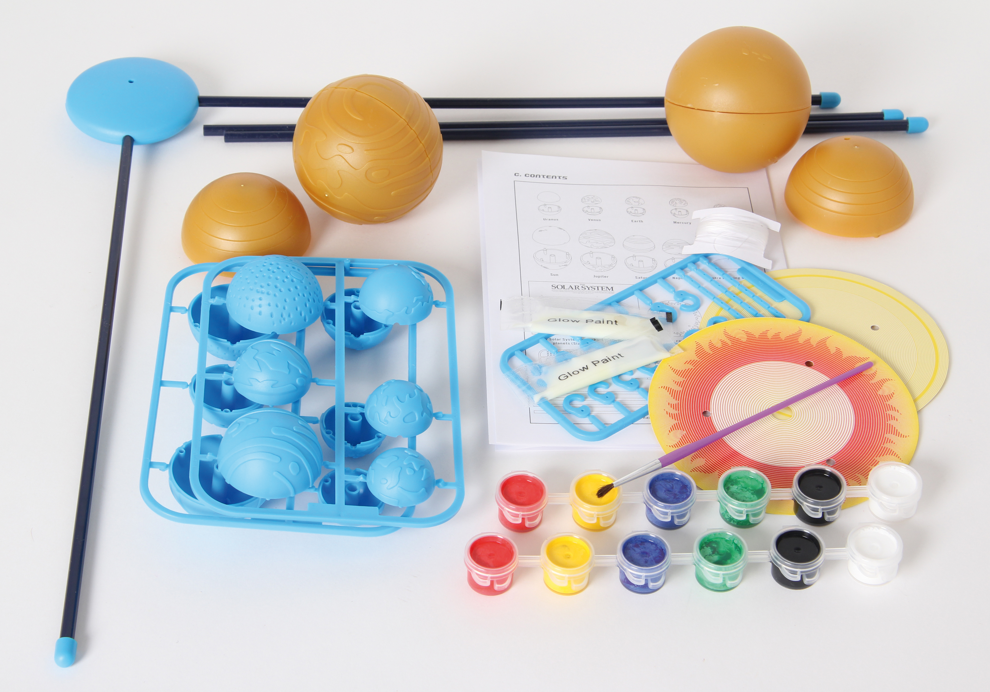 Damit basteln Kids ein dreidimensionales Sonnensystem-Mobile fürs Kinderzimmer. Zehn Kunststoffkugeln werden bemalt und zum Sonnensystem-Mobile zusammengebaut. Setzt man das Mobile kurze Zeit dem Licht aus, erstrahlen die Planeten im Dunkeln. Eine beiliegende Planetenkarte enthält viel Wissenswertes über die Himmelskörper.
