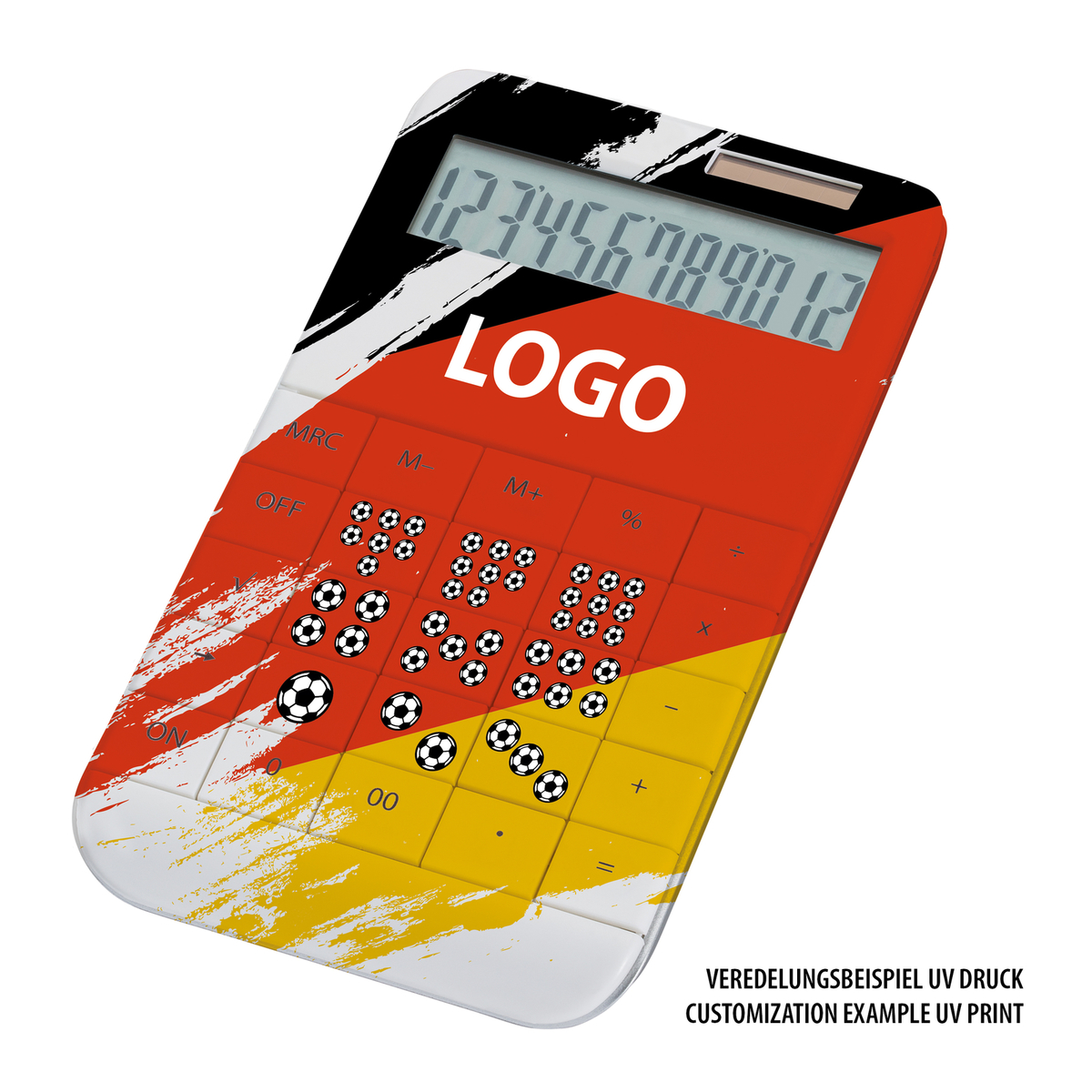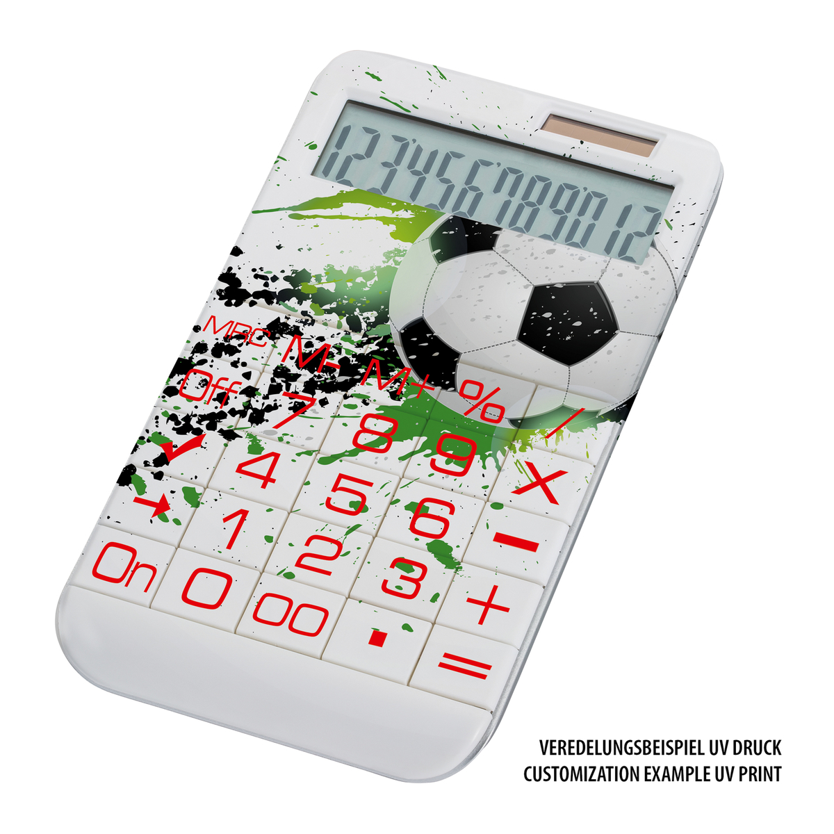 Mehr geht nicht: Vollflächige Bedruckung mit REFLECTS-UV-Print, komplett nach Ihren Vorstellungen mit absolut individuellem Design und wenig Aufwand! Fotorealistische Motive werden brillant und wirklichkeitstreu umgesetzt. Texte sind klar und deutlich lesbar. Die Tastatur des Dual-Power-Rechners wird im Layout mit angelegt. Vom Taschenrechner zum Ideenträger!