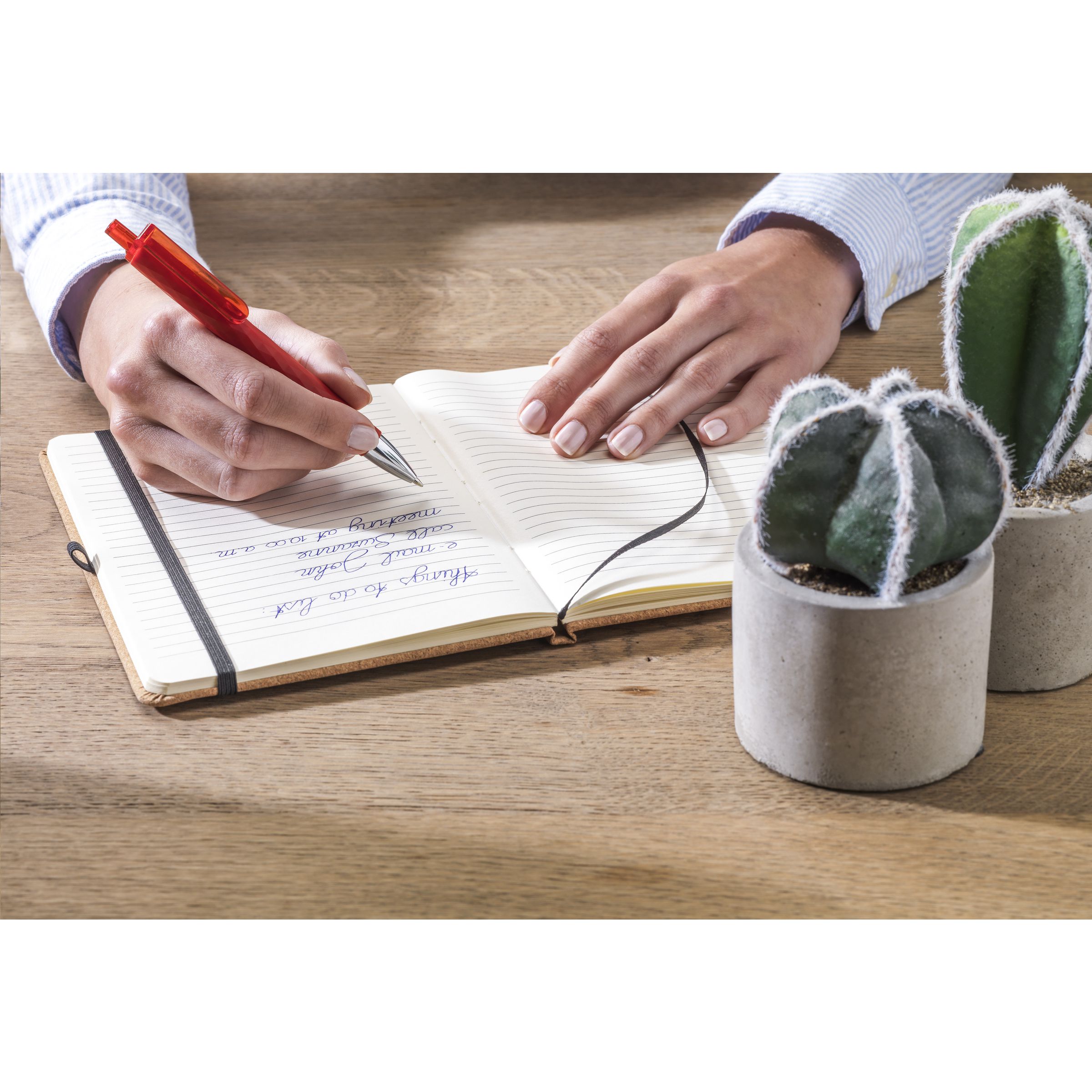 Beschreibung: Blauschreibender Stift mit transparentem Clip und Druckknopf. Der stabile Halter hat eine auffallende grafische 3D-Diamantpatrone.