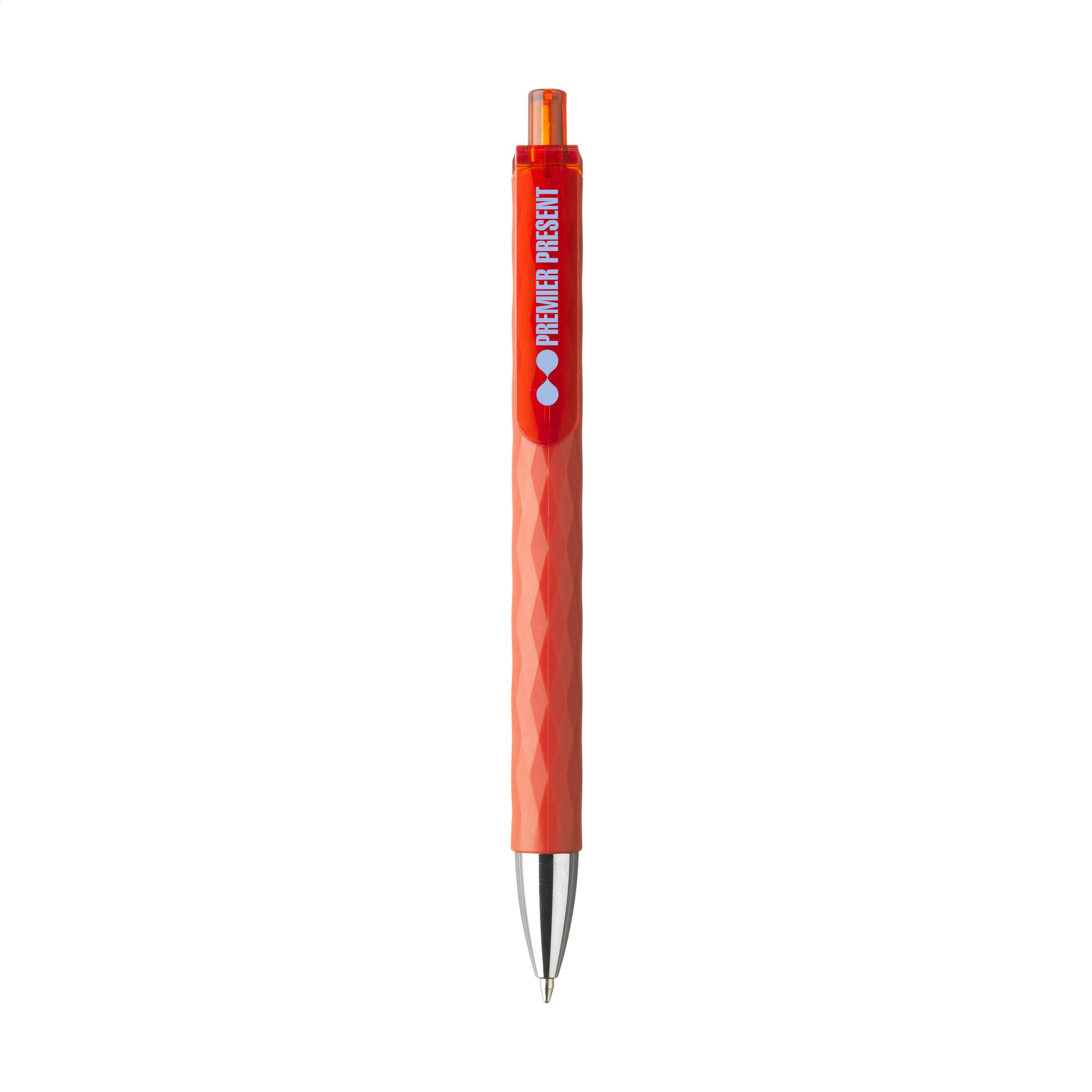 Beschreibung: Blauschreibender Stift mit transparentem Clip und Druckknopf. Der stabile Halter hat eine auffallende grafische 3D-Diamantpatrone.