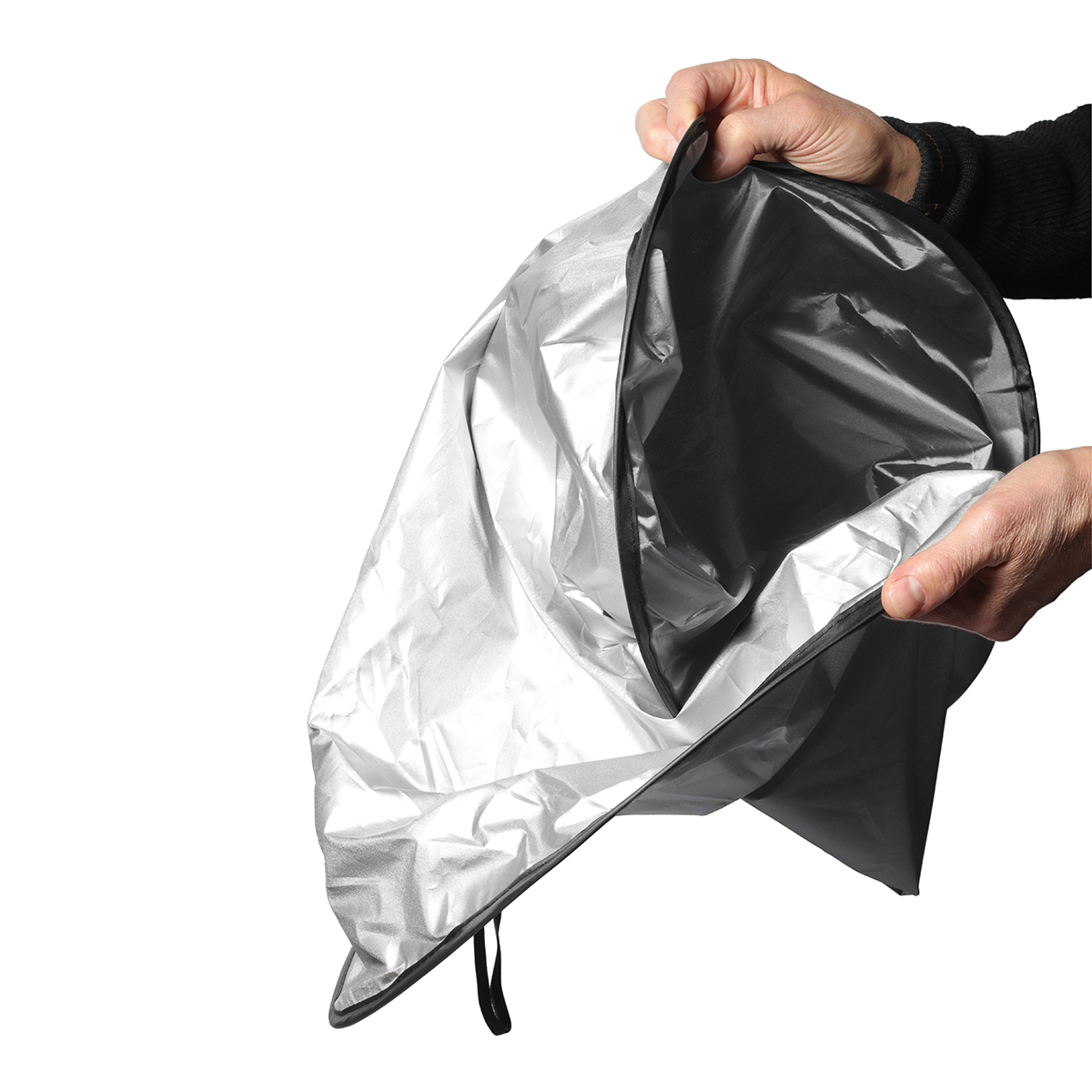 Sonnenblende faltbar, in platzsparender Tasche, mit zwei Stretchbändern zur einfachen Montage auf der Windschutzscheibe des Autos, aus 190T Polyester