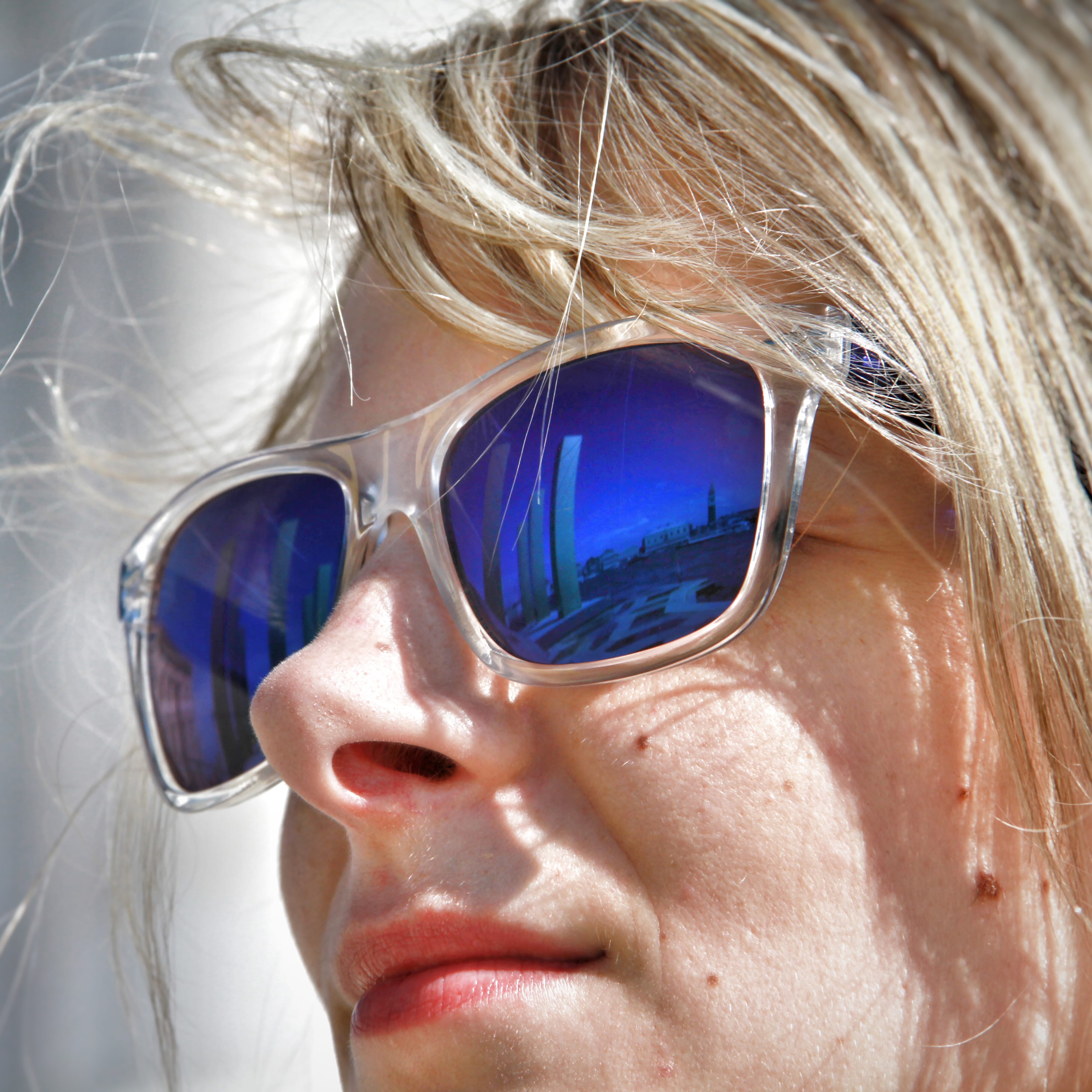 Ikonische Sonnenbrille mit transparentem Rahmen, die sowohl für Männer als auch für Frauen geeignet ist. Die Gläser sind mit einem UV400-Filter ausgestattet und schützen die Augen an hellen Sonnentagen.