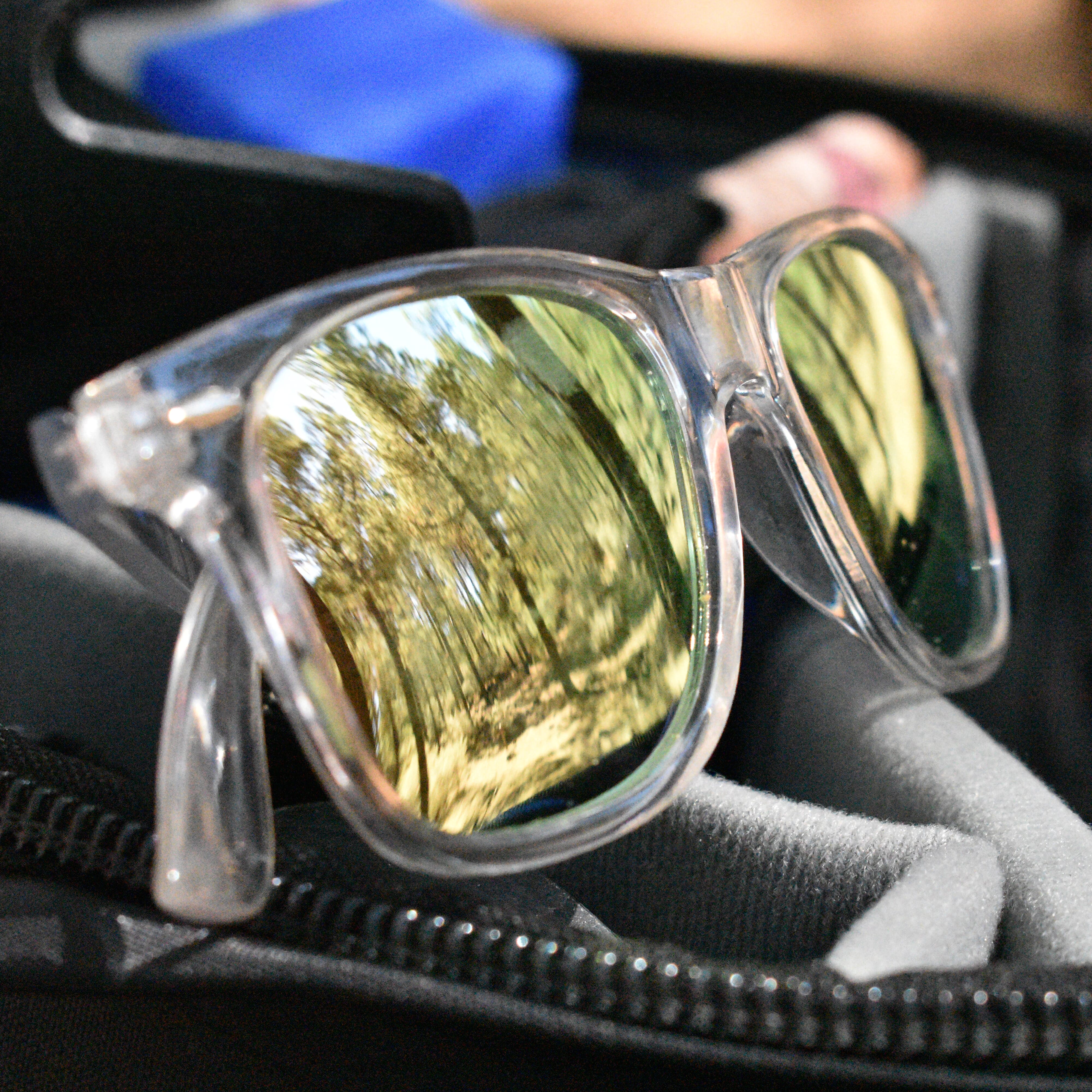 Ikonische Sonnenbrille mit transparentem Rahmen, die sowohl für Männer als auch für Frauen geeignet ist. Die Gläser sind mit einem UV400-Filter ausgestattet und schützen die Augen an hellen Sonnentagen.