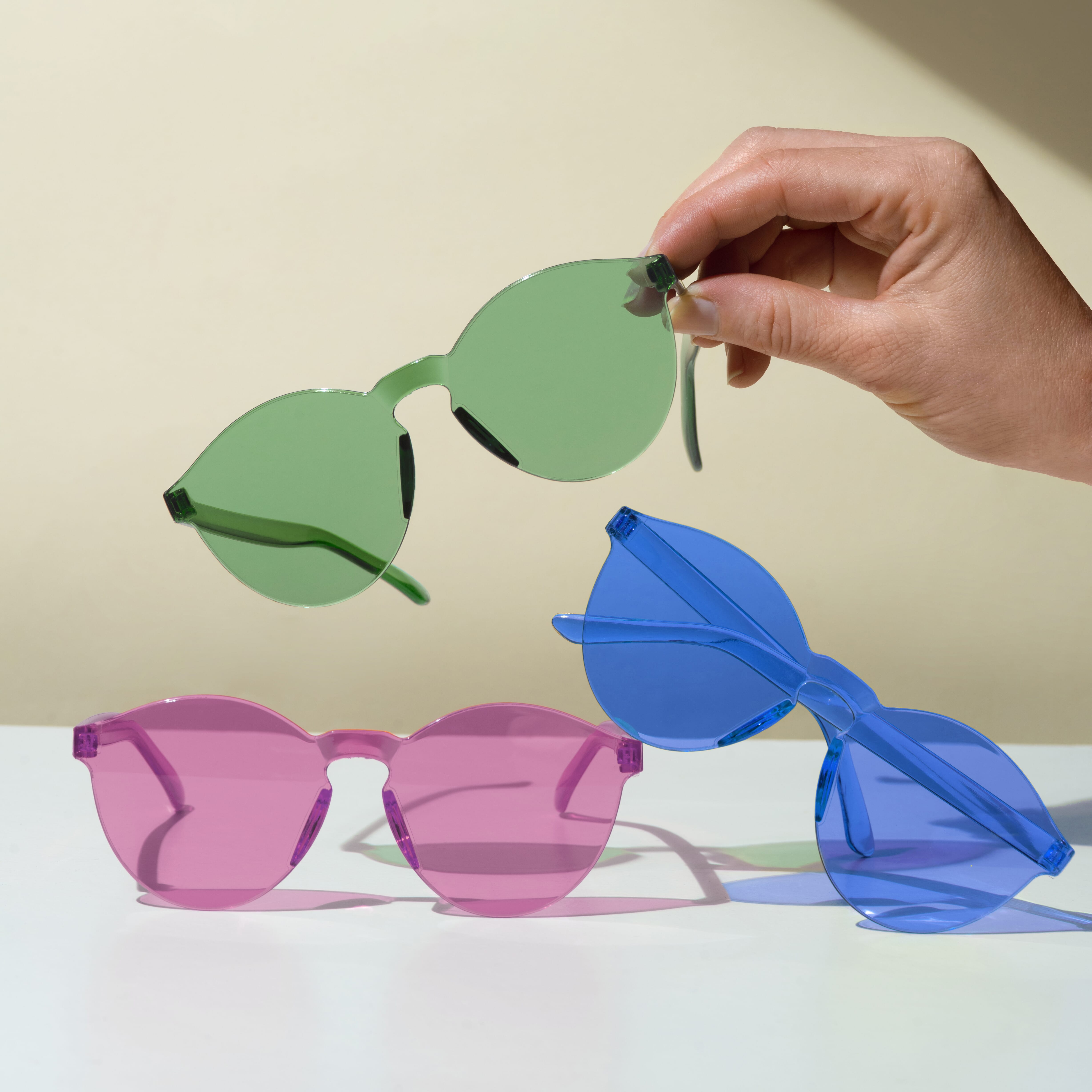 Helle Sonnenbrille im Retro-Stil mit durchgängig transparentem Rahmen und Glas in Pastelltönen. Die Gläser sind mit einem UV400-Filter versehen, was sie zum perfekten Accessoire für das Festivalgelände oder die Stadt macht.