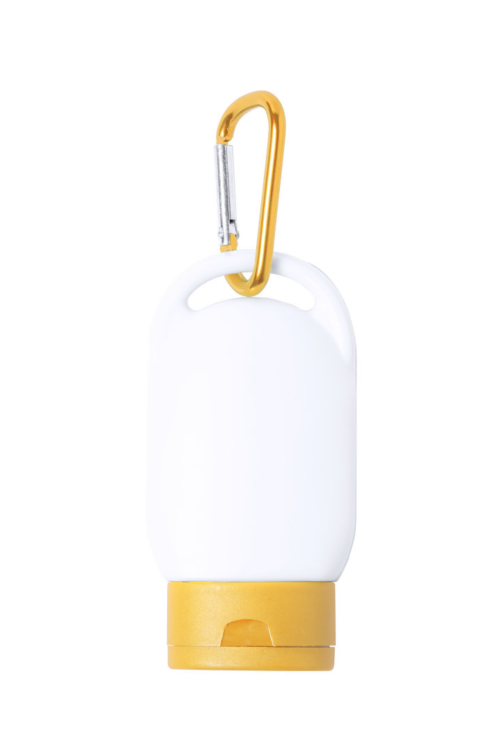 Sonnenschutzcreme Faktor 30. Präsentiert in einer praktischen 30ml-Flasche und mattierter Oberfläche. In vielen Farben erhältlich, mit passendem Transportkarabiner.