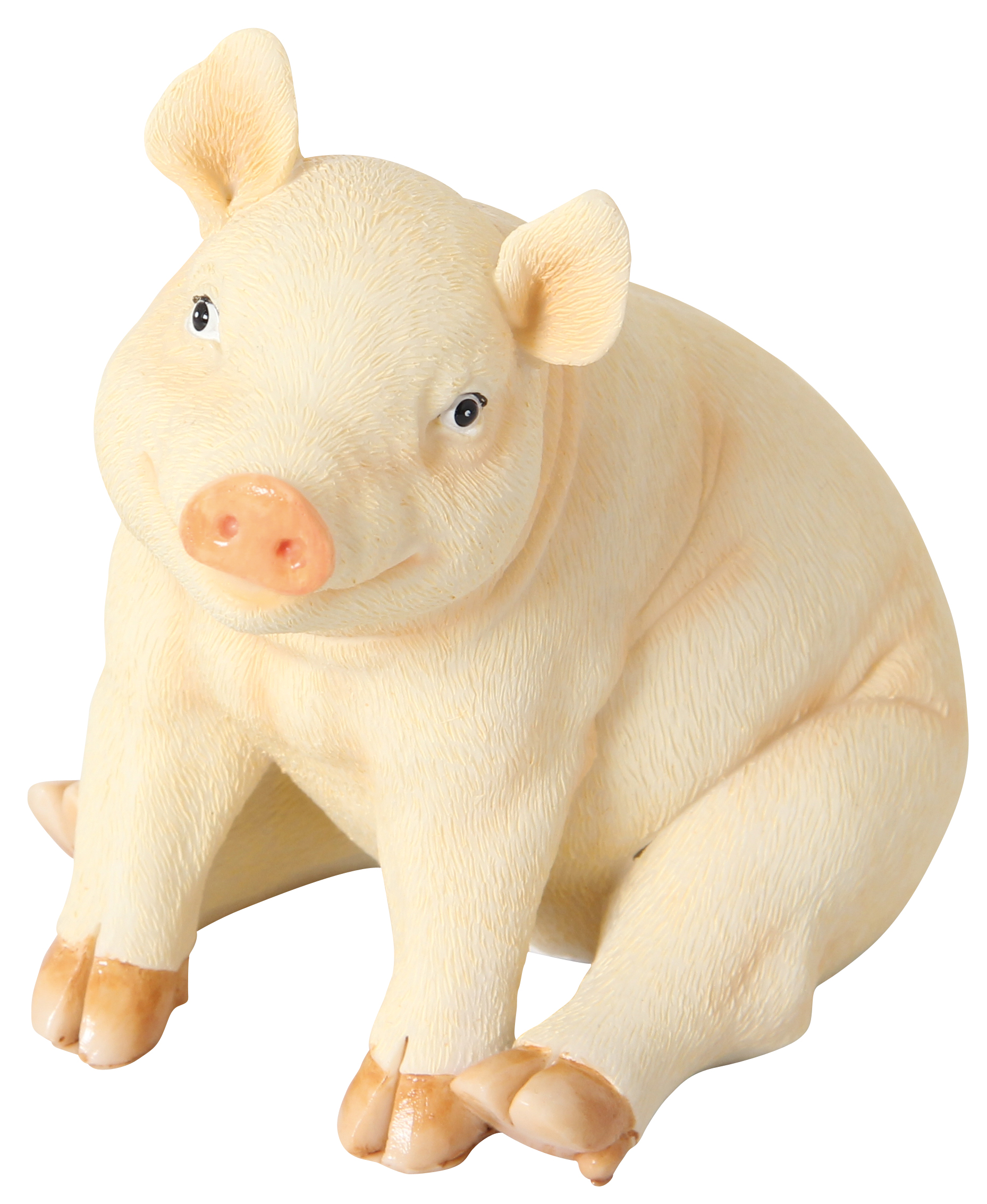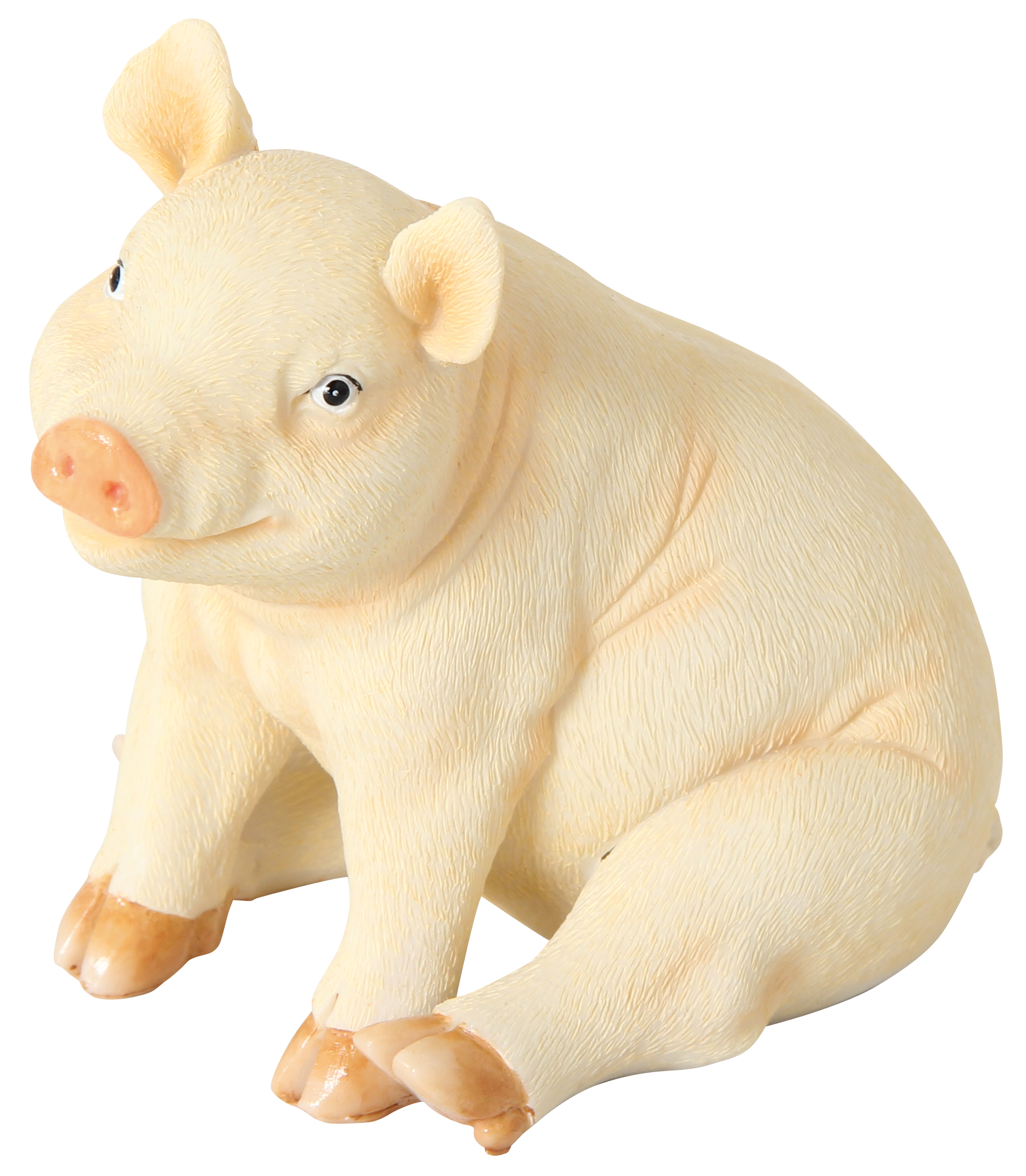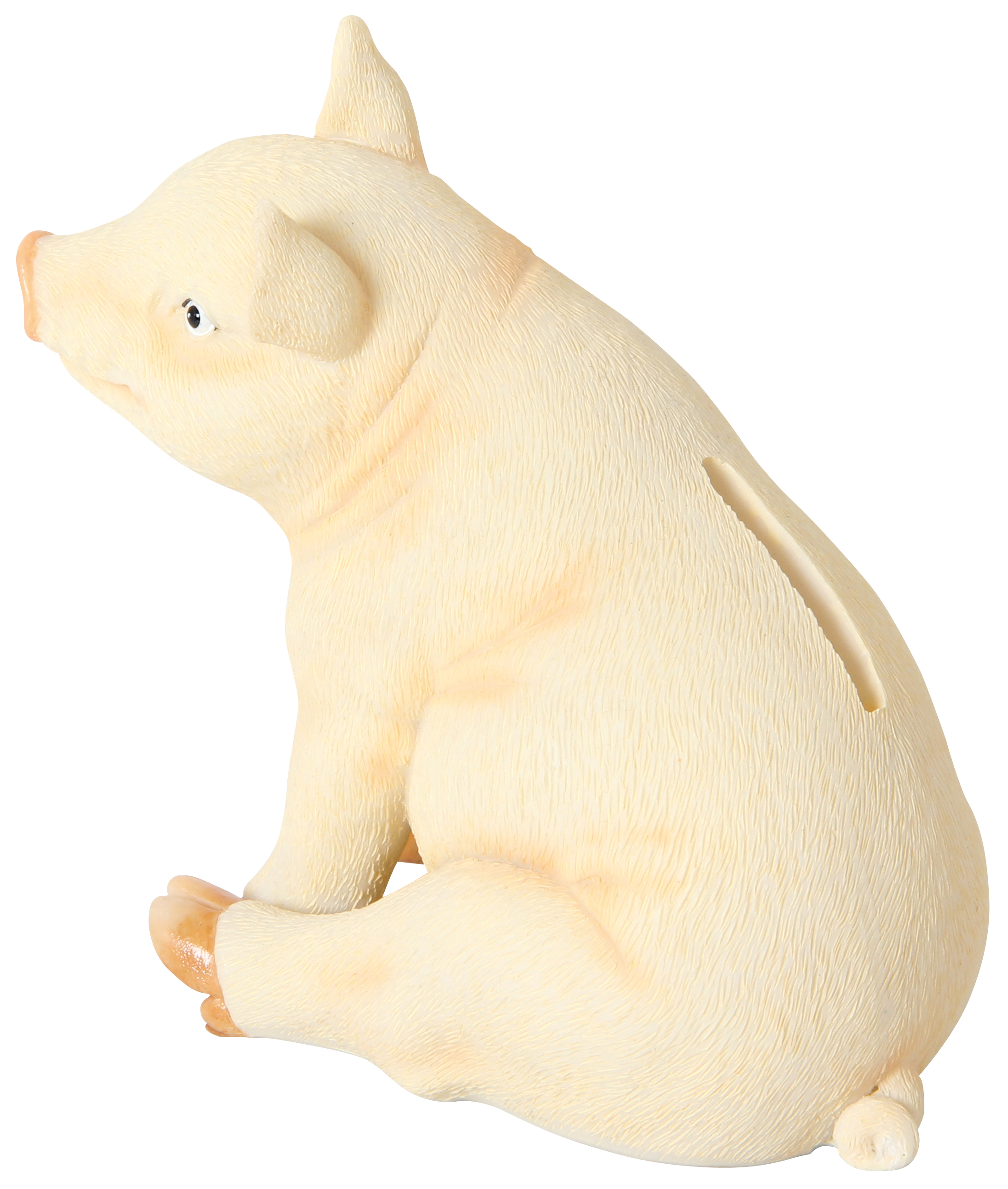 Niedliches Sparschwein aus Polyresin mit fein strukturierter, hautähnlicher Oberfläche. Wiederverschließbar nach Entleerung durch Plastikverschluß.