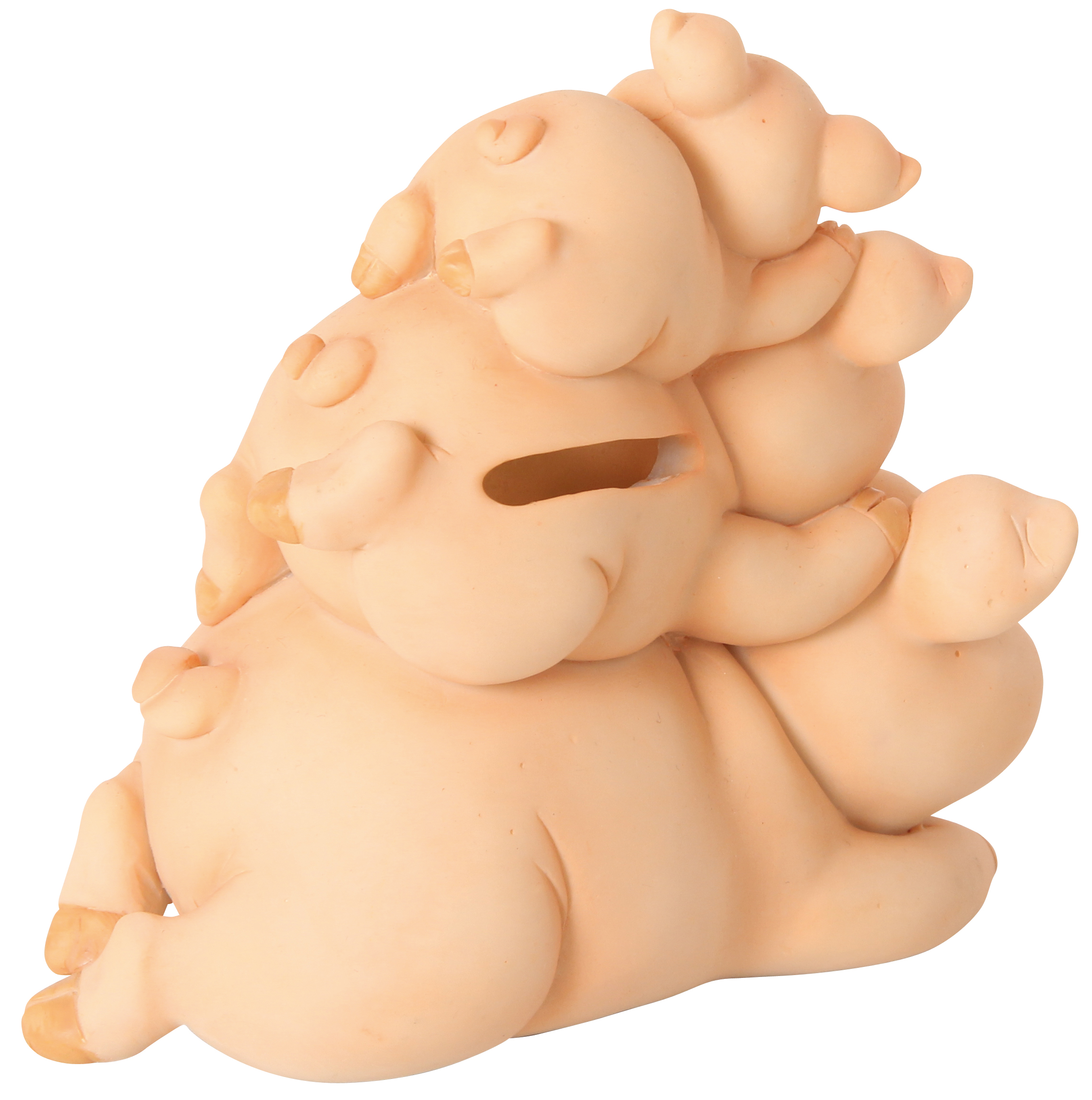 Attraktive und lustige Spardose aus Polyresin mit drei glücklichen Schweinchen auf einem Haufen. Wiederverschließbar nach Entleerung durch Plastikverschluß.