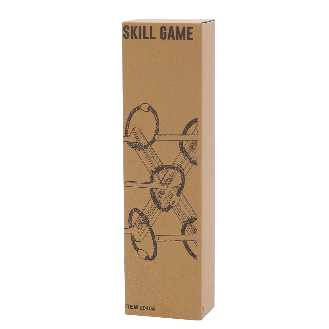 Zielspiel aus Holz. Dazu werden die Seilringe mit gleichfarbigen Stäben in die Basis gesteckt (jede Farbe punktet anders). Kompakt und einfach zu montieren, inklusive 12 Teilen. Mit Anleitung in Englisch und Spanisch. Einzeln präsentiert in einer Kraft-Design-Box.