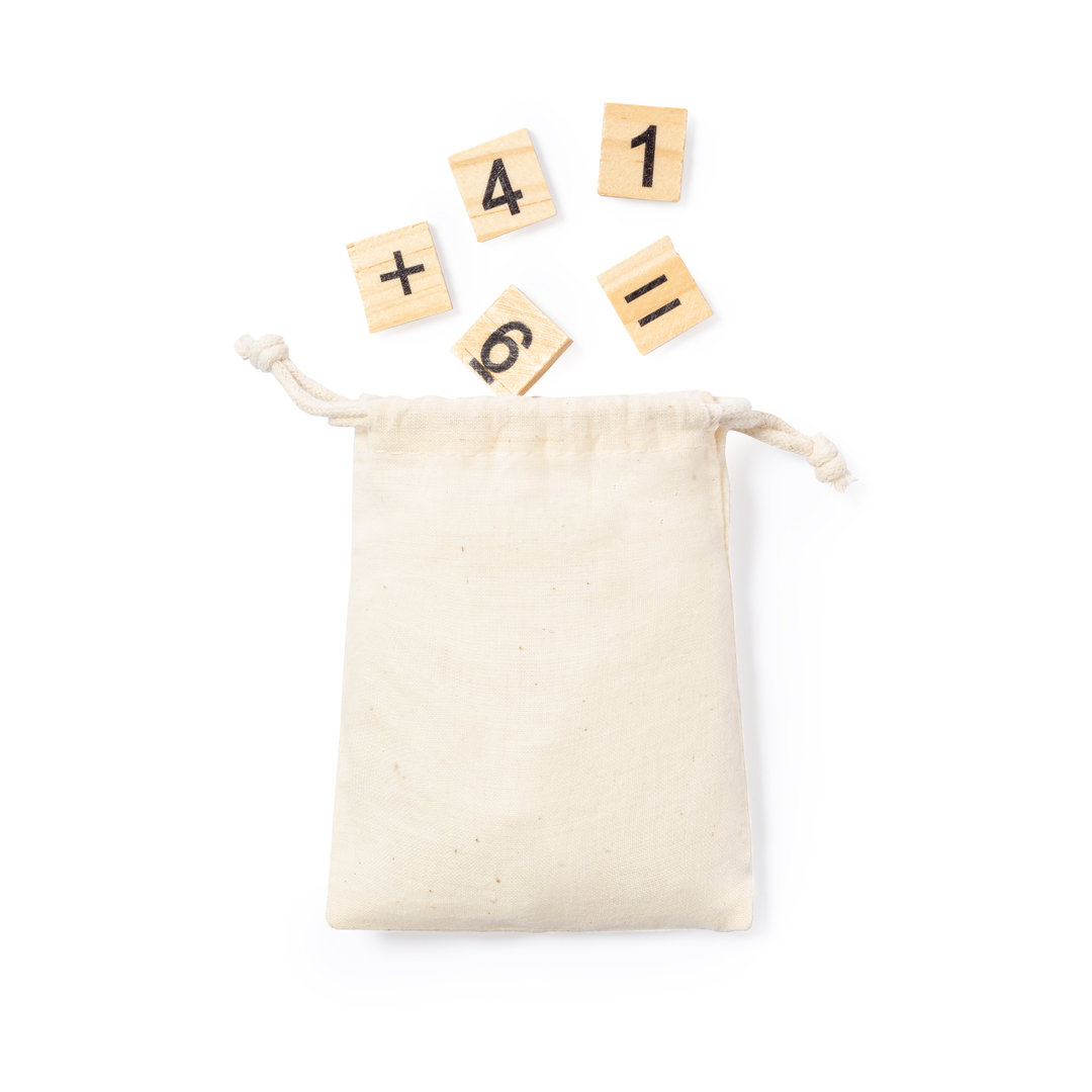 Rechenset aus widerstandsfähigem, natürlichem Kiefernholz. Set mit 32 Teilen in einer Tragetasche aus Baumwolle mit passenden Kordeln.
