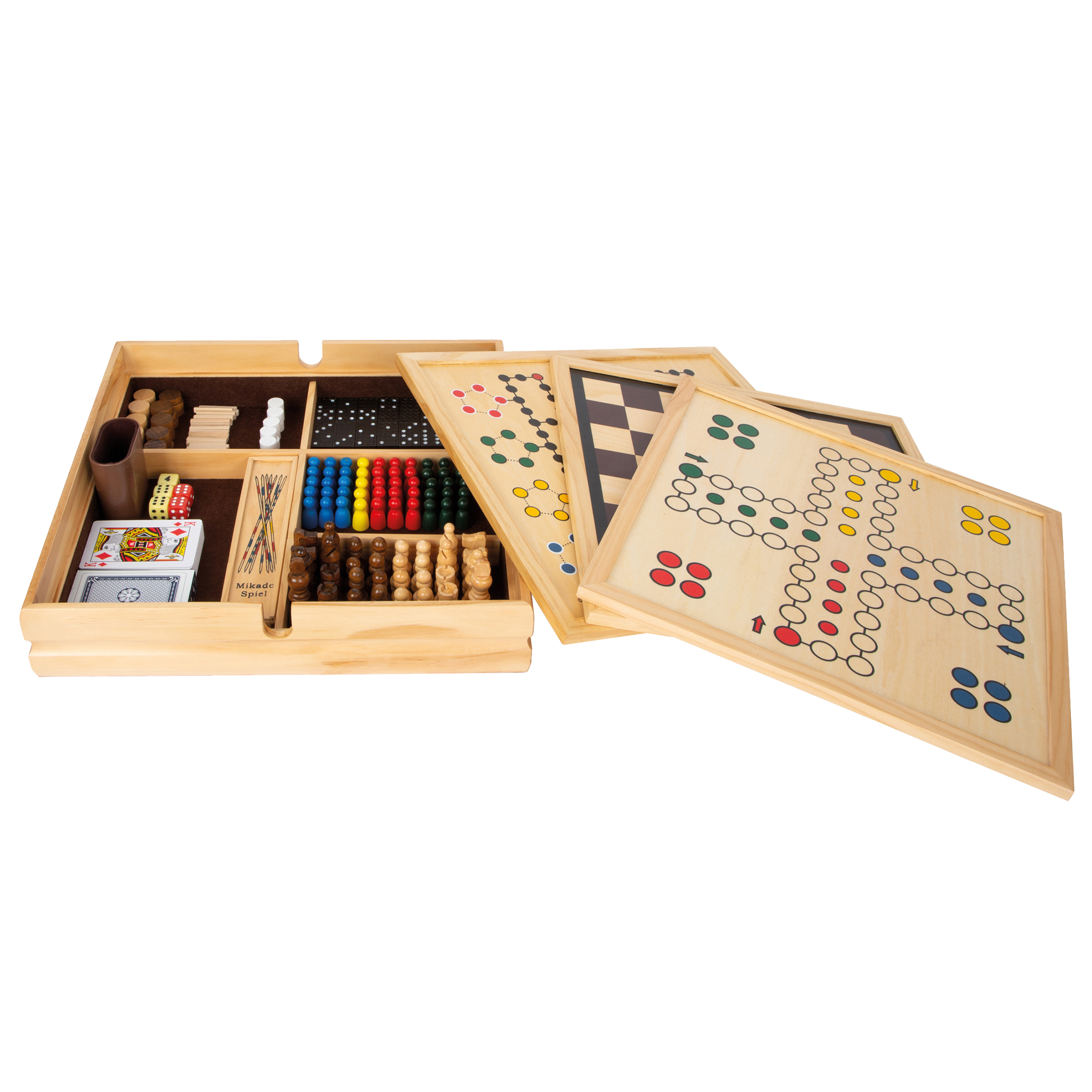 Die ultimative Spielesammlung! Ob Würfelspiele, Ludo, Barrikade, Backgammon, Schach, Dame, Mühle, Halma & Co. - diese umfangreiche Spielesammlung aus Holz enthält 20 Spieleklassiker für spannende Stunden und lustige Spielenachmittage. Mit bis zu 80 weiteren Spielvarianten der Brett-, Karten-, Würfel- und Knobelspiele kommt garantiert keine Langeweile auf! In der massiven Holzkiste mit Filzboden geht nichts verloren. Inkl. Anleitung für 20 Spiele. Diese Gesellschaftsspiele dürfen in keinem Haushalt fehlen! Damit vergeht der Spieleabend wie im Flug. Die große, hochwertige Spielesammlung mit bewährten Klassikern ist ein Must-Have im Gesellschaftsspiele-Sortiment.