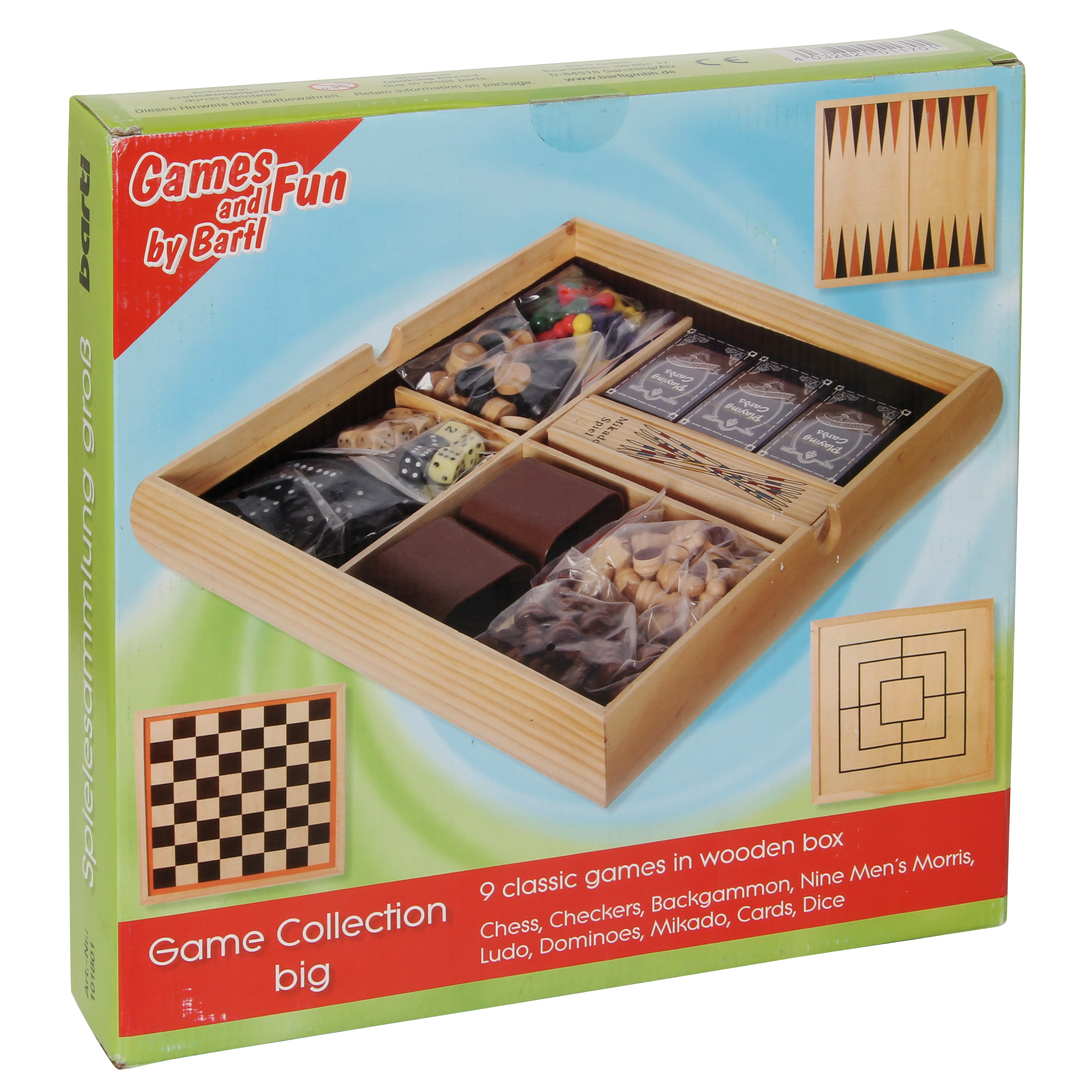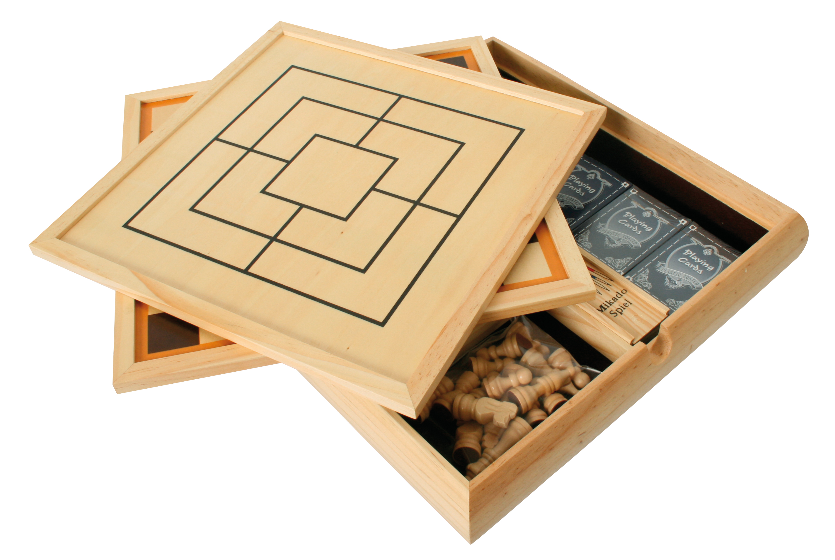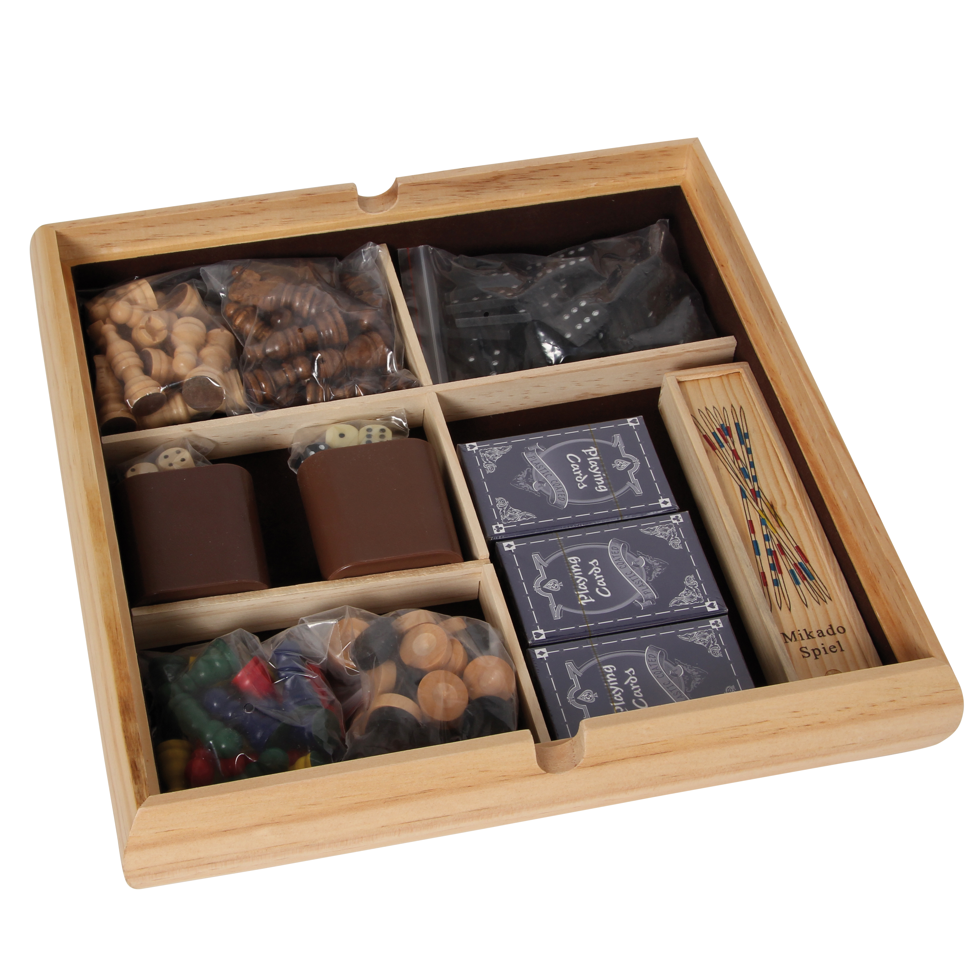 Die exklusive Holzkassette mit fünf Fächern enthält neun Spiele: Schach, Dame, Mühle, Backgammon, Ludo, Mikado, Domino, 3 x Spielkarten, verschiedene Würfel mit zwei Würfelbechern. Die zwei Spielbretter sind der Deckel für die Kassette.