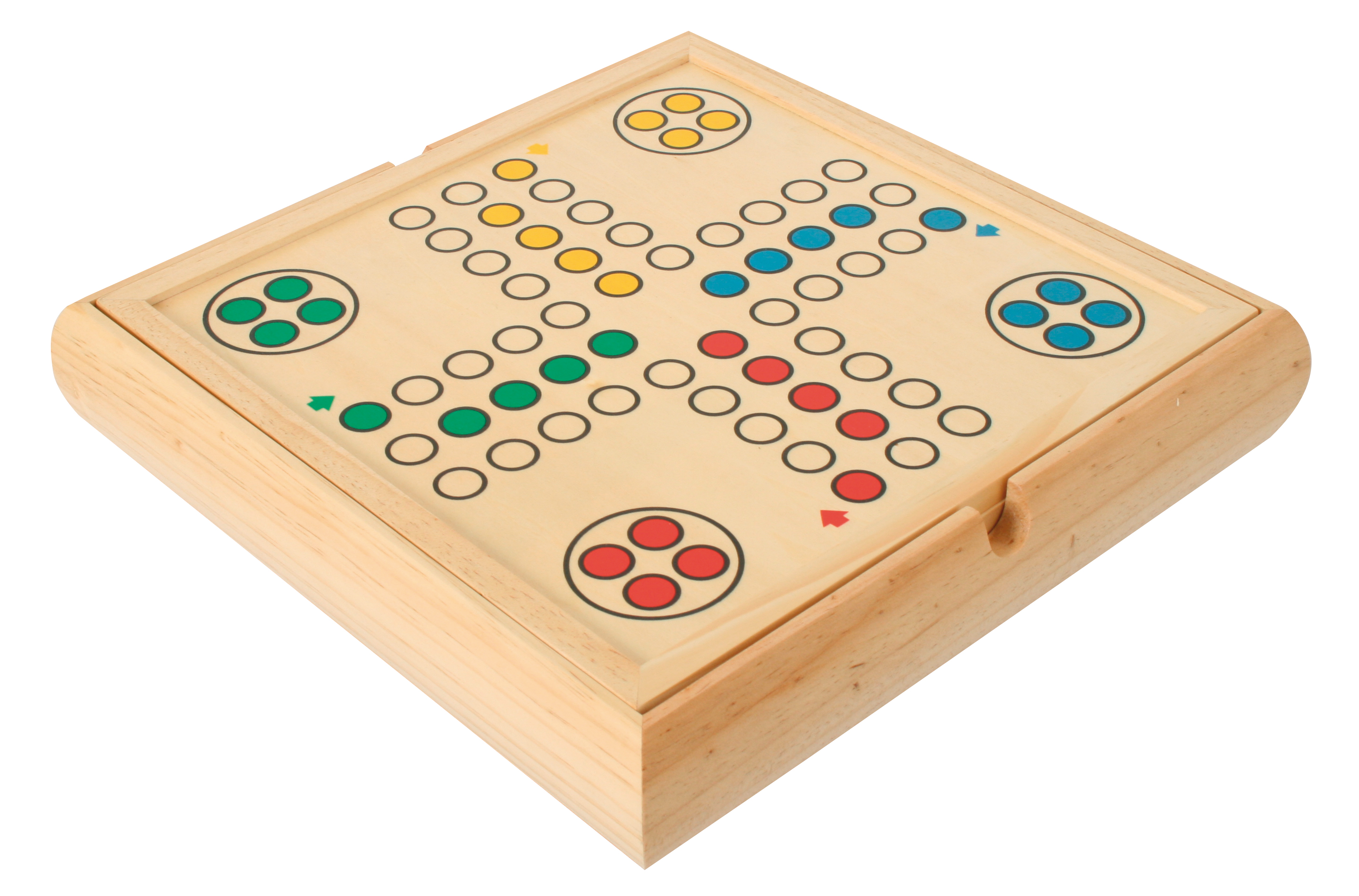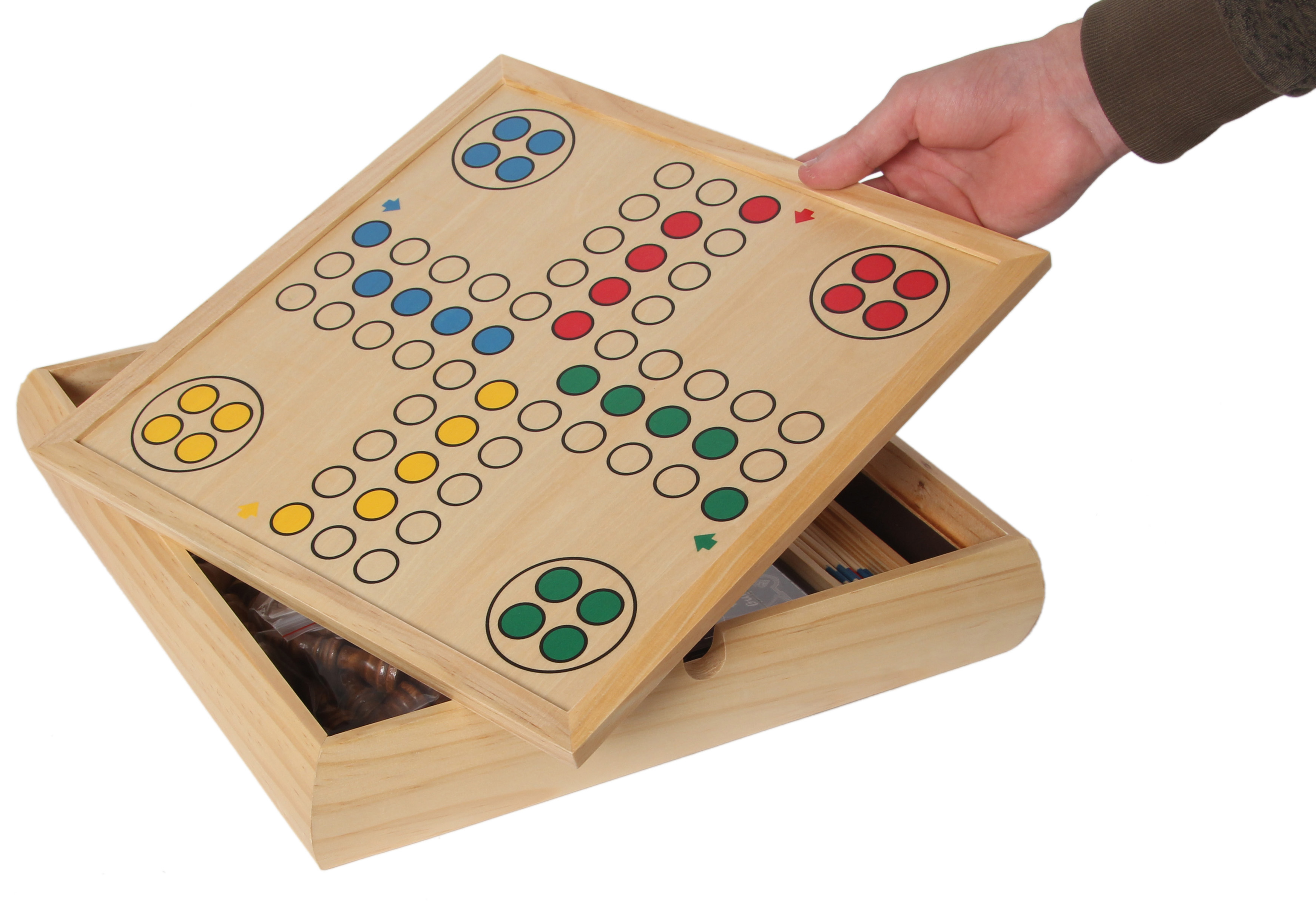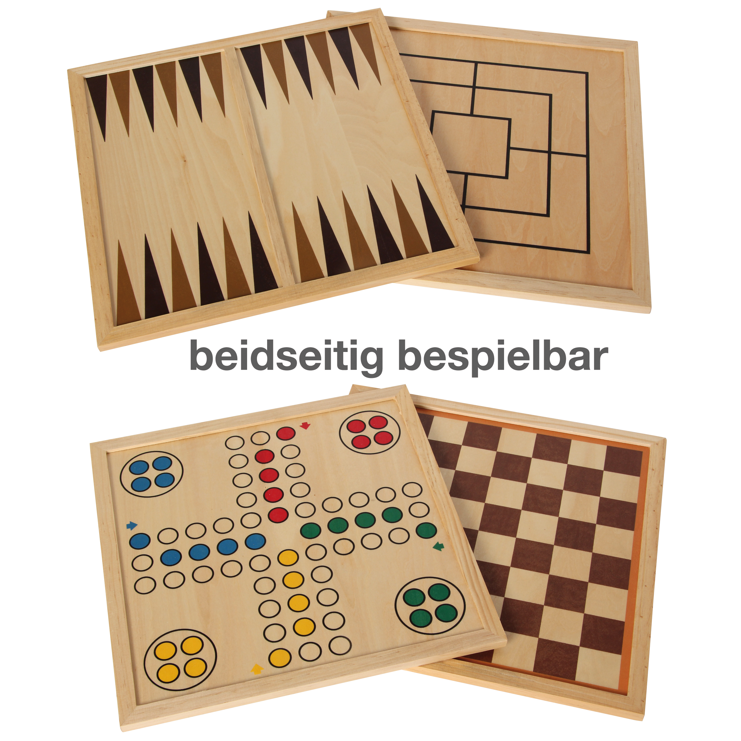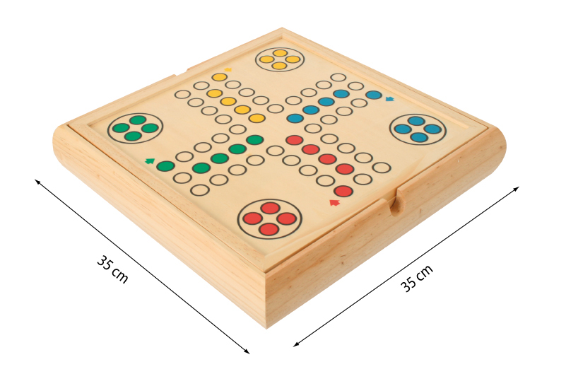 Die exklusive Holzkassette mit fünf Fächern enthält neun Spiele: Schach, Dame, Mühle, Backgammon, Ludo, Mikado, Domino, 3 x Spielkarten, verschiedene Würfel mit zwei Würfelbechern. Die zwei Spielbretter sind der Deckel für die Kassette.
