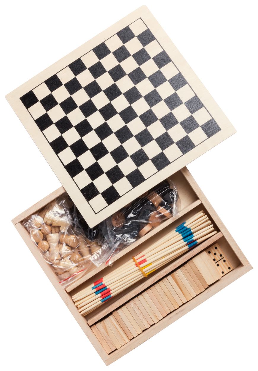 Spieleset aus Holz. Beinhaltet: Schach, Domino, Mikado und Dame.
