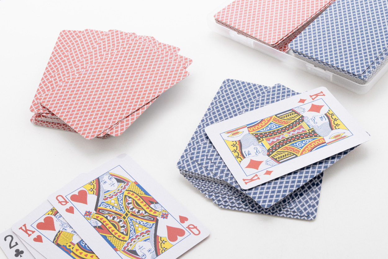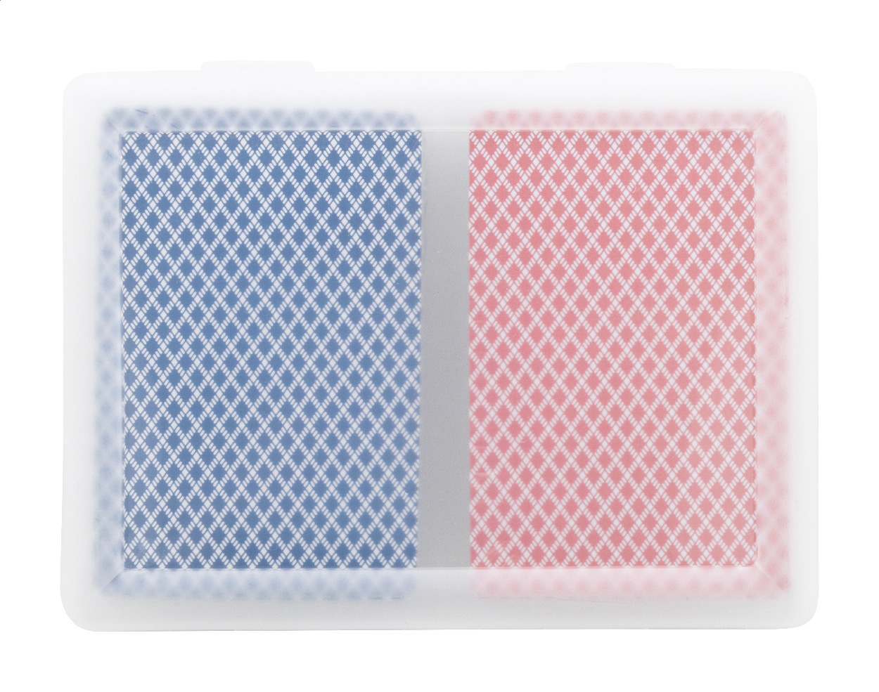 Französische Spielkarten aus Papier in einer Schachtel aus recyceltem PP. Enthält zwei Standardkartenspiele mit je 54 Karten und roter und blauer Rückseite.