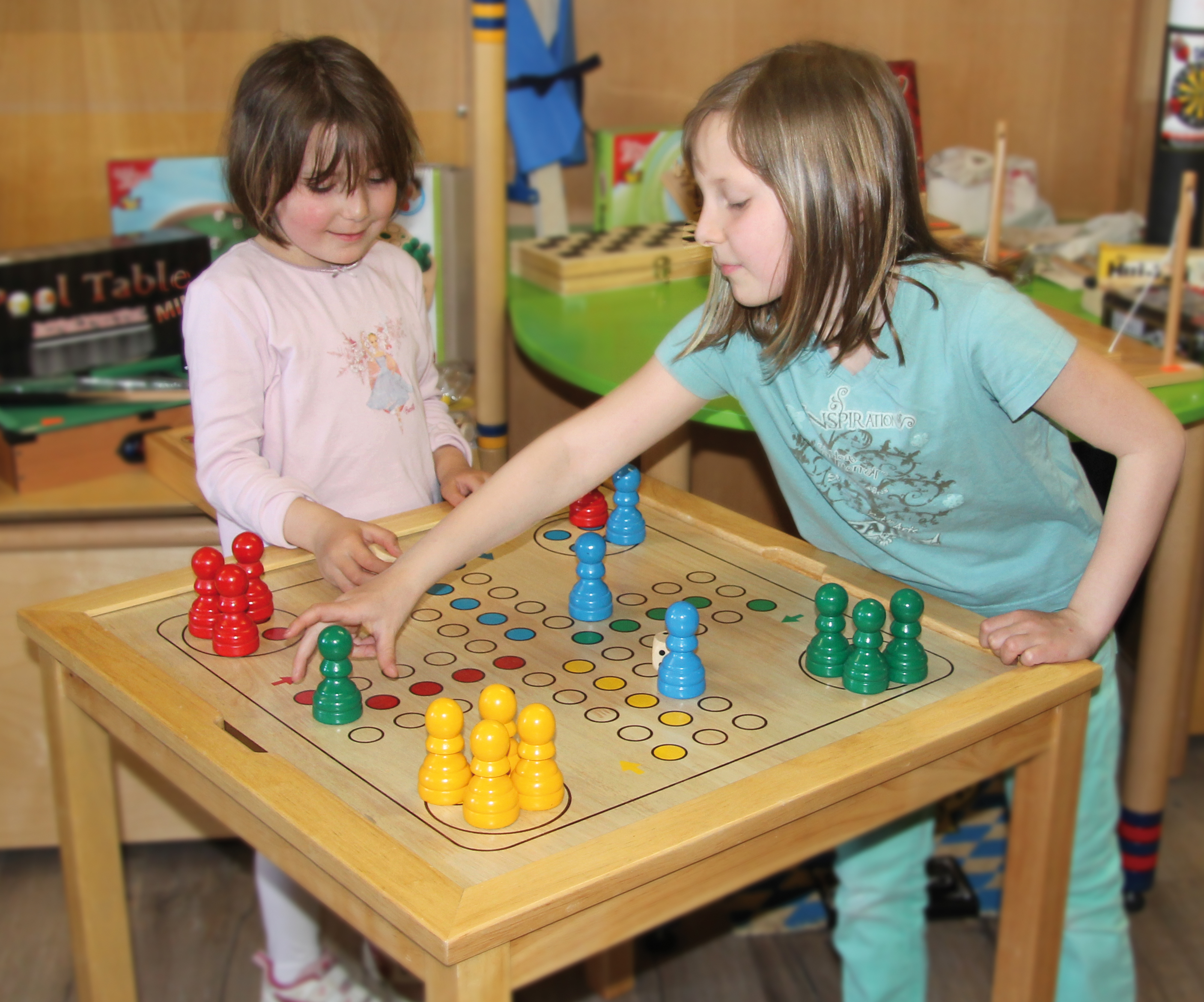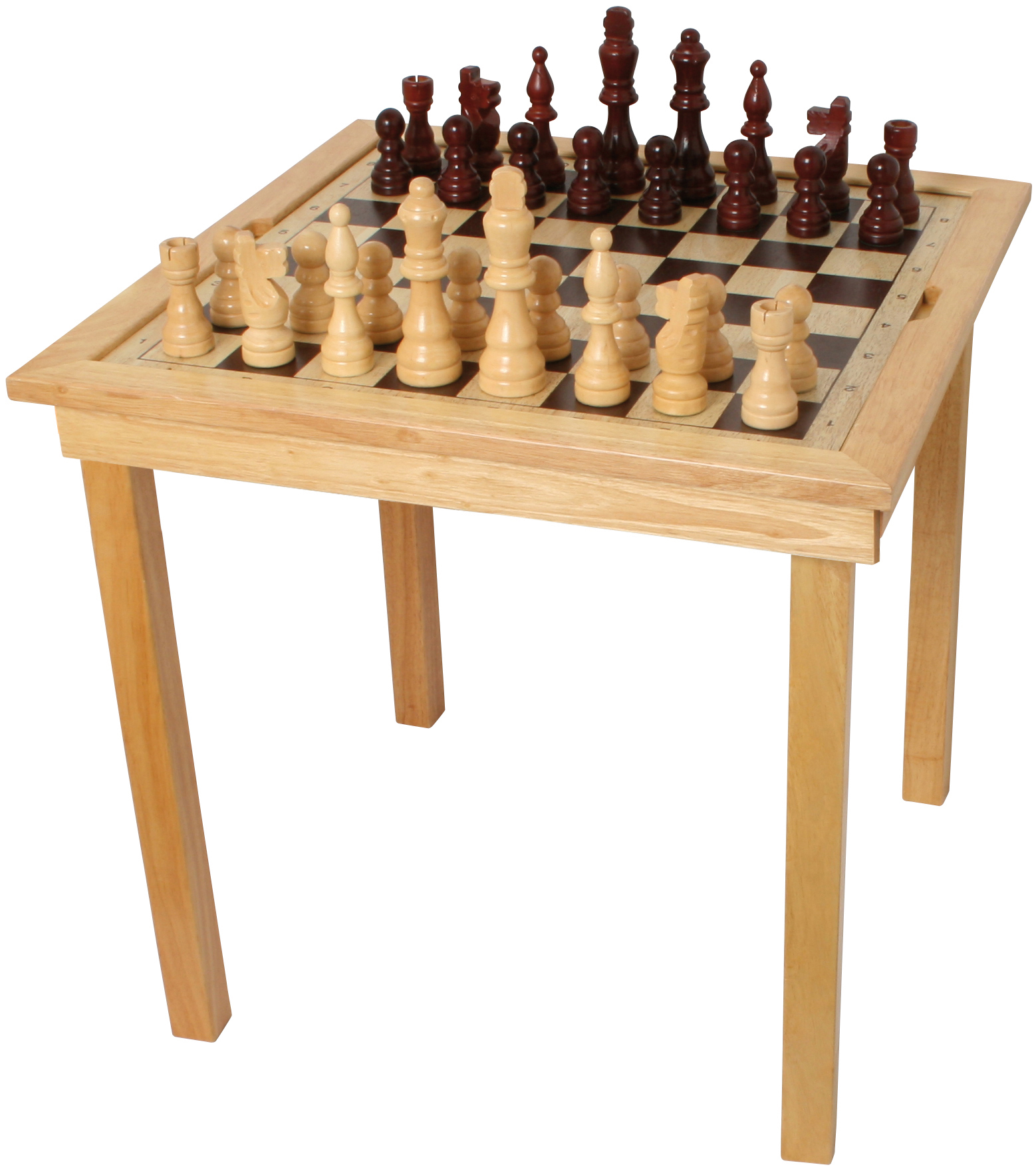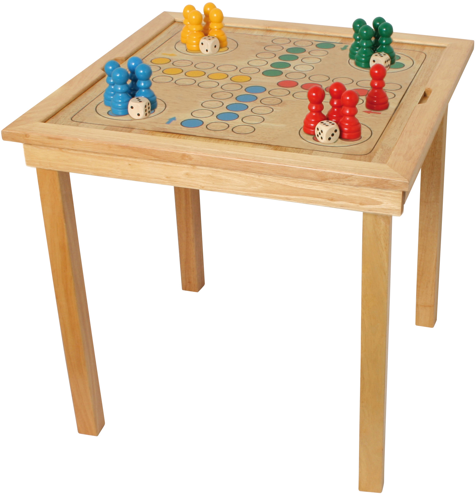 Exklusiver Spieltisch aus Holz mit handlich großen Spielfiguren aus Holz: 32 Schachfiguren, 24 Damesteine sowie 16 Spielfiguren und 4 große Würfel für Ludo. Das Spielbrett ist herausnehmbar und präsentiert auf einer Seite Schach und Dame, auf der anderen Seite Ludo.