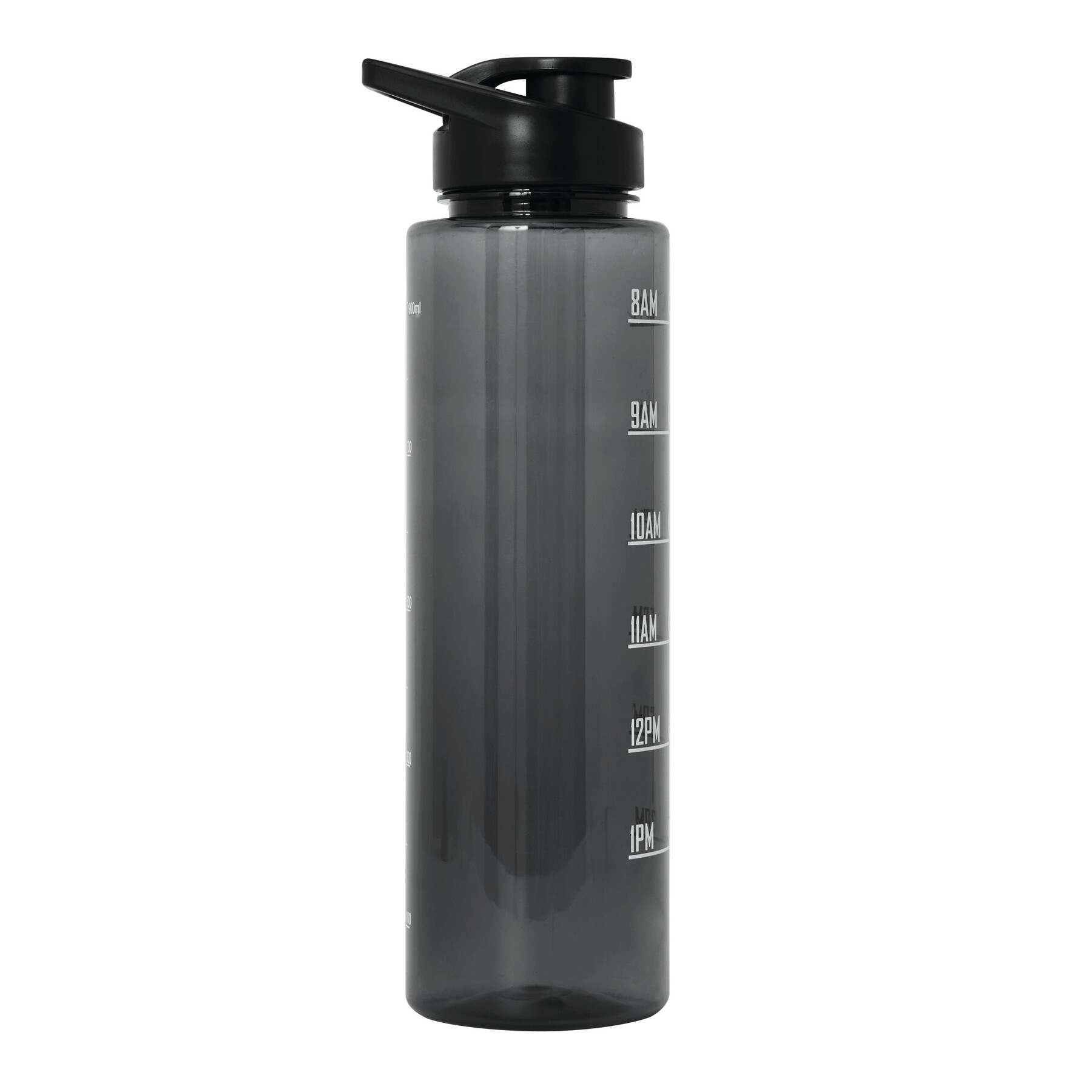 Sport-Trinkflasche AQUA LEVEL: transparente farbige Trinkflasche aus langlebigem PETG, farbig abgestimmter Kunststoff-Deckel mit sicherem Schraubverschluss, Silikon-Dichtring, Trinköffnung zum Aufklappen und Tragegriff, motivierende Zeit- und Wassermengenskala (Uhrzeiten / ml), mit Trageschlaufe, Füllmenge ca. 1.000 ml