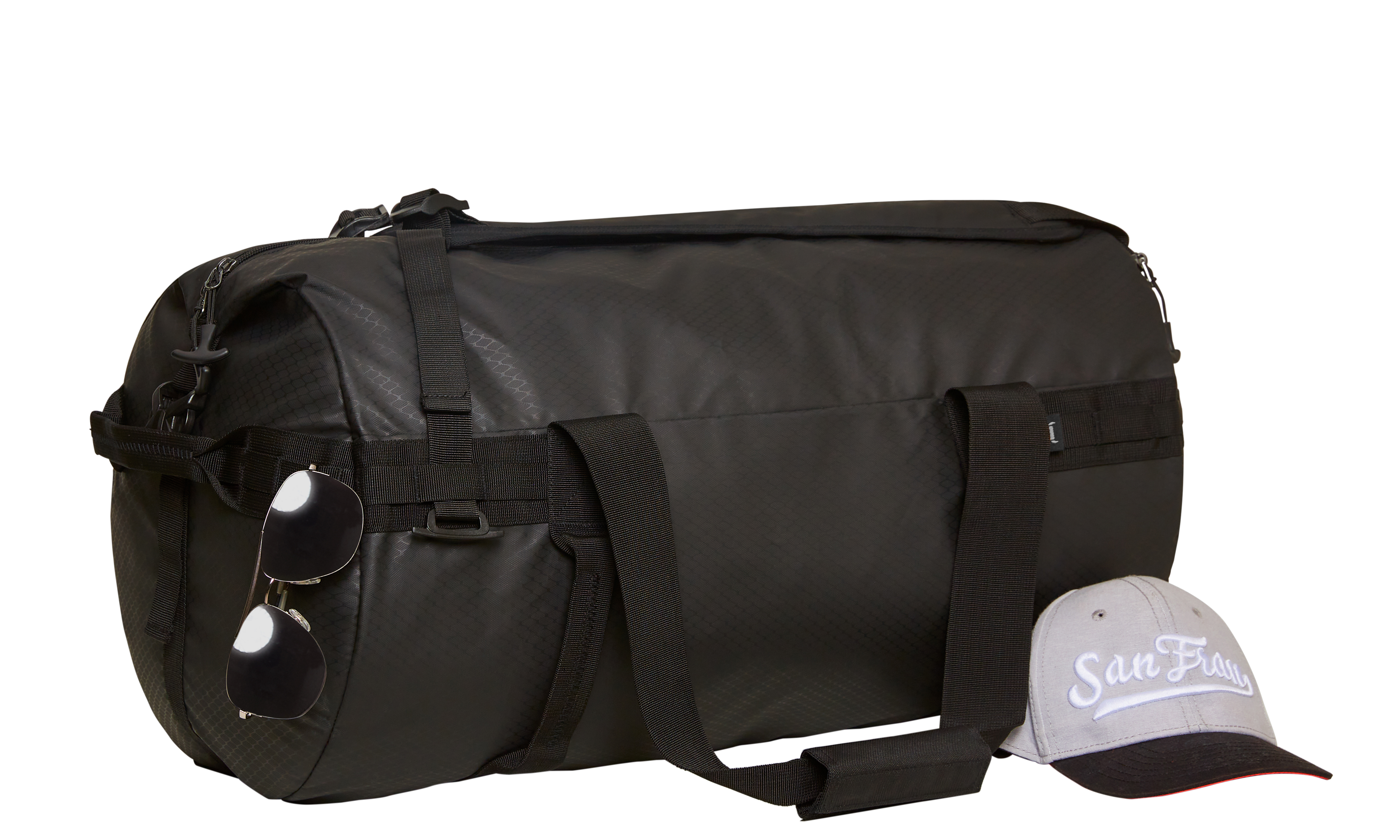 Komfortable Sport-Reisetasche mit Rucksackfunktion; geräumiges Hauptfach mit 2-Wege-Reißverschluss und seitlichen Steckverschlüssen; seitliches Reißverschlussfach; Reißverschluss-Vortasche; umlaufendem Funktions- Schlaufenband; diverse Handgriffe; Tragegriffe und versteckte, gepolsterte und längenverstellbare Schultergurte