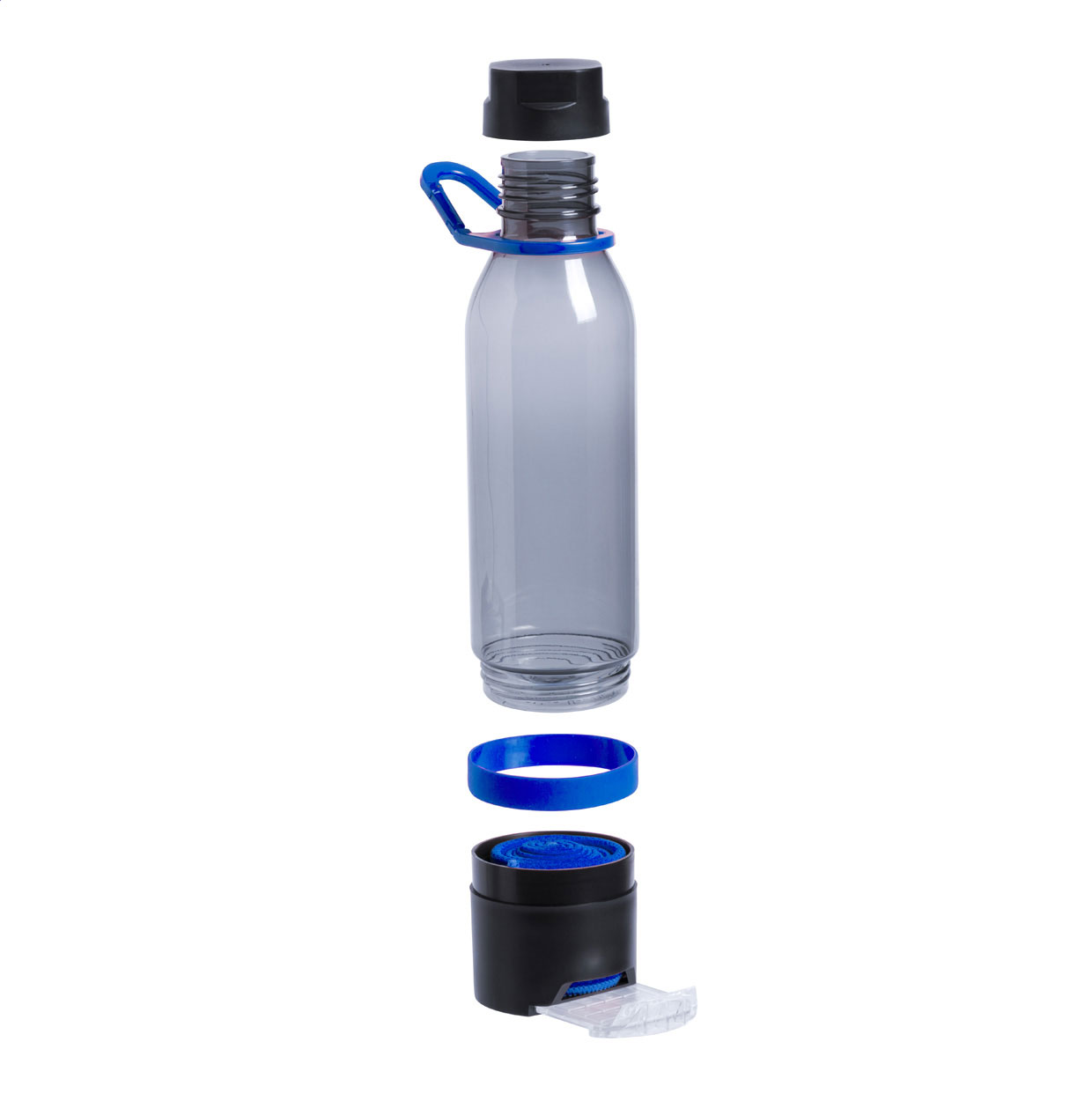 Multifunktions-Sportflasche aus Kunststoff mit Kühltuch (390 g / m²) im Bodenfach und ausziehbarem Handyhalter. Im Geschenkkarton. 650 ml. Nicht für kohlensäurehaltige Getränke geeignet.