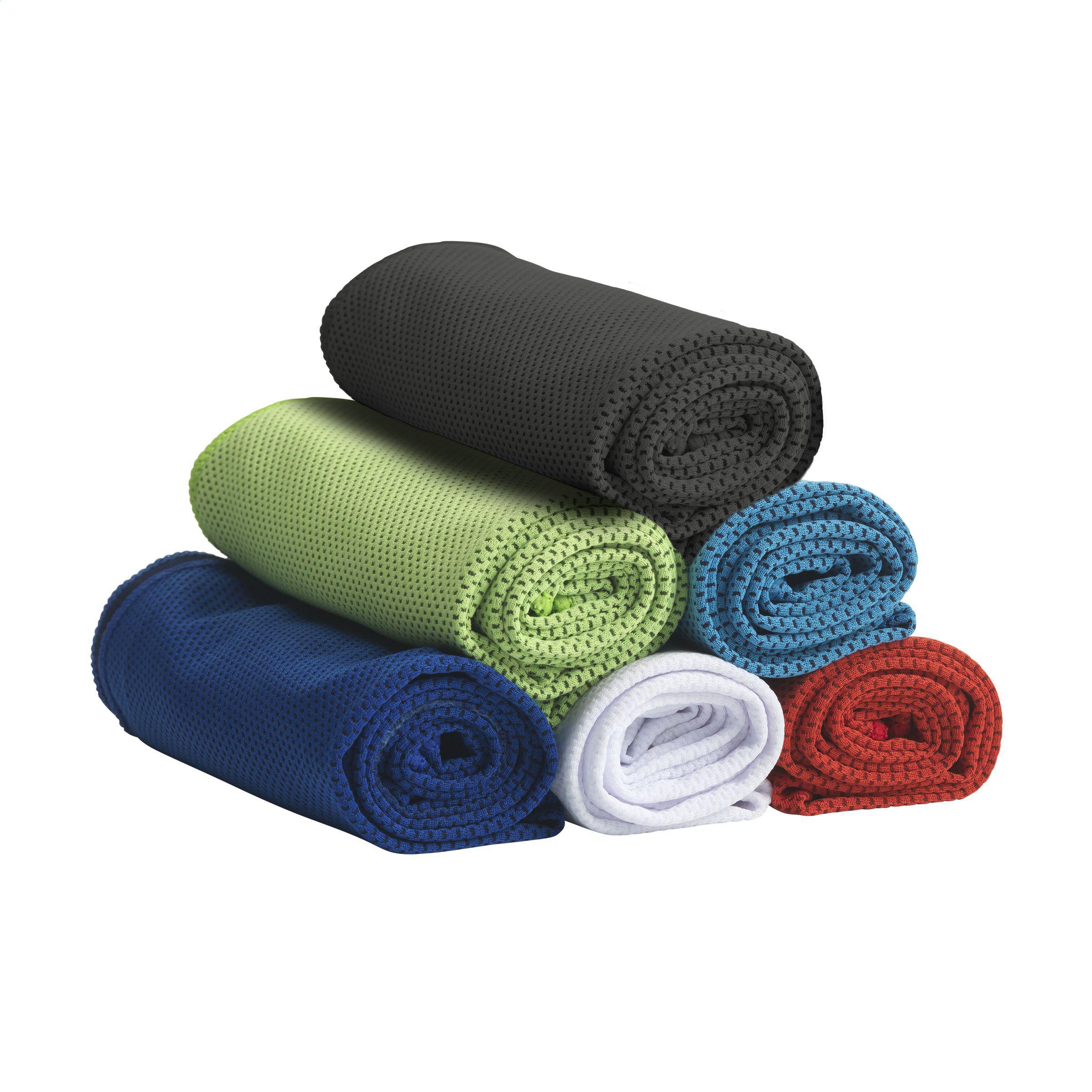 Spezielles Kühlhandtuch aus 100 % Polyester. Nach dem Eintauchen in kaltes Wasser kann dieses Handtuch bei sportlichen Aktivitäten oder Sonnenbrand kühlen. Ideales Format, um es zur Kühlung im Nacken zu tragen. Die Vorderseite des Handtuchs ist in Netzstruktur, die Rückseite ist glatt und hat einen dunkleren Farbton als die Vorderseite.
