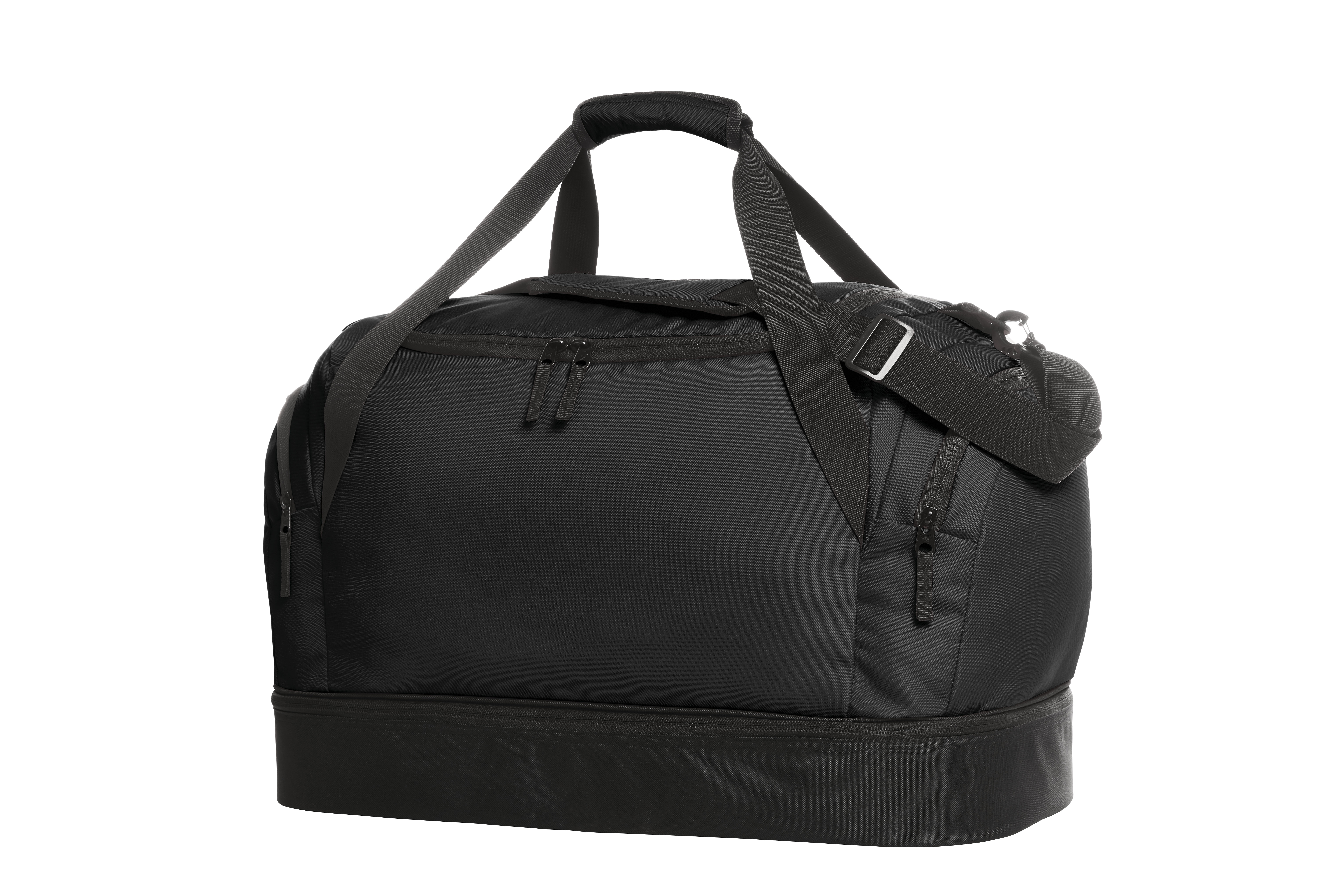 Klassische Sport- und Freizeittasche mit stabiler, separat bestückbarer Bodenwanne; großes Hauptfach mit 2-Wege-Reißverschluss; fester Boden mit Bodenfüßen; Reißverschluss-Innenfach; zwei Reißverschluss-Seitentaschen; Tragegriffe mit Griffmanschette; abnehmbarer, längenverstellbarer Schultergurt mit Schulterpolster