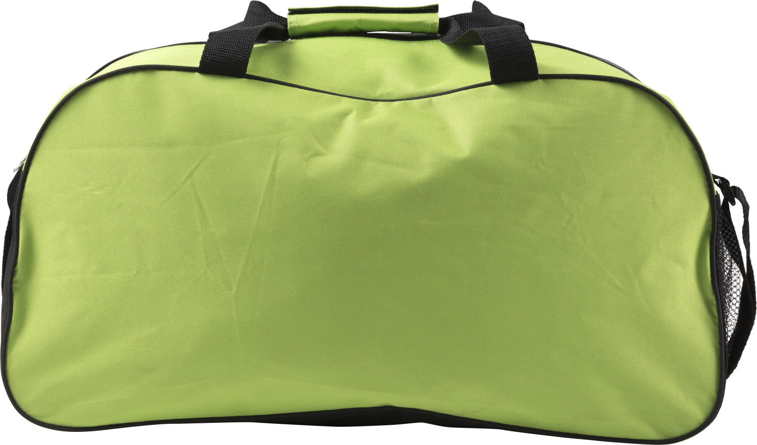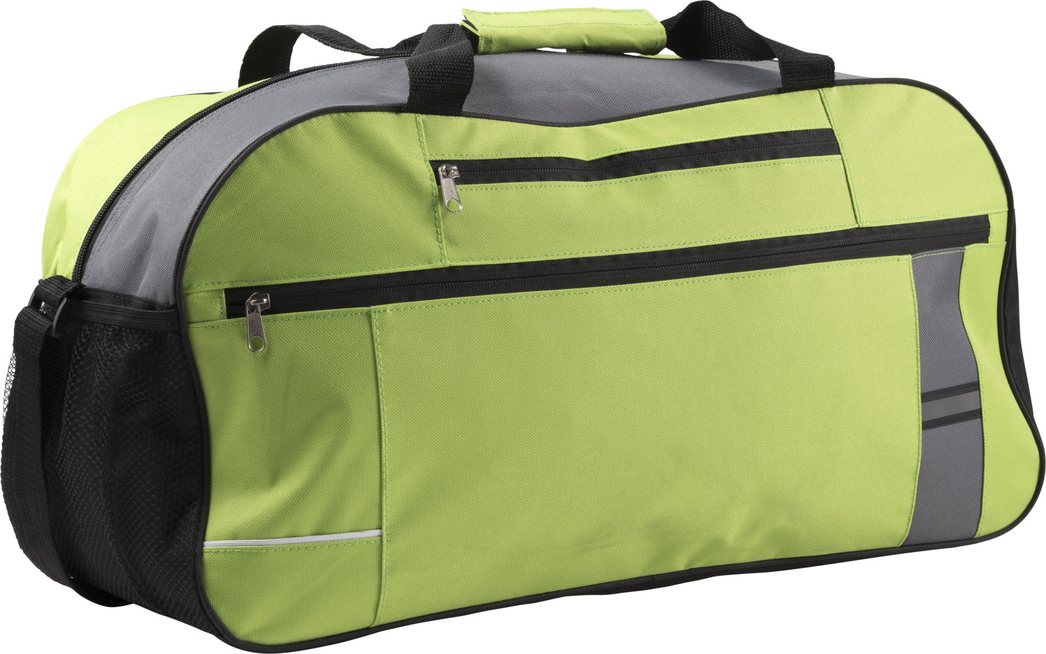 Sporttasche aus Polyester (600D), mit zwei RV-Fronttaschen, RV-Hauptfach, seitlichem Netzfach, Tragegriffe mit Klettverschluss, verstellbarem Schultergurt und Reflektorstreifen.