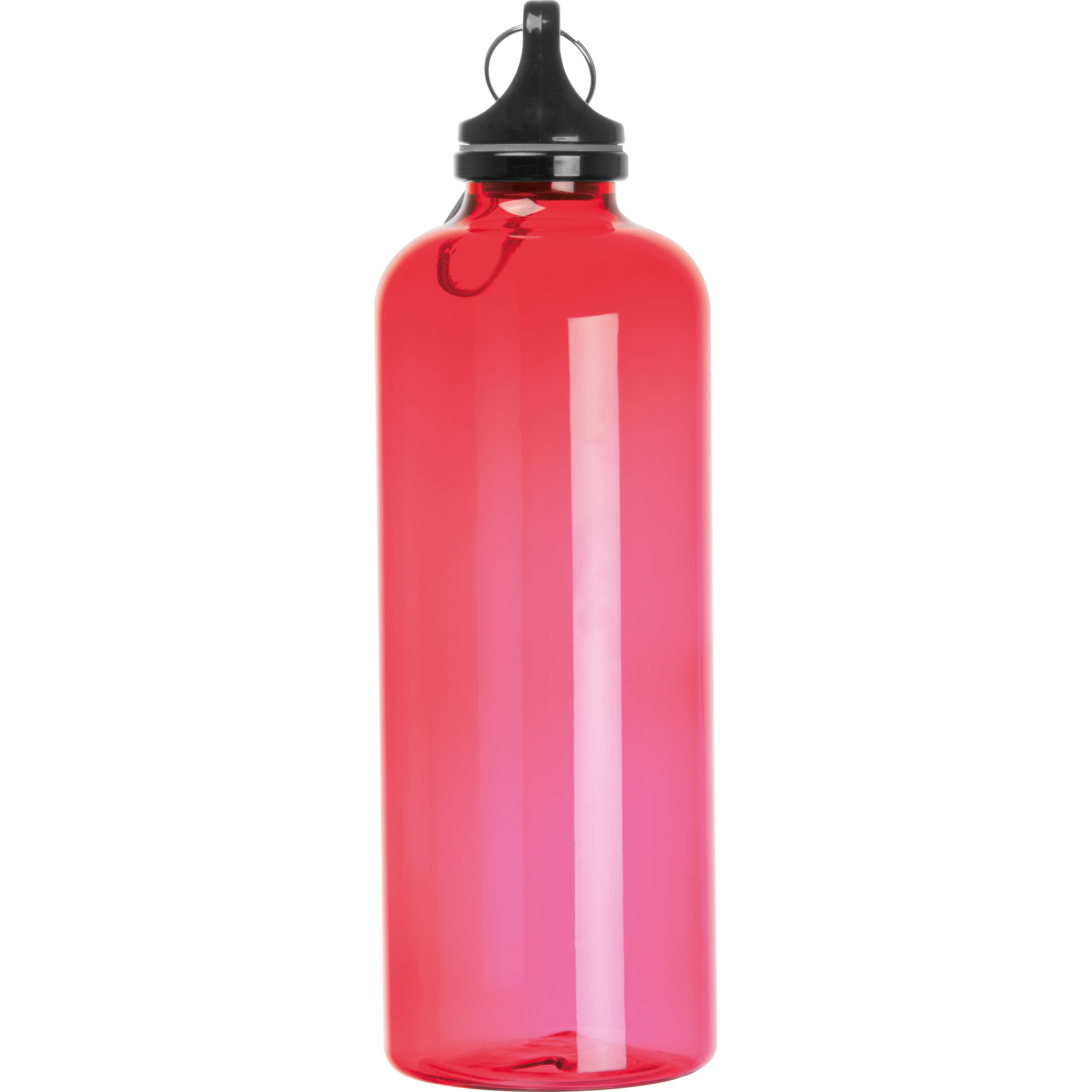 Trinkflasche aus Kunststoff (PET) mit auslaufsicherem Verschluss, Karabinerhaken aus Aluminium und einem Füllvermögen von 600 ml. Die Werbung wird auf die Flasche gedruckt.