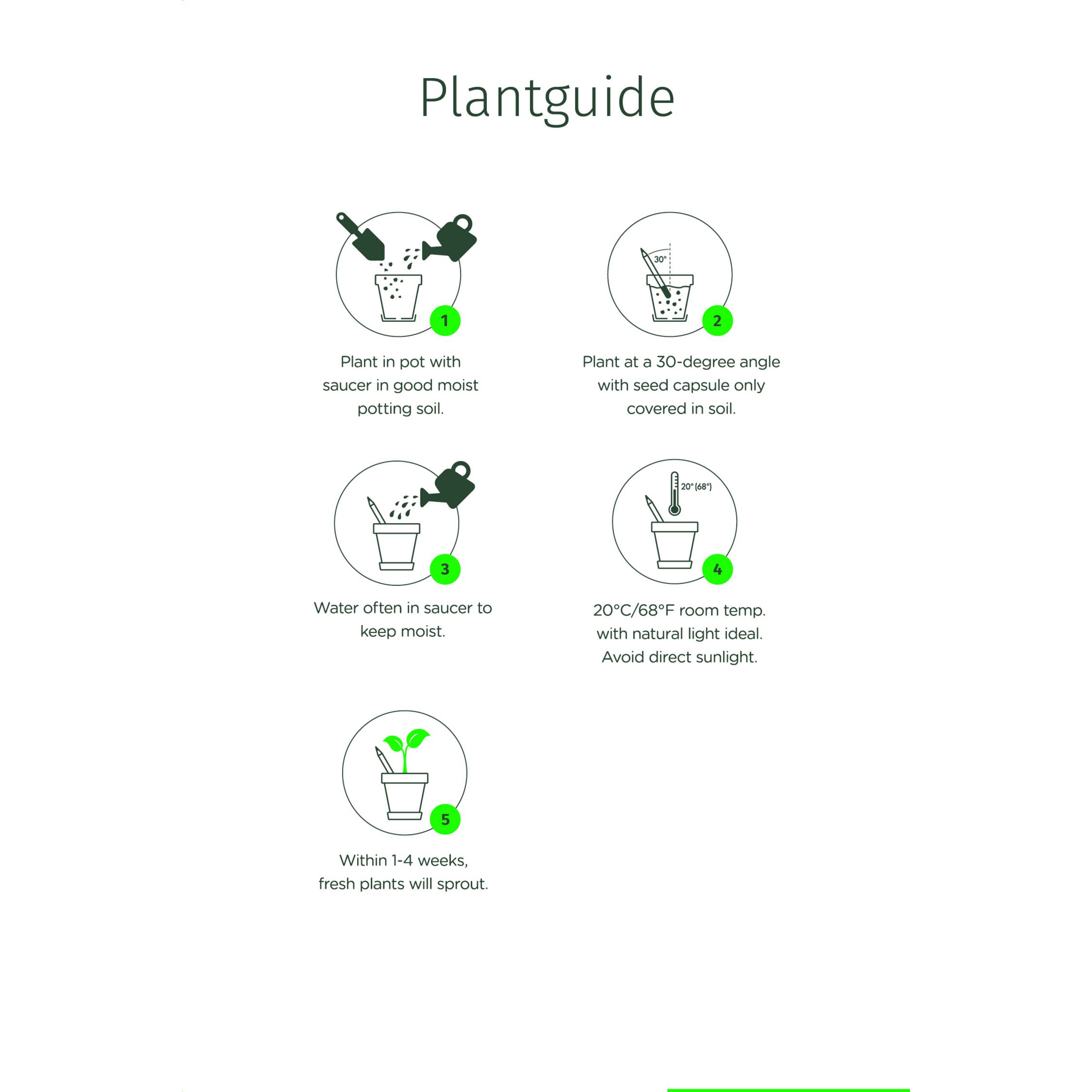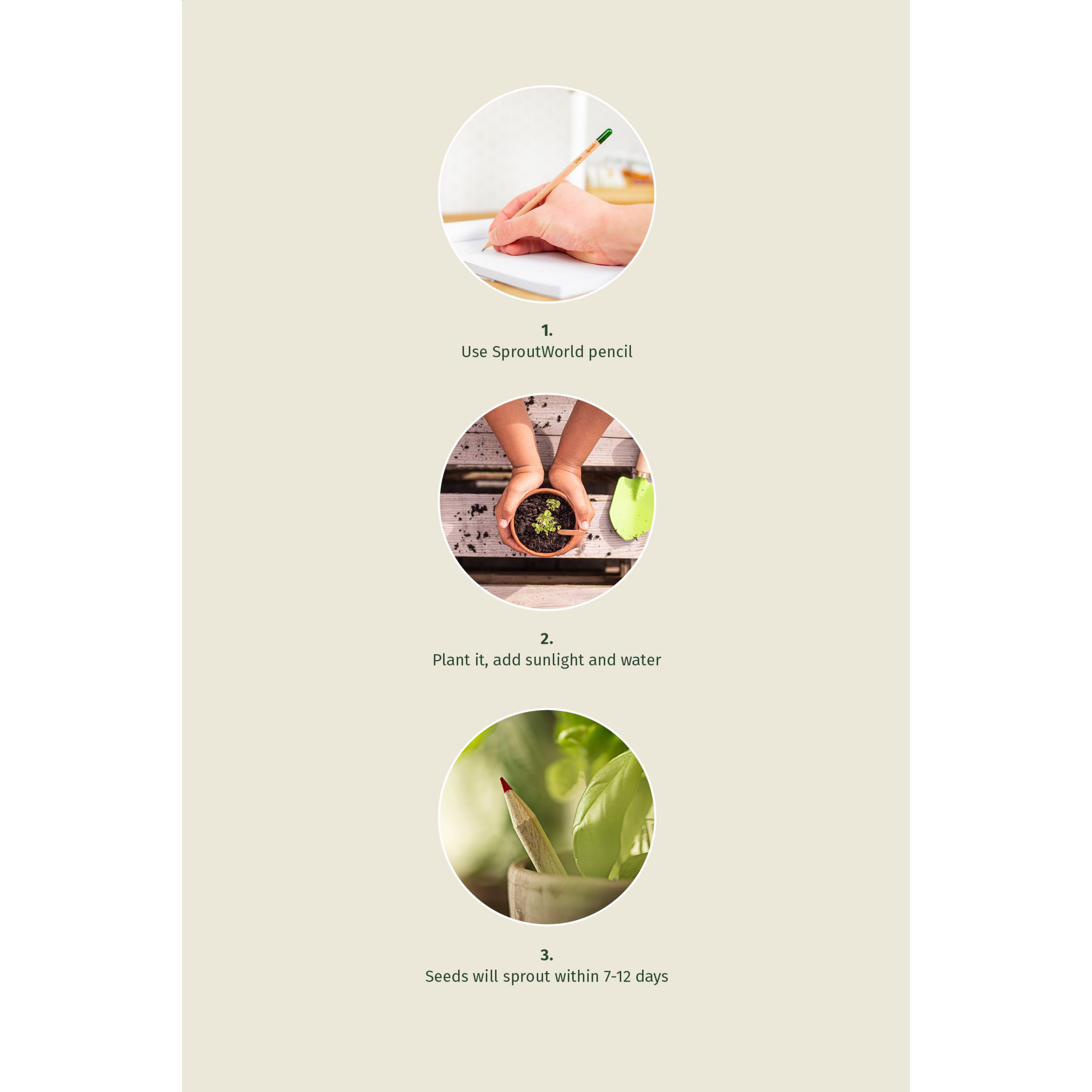 Sproutworld-Bleistift mit einer inspirierenden Botschaft für die Natur. Dieser ungespitzte Bleistift ist aus Holz gefertigt. Am Ende des Bleistifts ist eine Kapsel (aus Zellulose) angebracht, die einige Samen enthält. Wenn der Stift zu klein geworden ist, um ihn zu verwenden, pflanzen Sie den Stift mit der Kapsel in die Erde. Nach etwa 2–3 Wochen keimen die Samen und entwickeln sich zu wunderschönen Blumen, duftenden Kräutern oder Gemüse. Wählen Sie aus verschiedenen Typen. Der Name der Pflanze ist standardmäßig in den Bleistift eingraviert. Der Bleistift enthält kein Blei und ist daher völlig sicher. Made in Europe. Zusatzartikel W387: Bunte Karte aus Karton zum Einlegen des Bleistifts. Die Karte enthält englischsprachige Informationen über das Produkt und verleiht dem Produkt einen exklusiven Aufmerksamkeitswert.