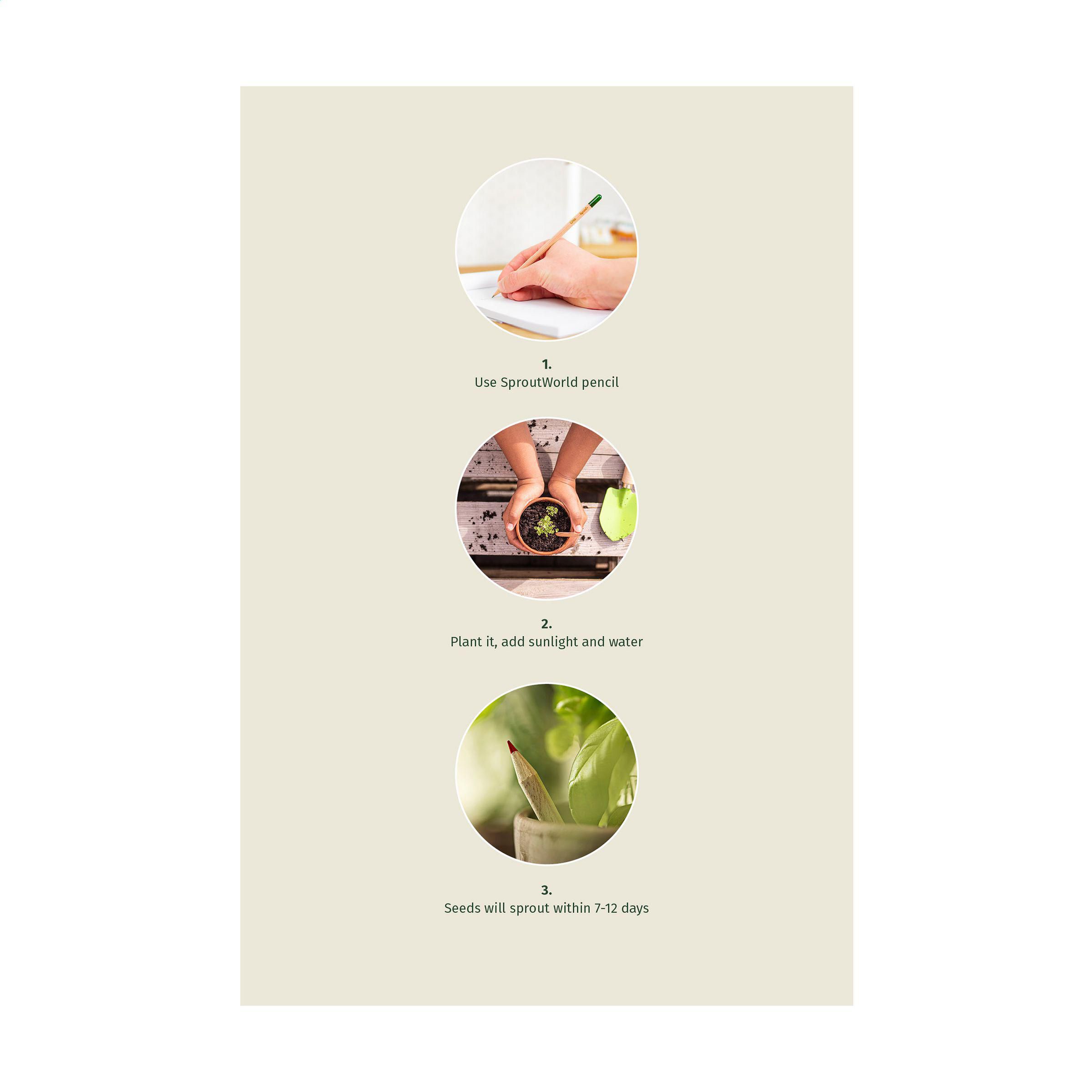 Sproutworld-Bleistift mit einer inspirierenden Botschaft für die Natur. Dieser ungespitzte Bleistift ist aus Holz gefertigt. Am Ende des Bleistifts ist eine Kapsel (aus Zellulose) angebracht, die einige Samen enthält. Wenn der Stift zu klein geworden ist, um ihn zu verwenden, pflanzen Sie den Stift mit der Kapsel in die Erde. Nach etwa 2–3 Wochen keimen die Samen und entwickeln sich zu wunderschönen Blumen, duftenden Kräutern oder Gemüse. Wählen Sie aus verschiedenen Typen. Der Name der Pflanze ist standardmäßig in den Bleistift eingraviert. Der Bleistift enthält kein Blei und ist daher völlig sicher. Made in Europe. Zusatzartikel 269387: Bunte Karte aus Karton zum Einlegen des Bleistifts. Die Karte enthält englischsprachige Informationen über das Produkt und verleiht dem Produkt einen exklusiven Aufmerksamkeitswert.Eine Life Cycle Assessment (LCA) dieses Produkts ist bei den Downloads verfügbar. Sproutworld ist B-Corp-zertifiziert; die Kollektion wird nach den höchstmöglichen ökologischen und sozialen B-Corp-Standards hergestellt.