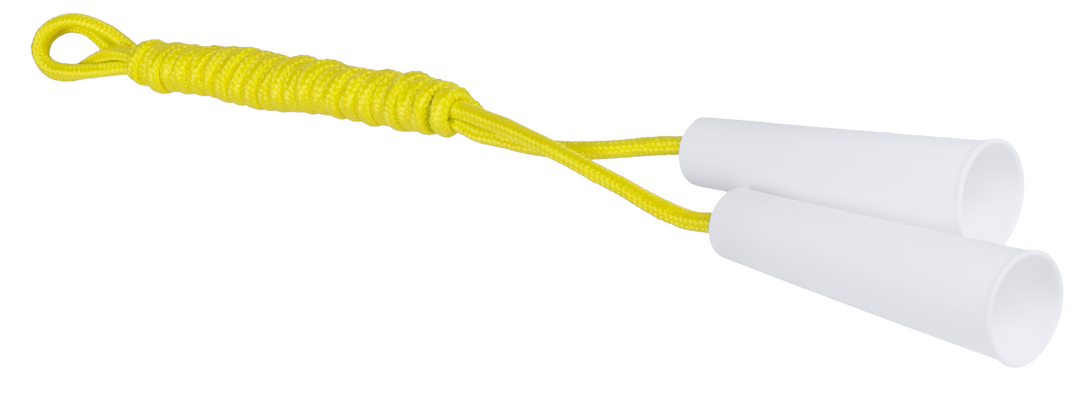 Springseil mit extra langem Seil von 240 cm Länge. In kräftigen Farben und mit weißen Griffen, die angenehm in der Hand liegen. Präsentiert in eingerolltem Zustand.