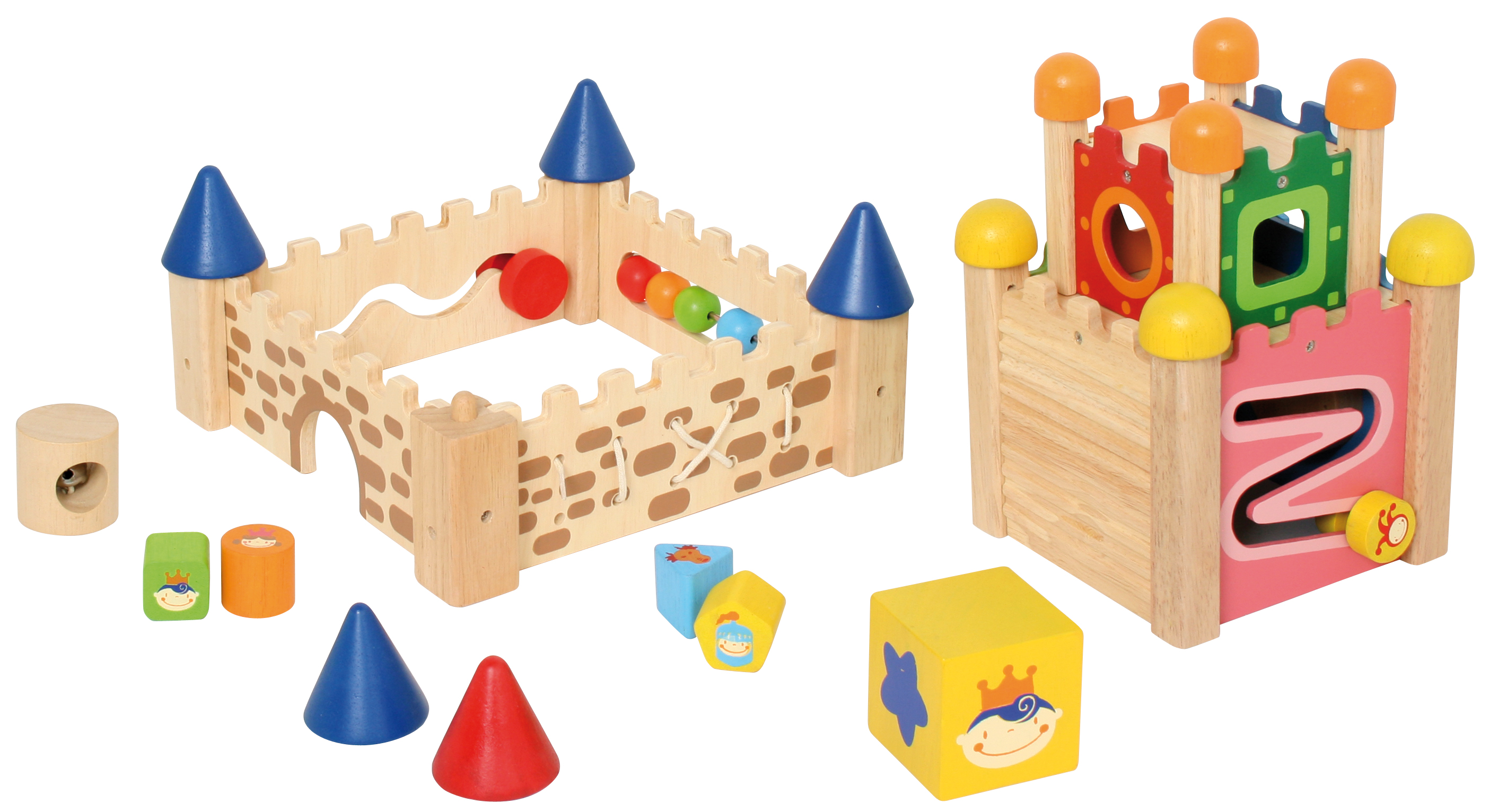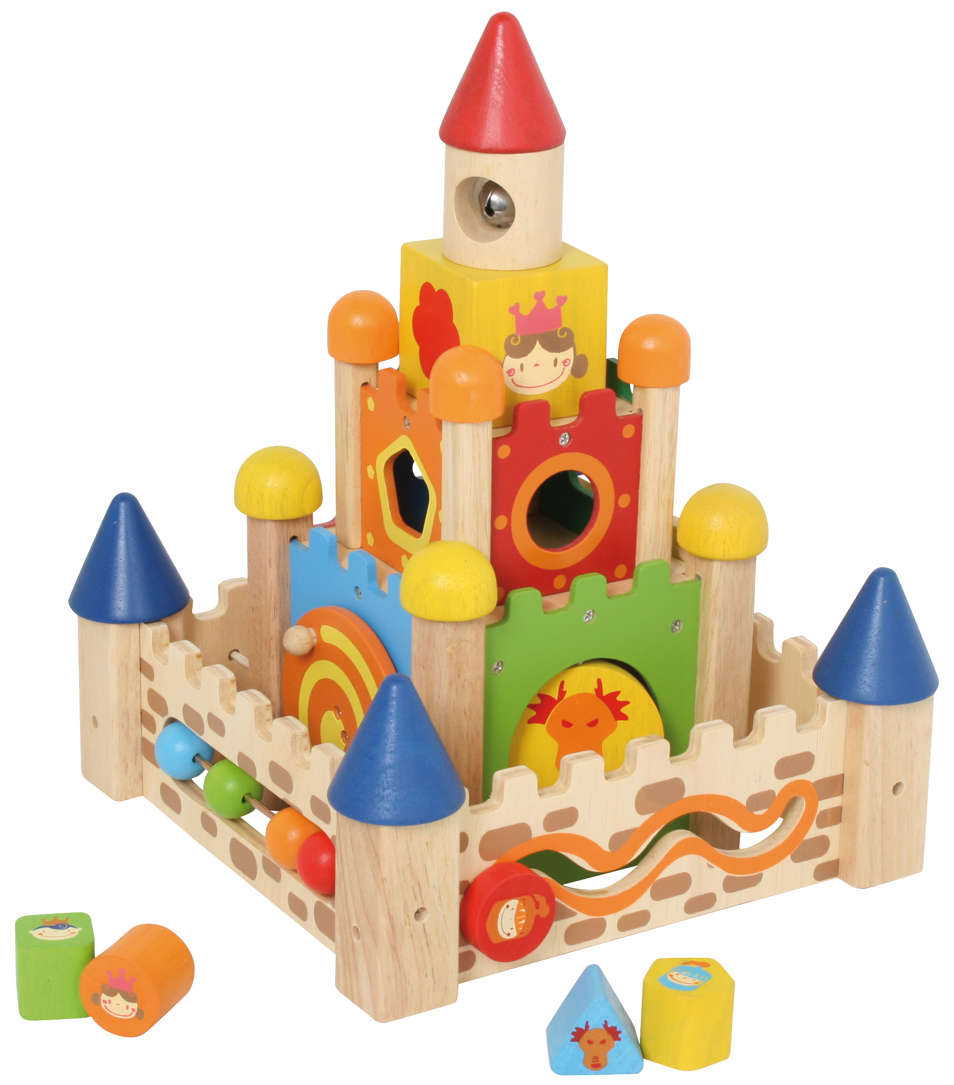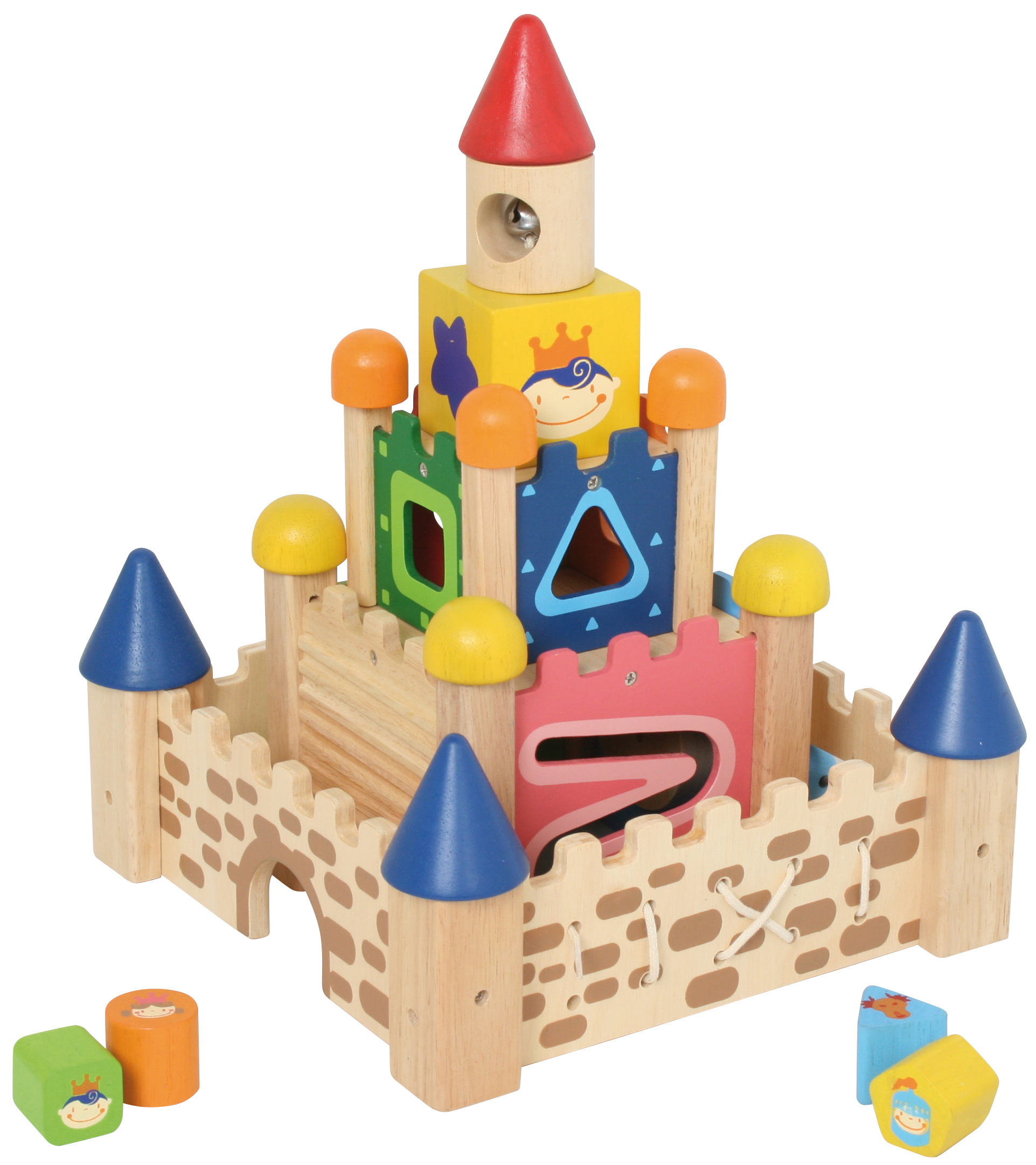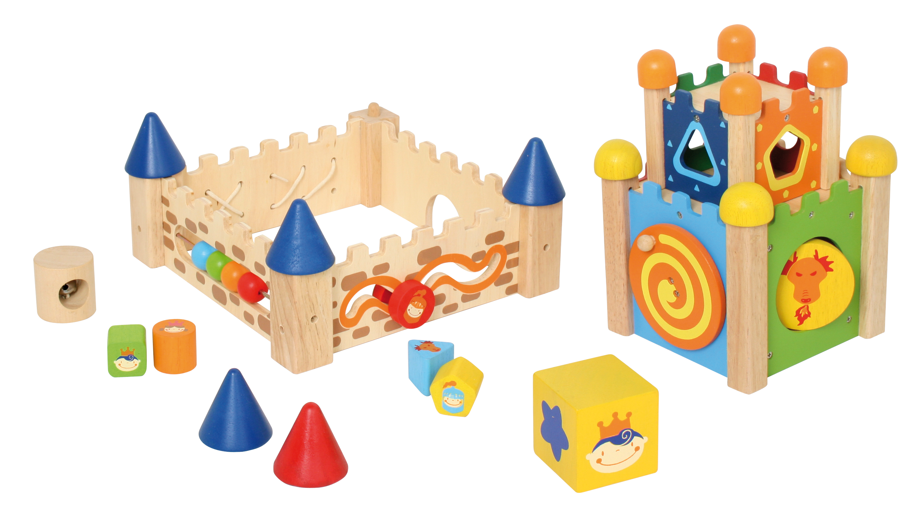 Die massive, hölzerne Stapelburg besteht aus drei Burgetagen, einem Bilderwürfel, einem Glöckchenturm und 13 verschiedenen Bausteinen. Die multifunktionelle Burg bietet viele Lernspielideen: ein Fädelspiel, verschiedene Motorikspiele, einen Zählrahmen, ein Waschbrett, Drehscheiben, ein Formensortierspiel mit vier geometrischen Bausteinen, ein Glöckchen. Ab 19 Monaten.