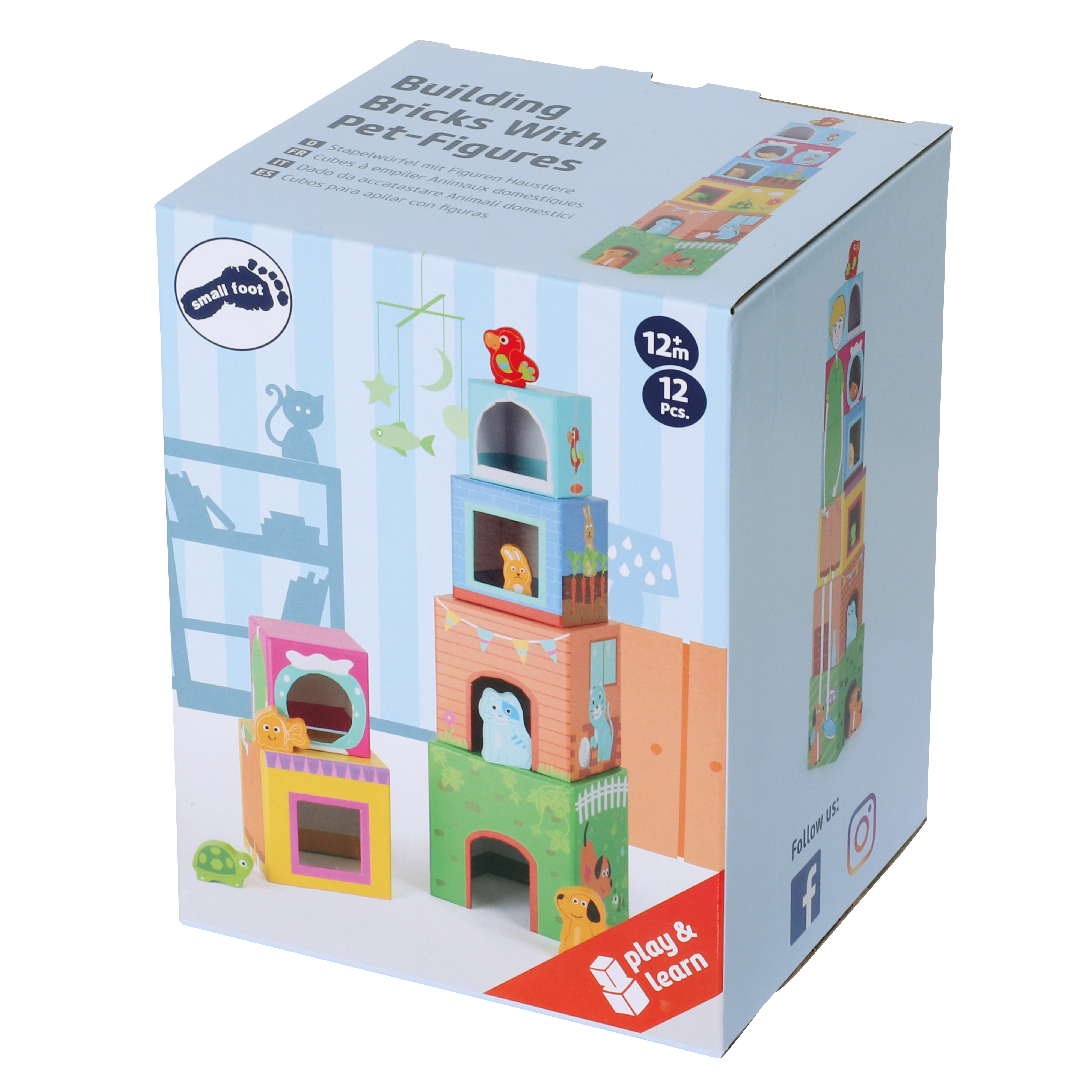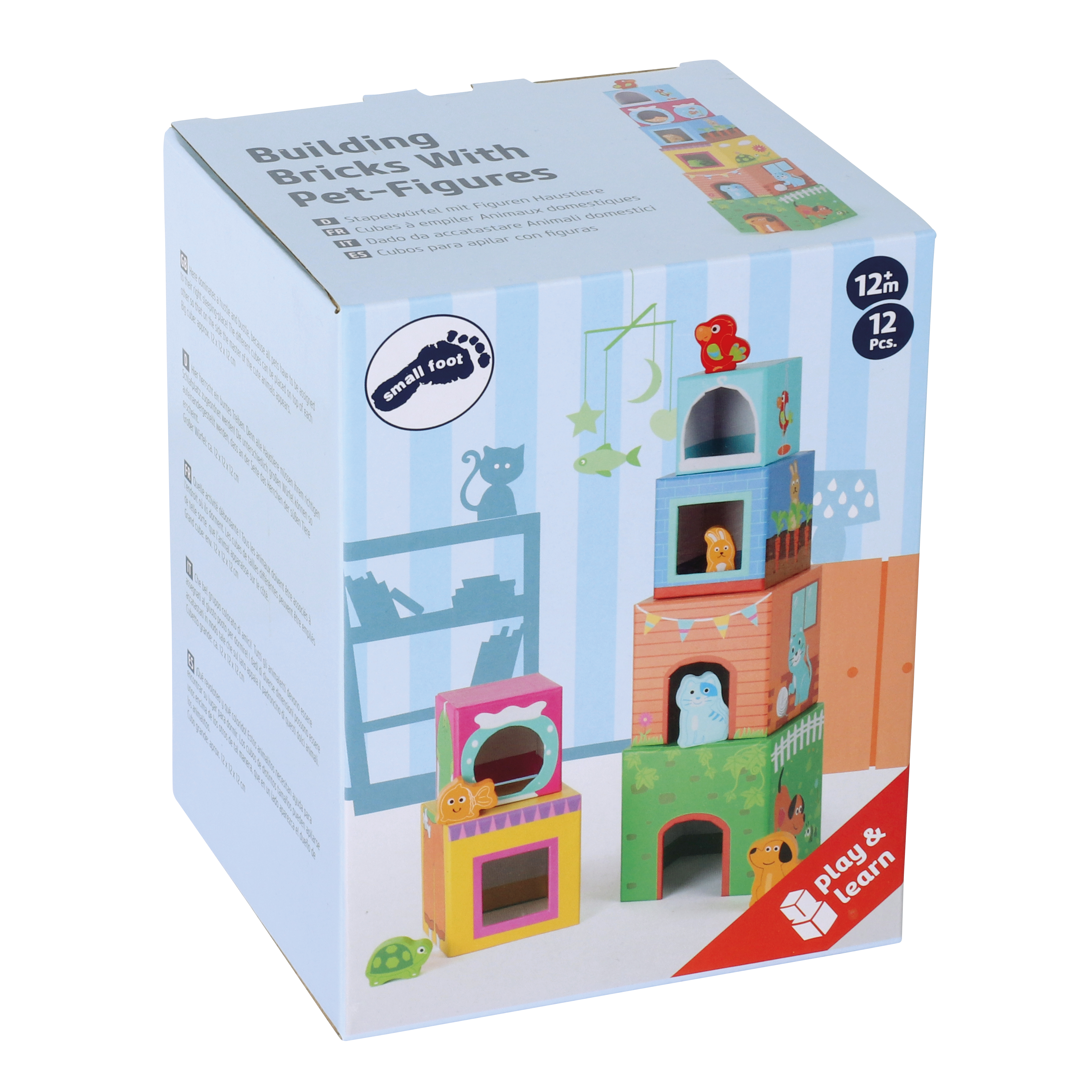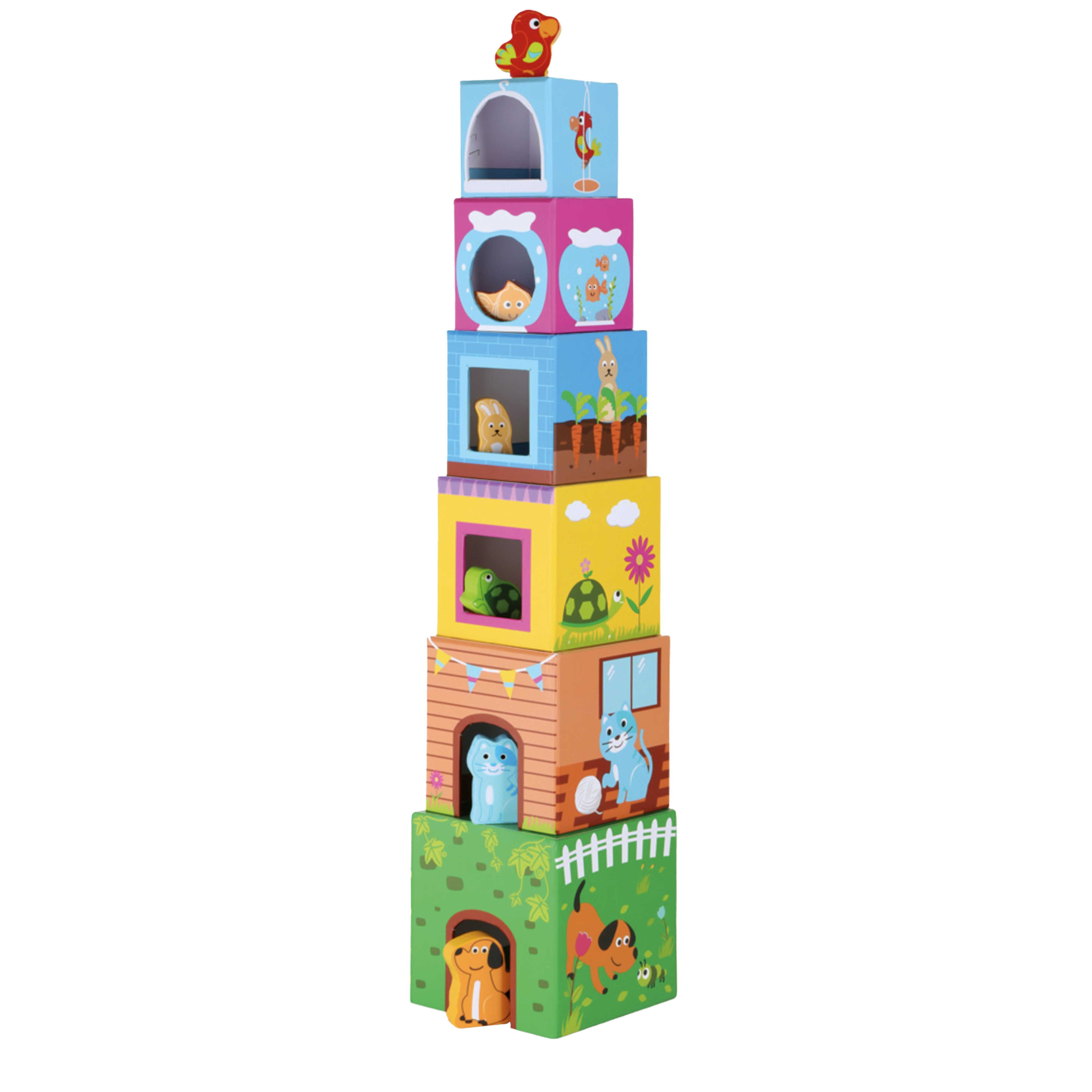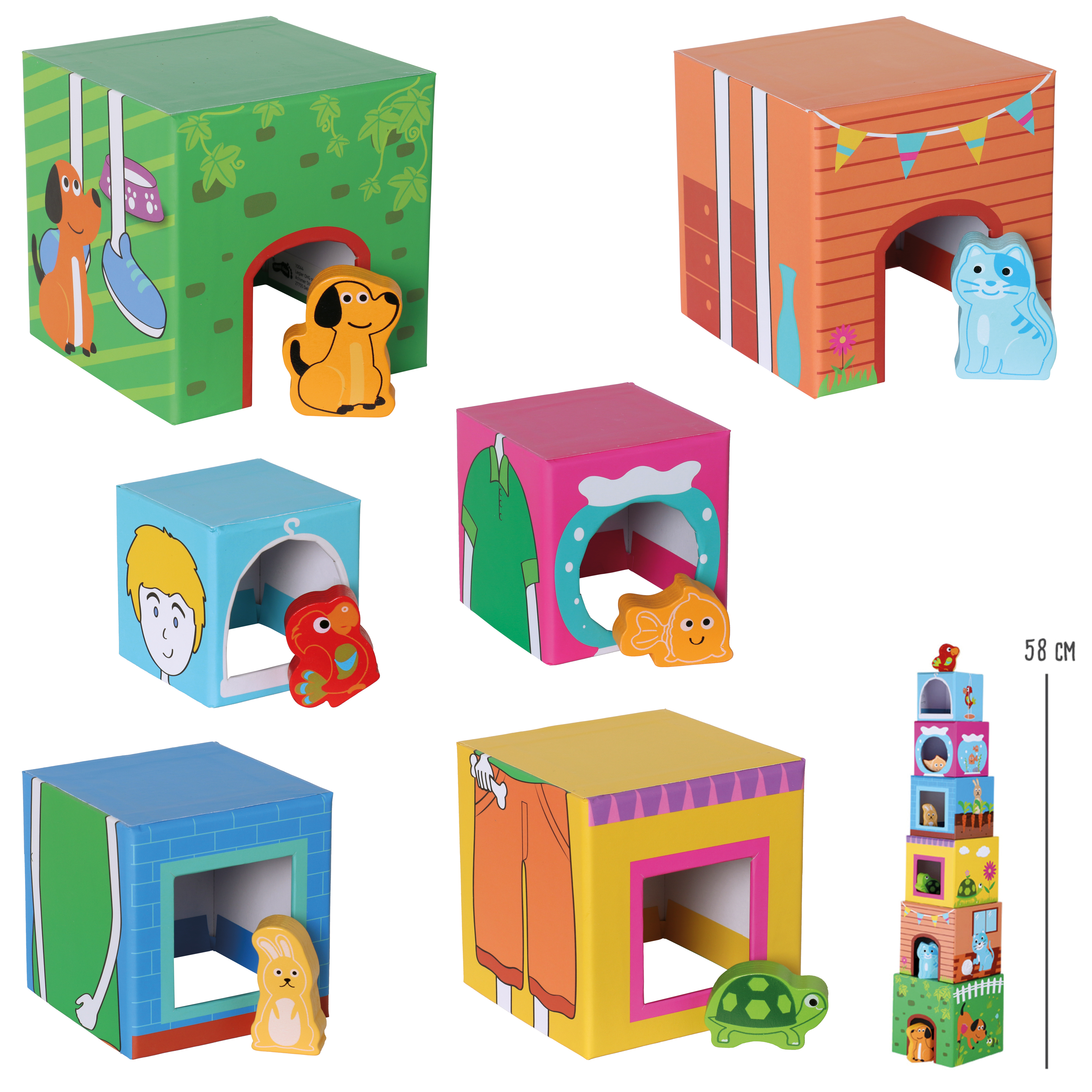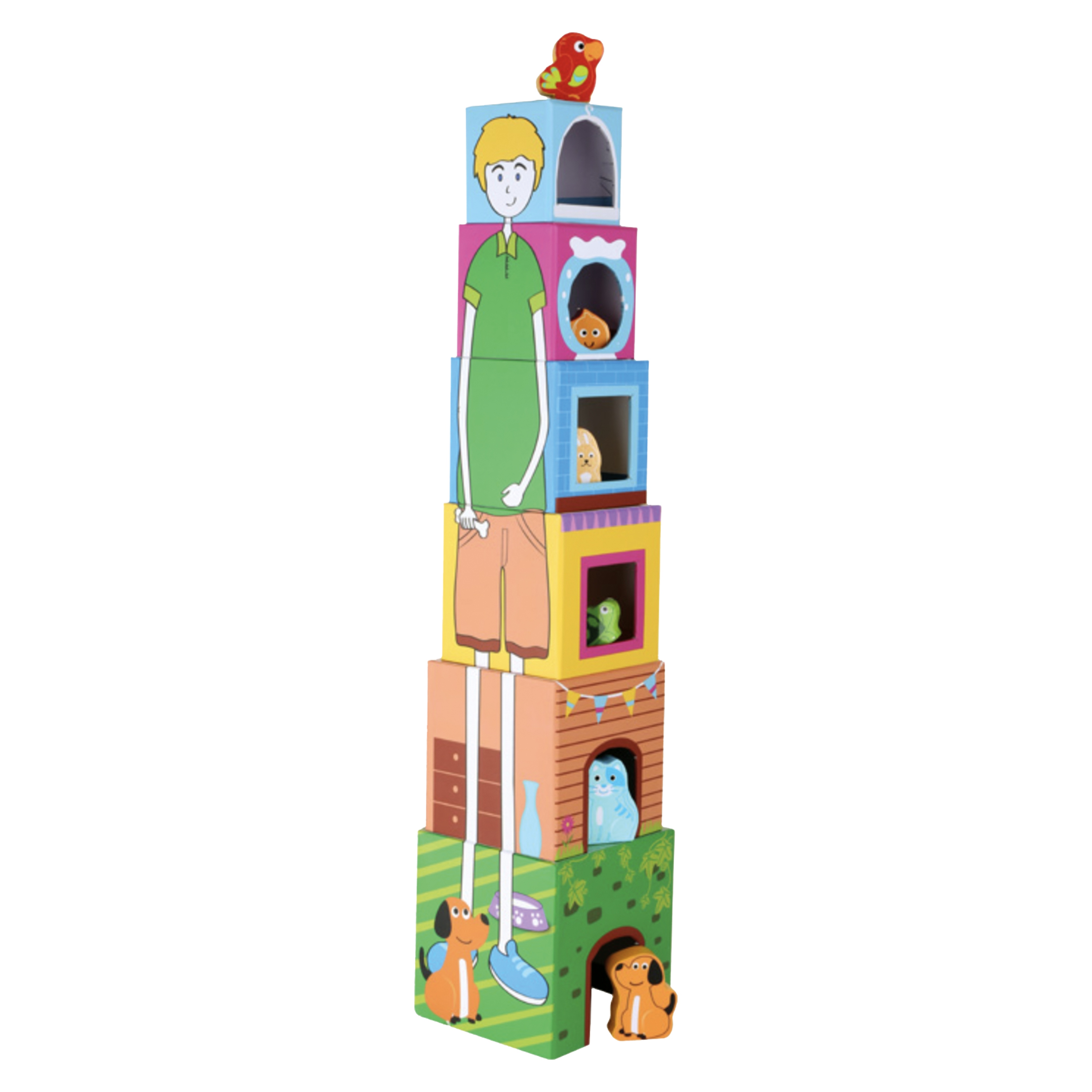 Hier herrscht ein buntes Treiben. Denn alle Haustiere müssen ihrem richtigen Schlafplatz zugeordnet werden! Die unterschiedlichen großen Würfel können so aufeinandergestellt werden, dass an der Seite das Herrchen der süßen Tiere erscheint. Hochstapler aufgepasst! Wer baut den höchsten Turm? In der richtigen Reihenfolge ergeben die Würfel aus stabiler Pappe verschiedene Motive. Alle Stapelwürfel haben eine Öffnung, in der sechs verschiedene Holztiere ihr Zuhause finden. Empfohlen für Kinder ab 12 Monaten.