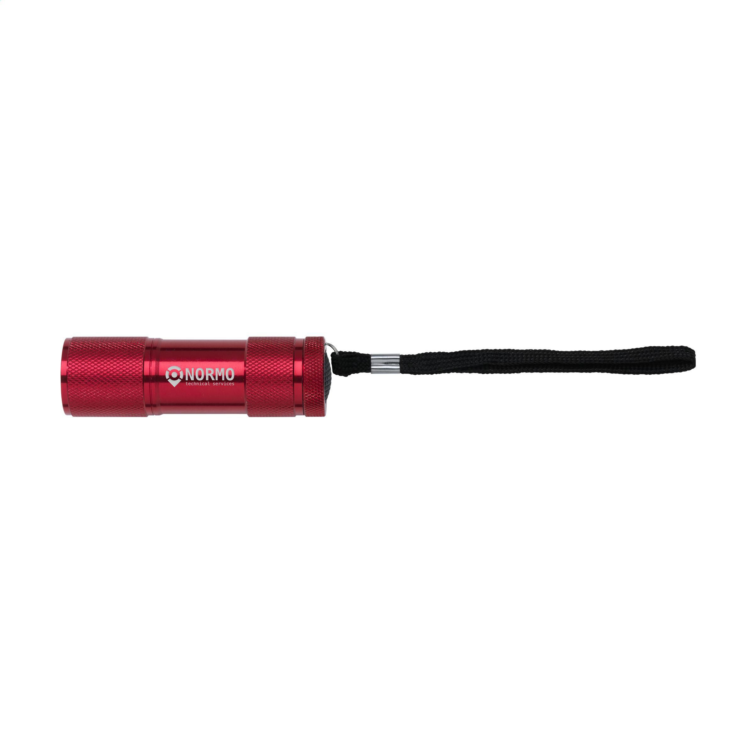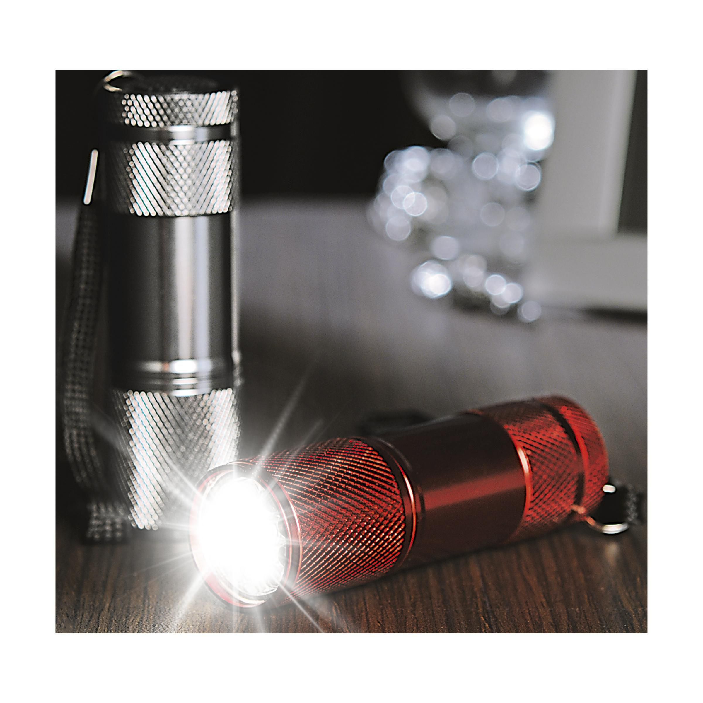 Aluminium-Stablampe mit 9 hellweißen, energiesparenden LED-Lampen und abnehmbarer Schlaufe. Maße: Ø 2,7 x 9 cm. Inkl. Batterien.