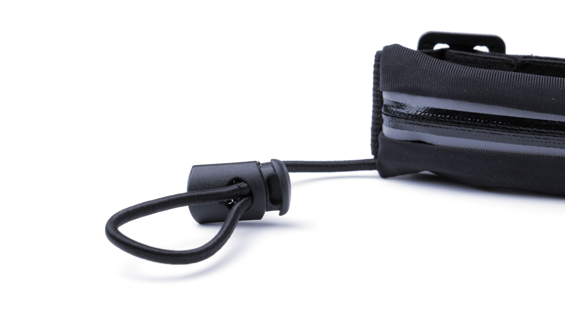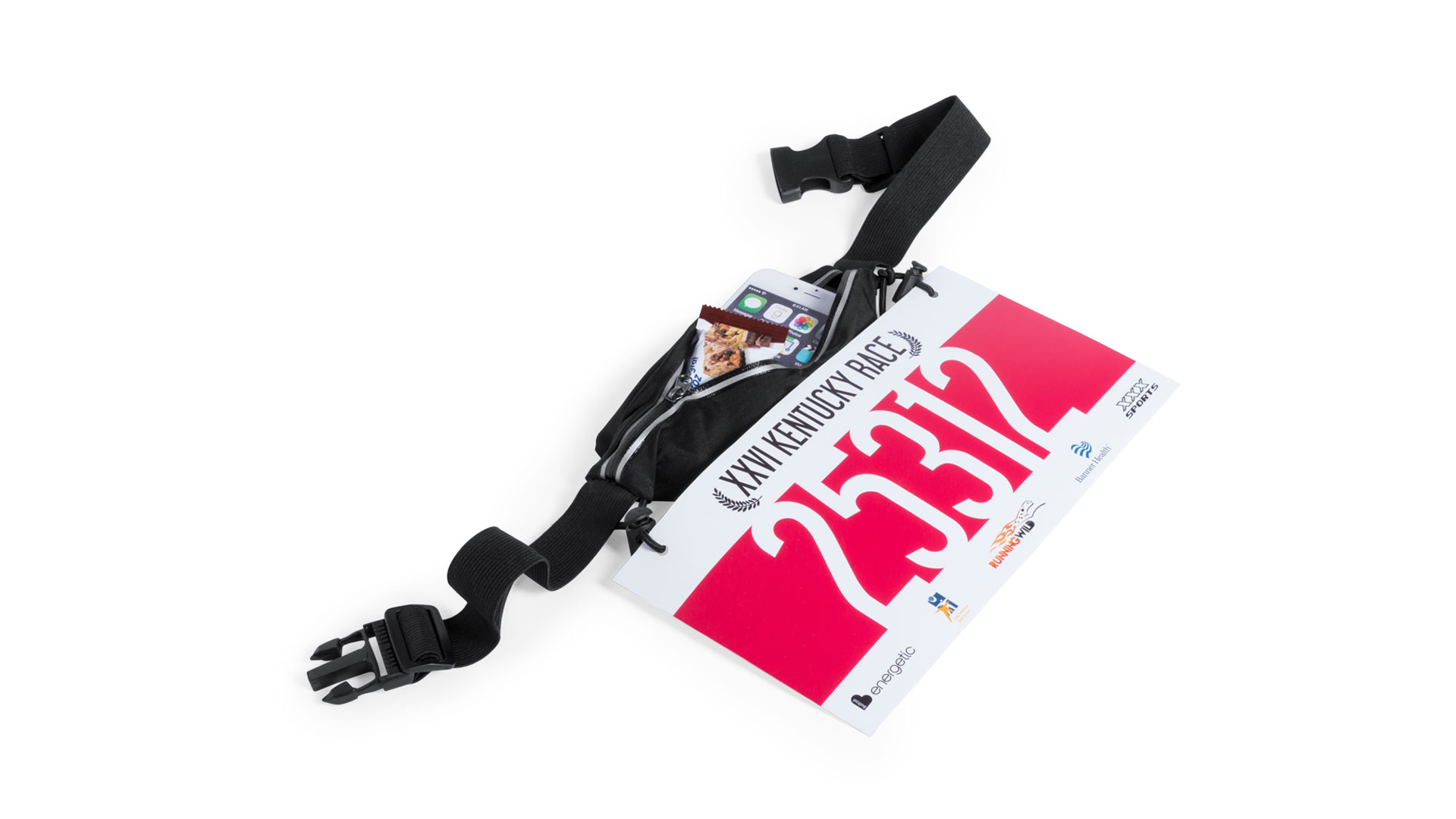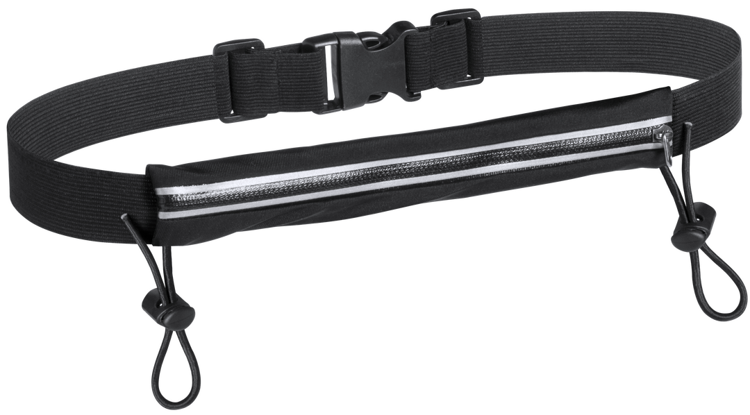 Hochwertige, spritzwasserresistente Gürteltasche mit speziellen Gummibändern zum Befestigen einer Startnummer. Hergestellt aus angenehm weichem Spandex-Material. Entwickelt für Sport- und Freizeitaktivitäten. Mit grauem Reißverschluss und Befestigungsgummis mit Stopper sowie verstellbarem, elastischem Gurt mit Schnallenverschluss.