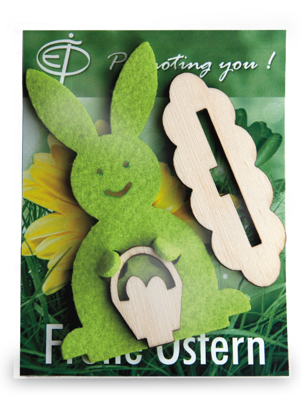 Die liebevoll gestaltete Steckfigur aus Holz und Filz macht Lust auf Frühling. Flach und in Einzelteilen wird der Hase mit einer komplett individuell gestalteten Werbekarte geliefert und eignet sich so optimal als Übergabeartikel oder Mailingverstärker. Auf dem Holz ist optional eine Lasergravur für das Firmenlogo möglich.