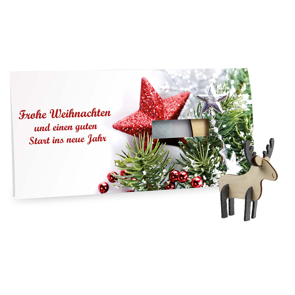 Zusammen basteln: Im Inneren der Karte liegen plano die Teile der jeweiligen Figur, die mit einfachen Handgriffen zusammengesteckt werden. Die Figuren bestehen aus Holz und Filz und sind als Elch, Baum, Stern, Engel, Weihnachtsmann, Schneemann, Schlitten, Kerze, Wichtel und als Wendelfilz Tannenbaum erhältlich. Die Karte wird komplett individuell gestaltet (ein- oder beidseitig) oder Sie greifen auf die Standardgestaltung zurück. DIN lang Umschläge sind optional lieferbar.