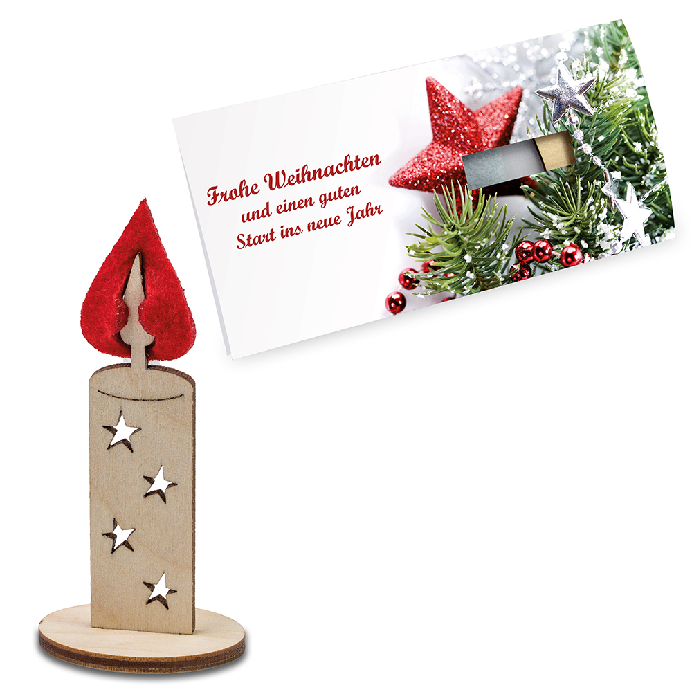 Zusammen basteln: Im Inneren der Karte liegen plano die Teile der jeweiligen Figur, die mit einfachen Handgriffen zusammengesteckt werden. Die Figuren bestehen aus Holz und Filz und sind als Elch, Baum, Stern, Engel, Weihnachtsmann, Schneemann, Schlitten, Kerze, Wichtel und als Wendelfilz Tannenbaum erhältlich. Die Karte wird komplett individuell gestaltet (ein- oder beidseitig) oder Sie greifen auf die Standardgestaltung zurück. DIN lang Umschläge sind optional lieferbar.