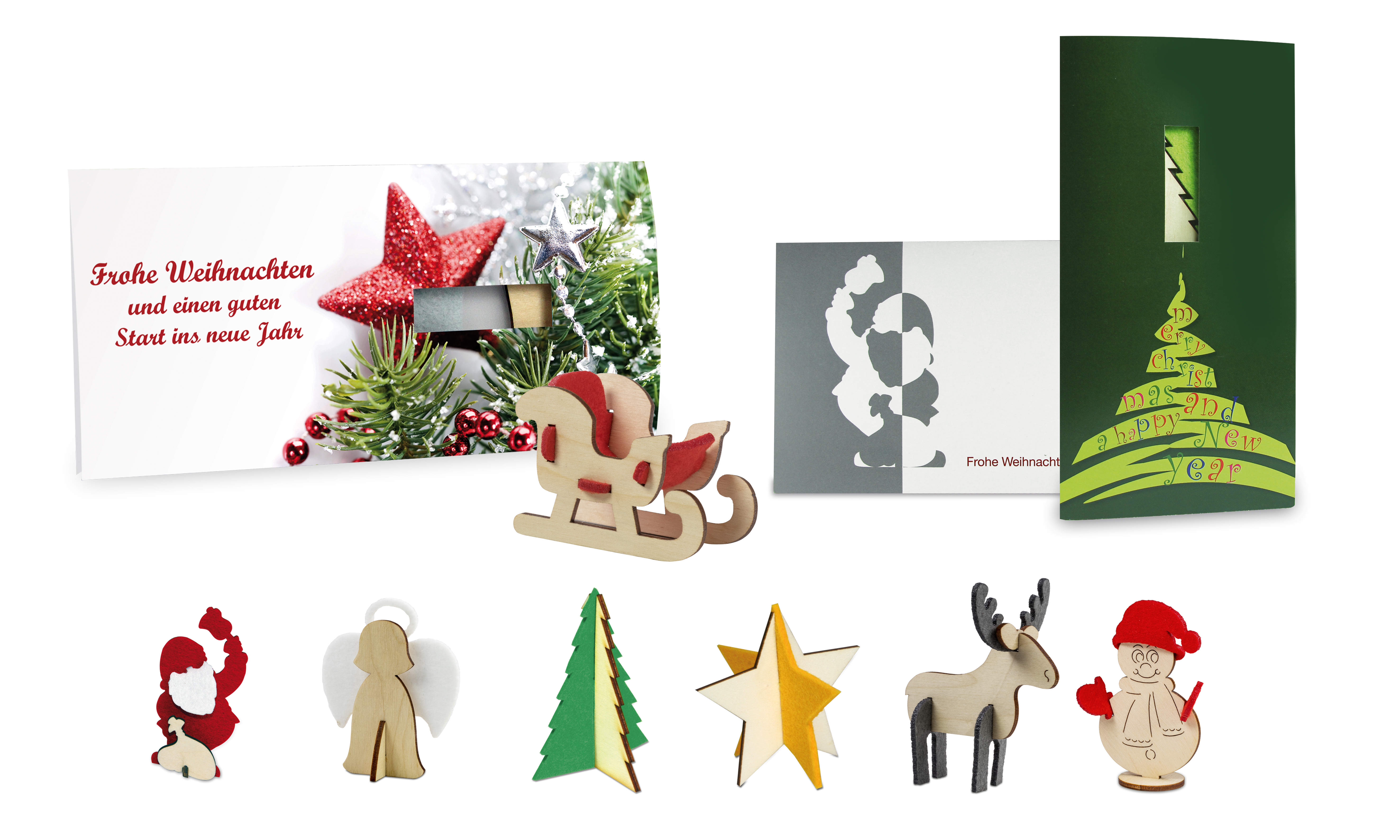Zusammen basteln: Im Inneren der Karte liegen plano die Teile der jeweiligen Figur, die mit einfachen Handgriffen zusammengesteckt werden. Die Figuren bestehen aus Holz und Filz und sind als Elch, Baum, Stern, Engel, Weihnachtsmann, Schneemann und Schlitten erhältlich. Die Karte wird komplett individuell gestaltet (ein- oder beidseitig) oder Sie greifen auf die Standardgestaltung zurück.