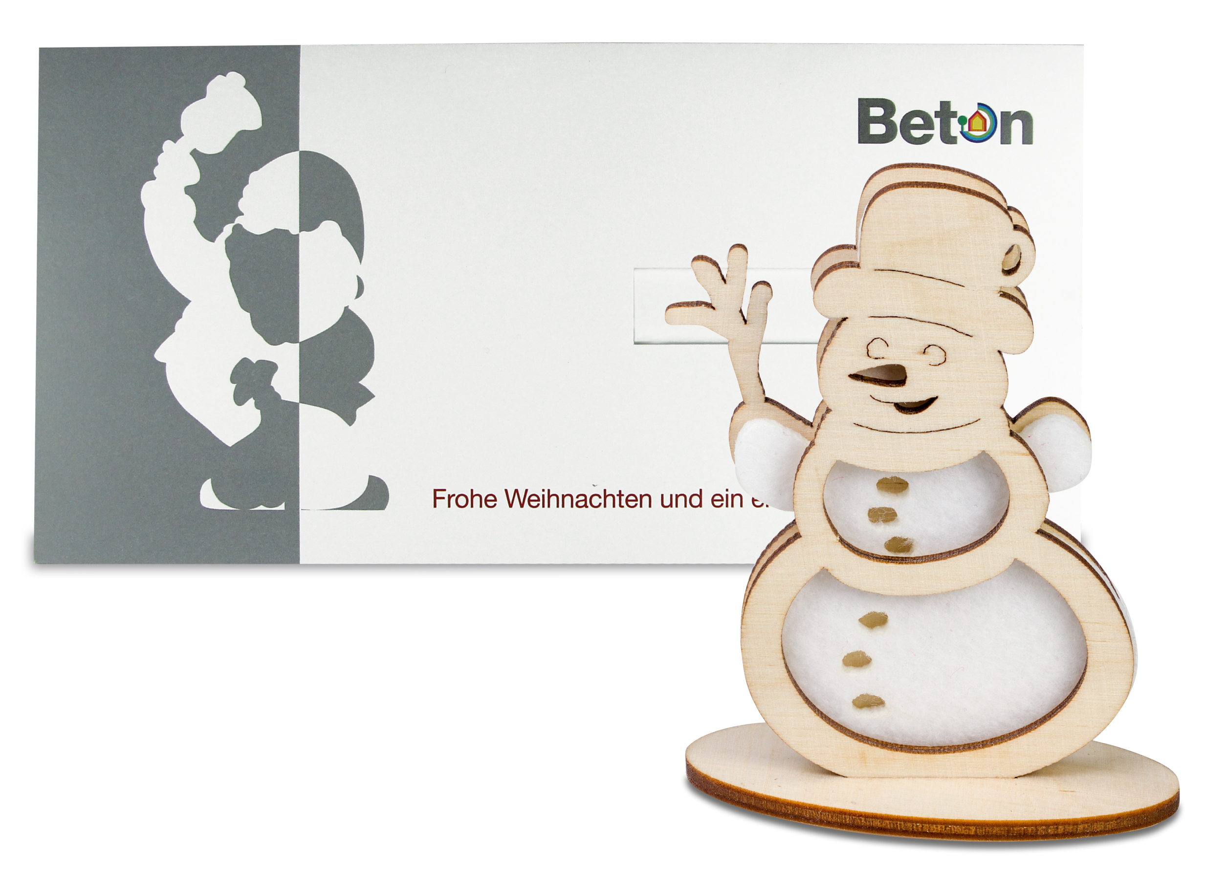 Die beliebten Holz-Filz Steckfiguren gibt es auch in einer Premium-Ausführung. Die dreilagigen Holz-Filz-Holz-Kombinationen, in den Versionen Tannenbaum, Engel und Schneemann, werden mit einem Holzfuß geliefert. So kann die weihnachtliche Steckfigur dekorativ aufgestellt werden oder den Adventskranz und Tannenbaum schmücken. Geliefert wird dieses hochwertige Schmuckstück flach auf einer Karte, die individuell mit Grußbotschaft und Logo (ein- oder beidseitig) bedruckt werden kann – ideal für die Grüße an Kunden zu Weihnachten. DIN lang Umschläge sind optional möglich.