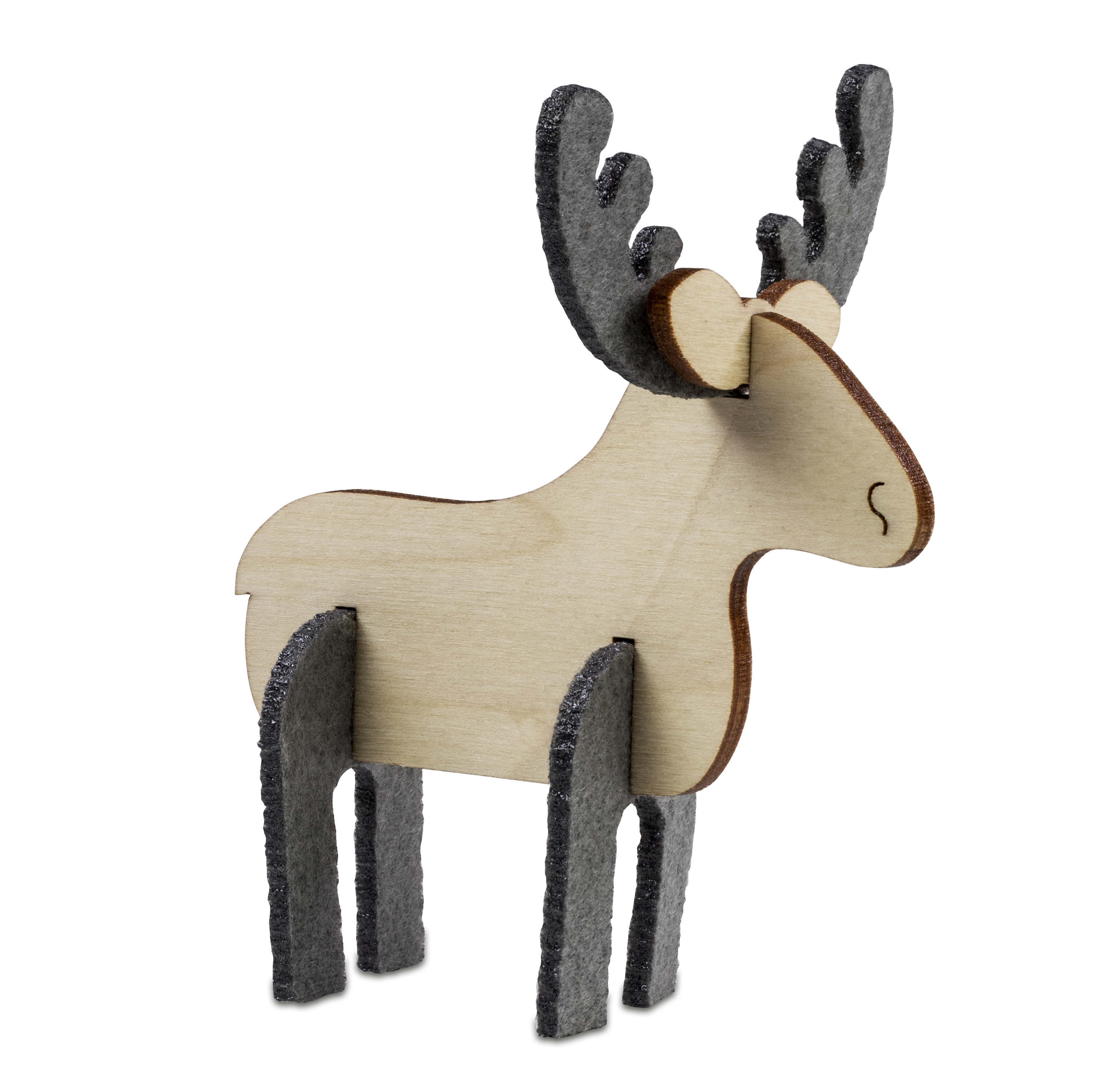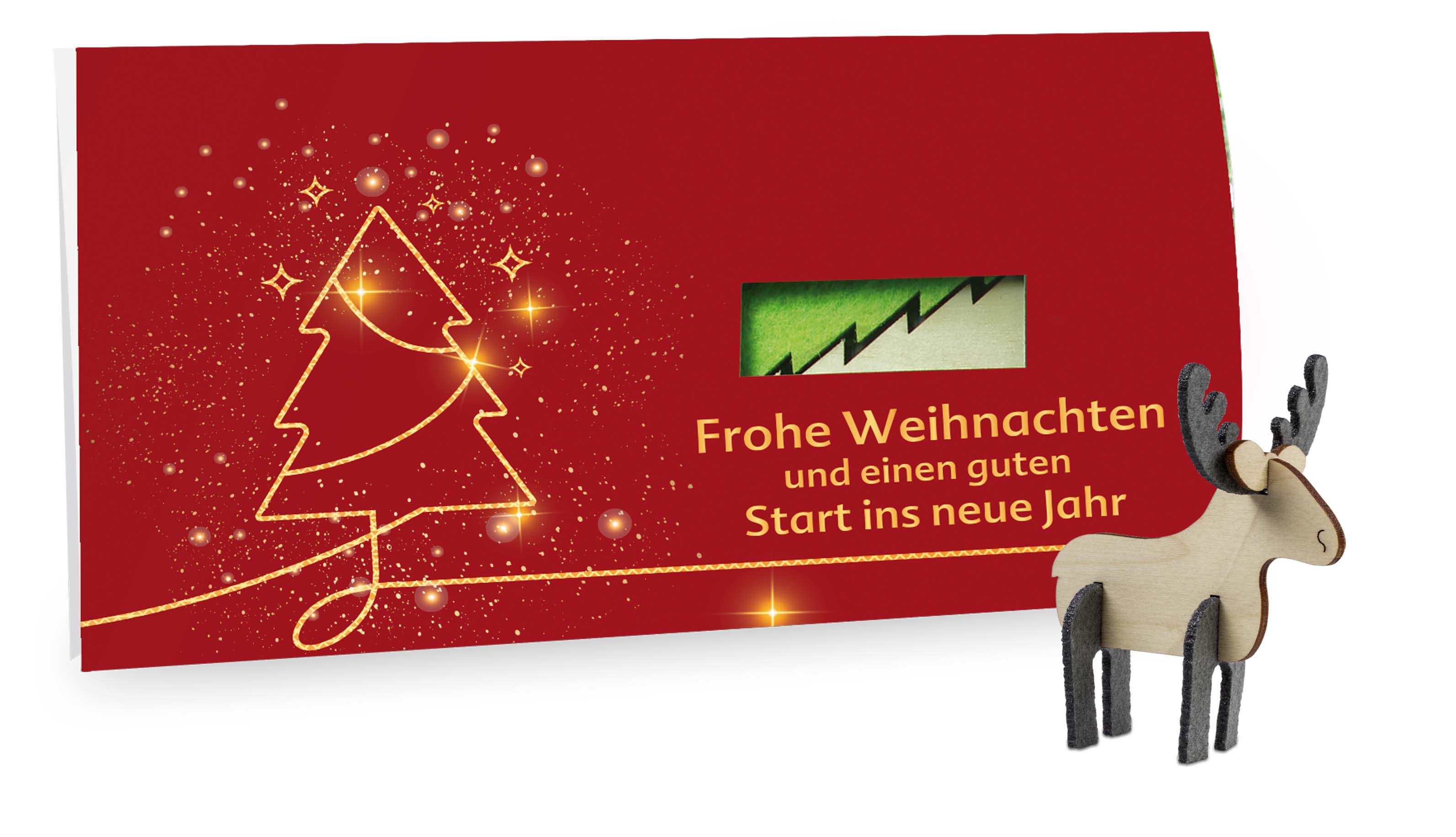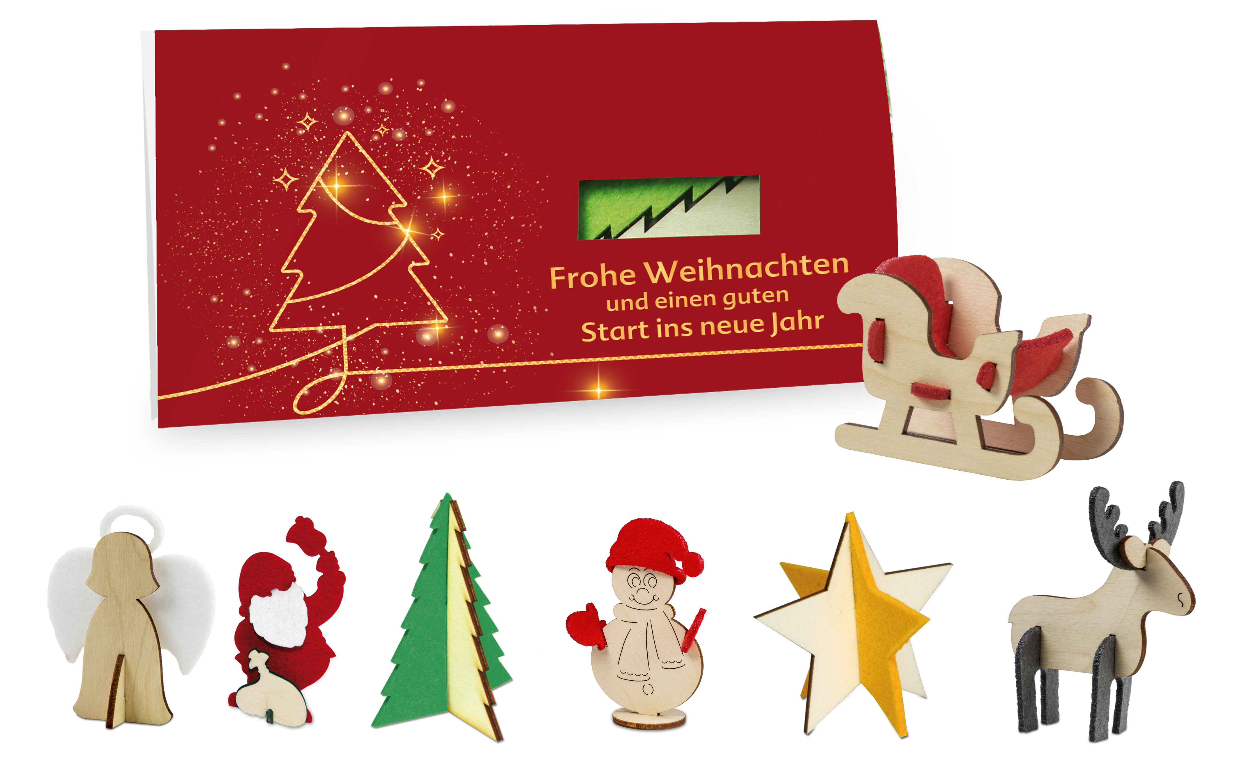 Zusammen basteln: Im Inneren der Karte liegen plano die Teile der jeweiligen Figur, die mit einfachen Handgriffen zusammengesteckt werden. Die Figuren bestehen aus Holz und Filz und sind als Elch, Baum, Stern, Engel, Weihnachtsmann, Wichtel, Kerze, Tannenbaum mit Wendelfilz, Schneemann und Schlitten erhältlich. Die Karte ist mit einer Standardgestaltung versehen. DIN lang Umschläge sind optional möglich.