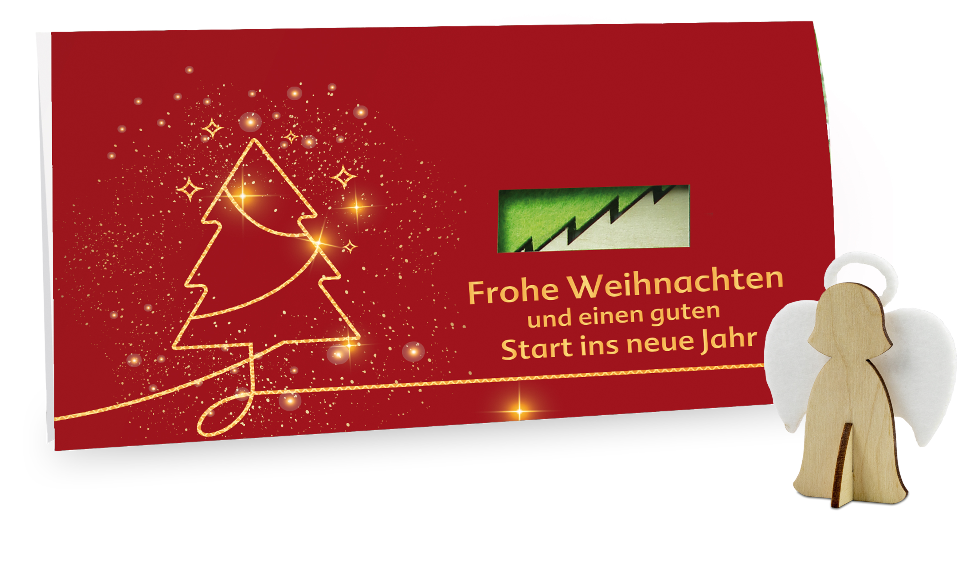 Zusammen basteln: Im Inneren der Karte liegen plano die Teile der jeweiligen Figur, die mit einfachen Handgriffen zusammengesteckt werden. Die Figuren bestehen aus Holz und Filz und sind als Elch, Baum, Stern, Engel, Weihnachtsmann, Wichtel, Kerze, Tannenbaum mit Wendelfilz, Schneemann und Schlitten erhältlich. Die Karte ist mit einer Standardgestaltung versehen. DIN lang Umschläge sind optional möglich.