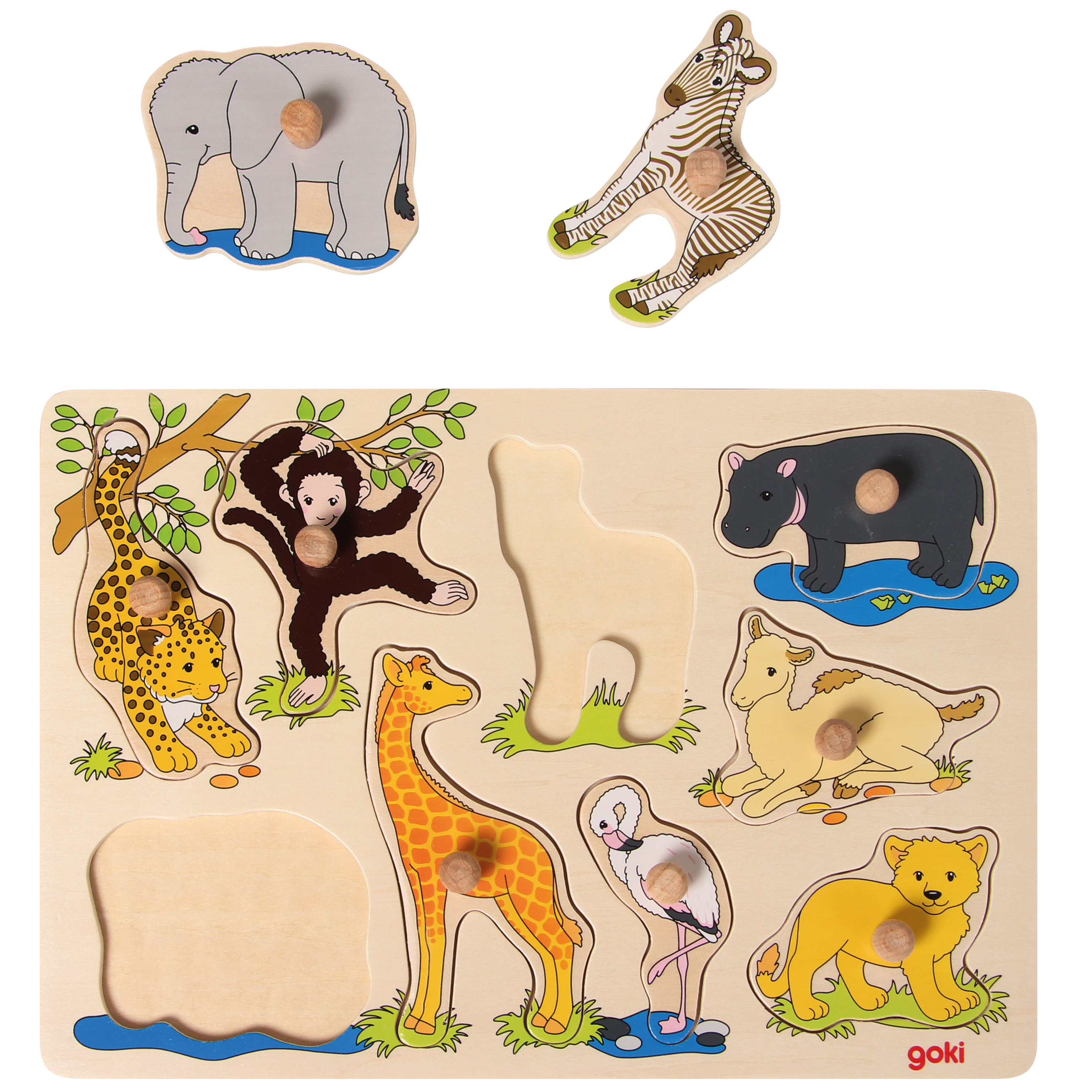Süßes Holzpuzzle für die Jüngsten. Beim Spiel lernen sie die Tiere Afrikas kennen. Jedes Puzzleteil hat einen praktischen Halteknopf. Ab 2 Jahren.
